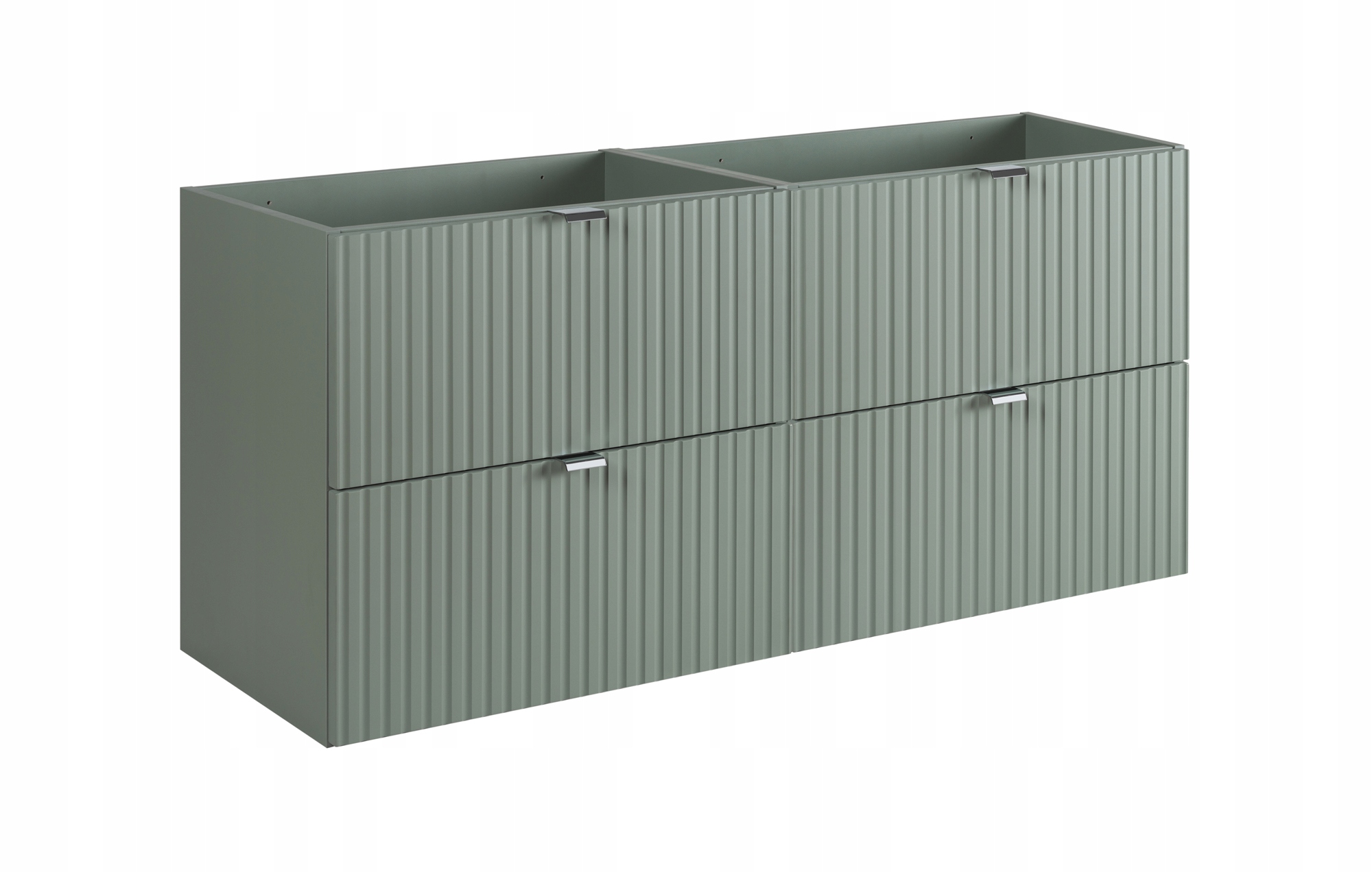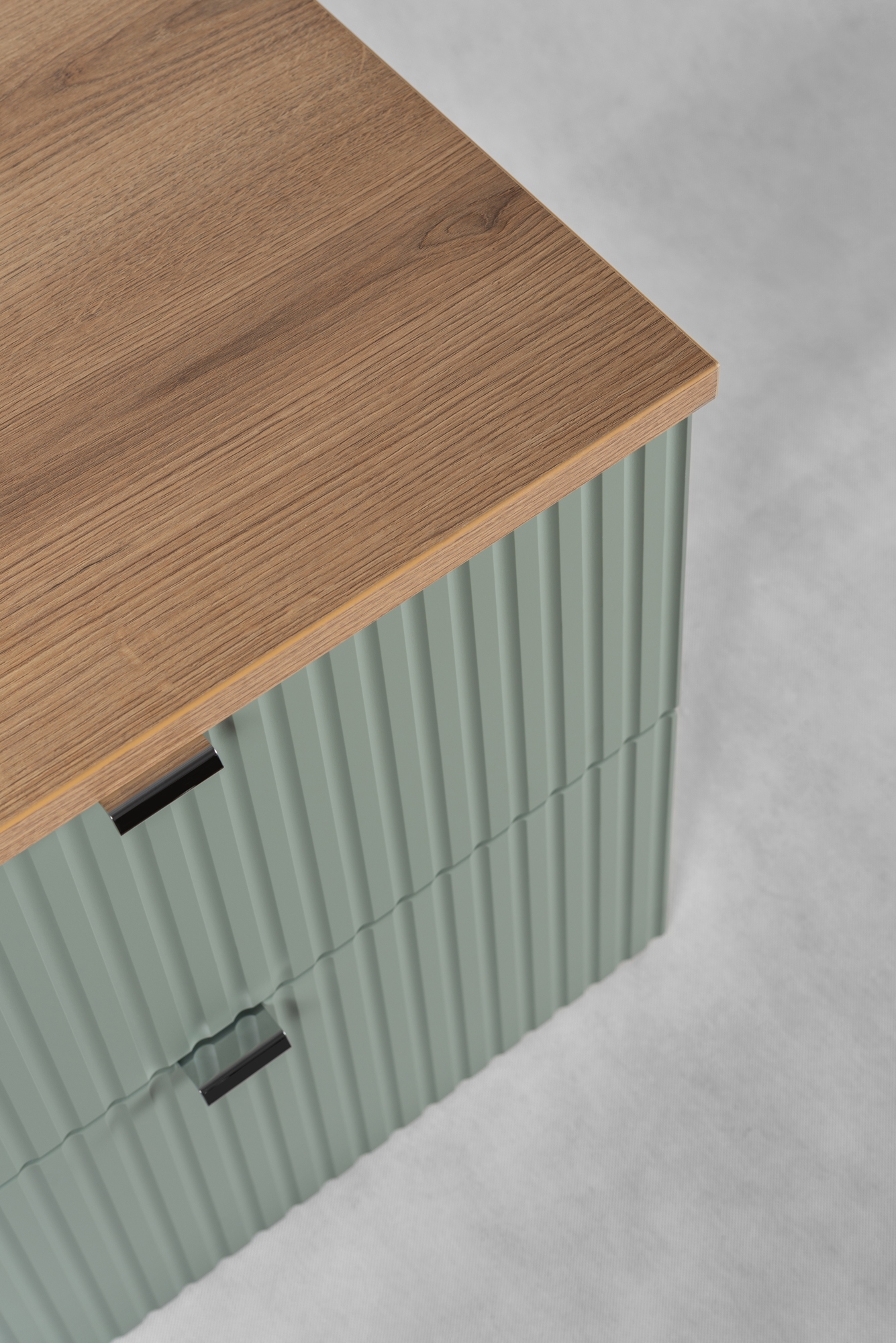 Zielona Szafka pod Umywalkę 120 cm to elegancki i przestronny element łazienkowy, który łączy w sobie nowoczesny design z funkcjonalnością. Charakteryzuje się ryflowanymi frontami w odcieniu szałwiowym oraz blatem w ciepłym kolorze dębu, co nadaje jej niepowtarzalny styl i klasę.