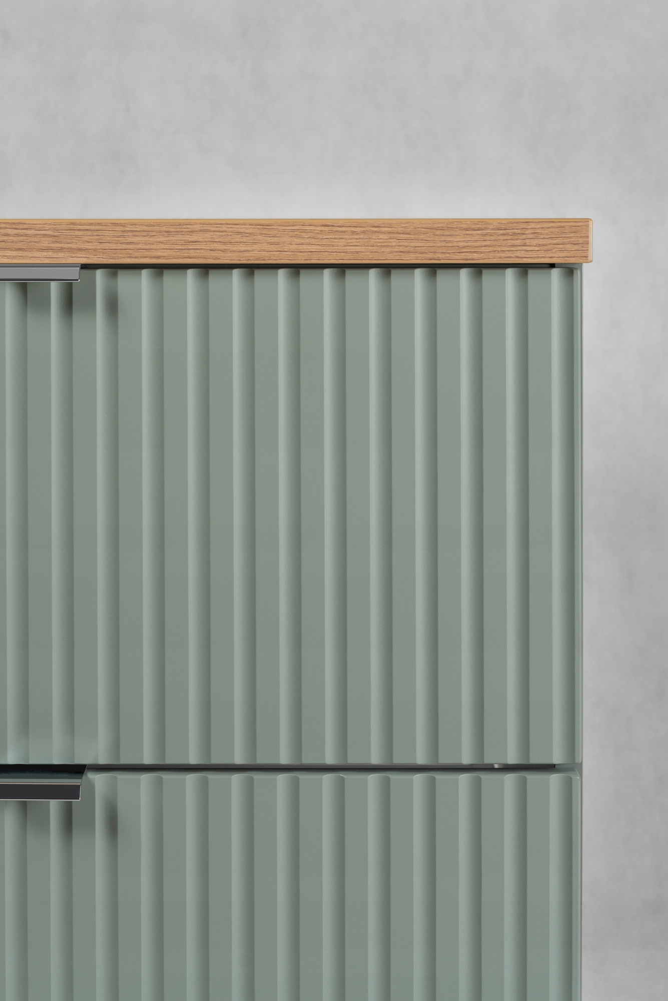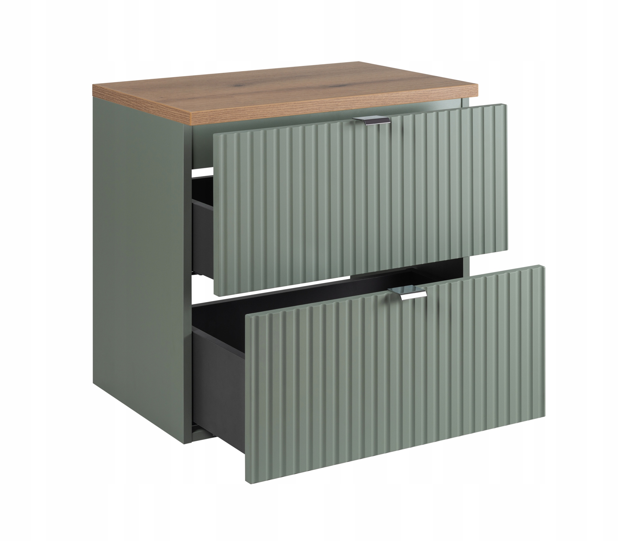Zielona Szafka pod Umywalkę 60 cm to elegancki i przestronny element łazienkowy, który łączy w sobie nowoczesny design z funkcjonalnością. Charakteryzuje się ryflowanymi frontami w odcieniu szałwiowym oraz blatem w ciepłym kolorze dębu, co nadaje jej niepowtarzalny styl i klasę.
