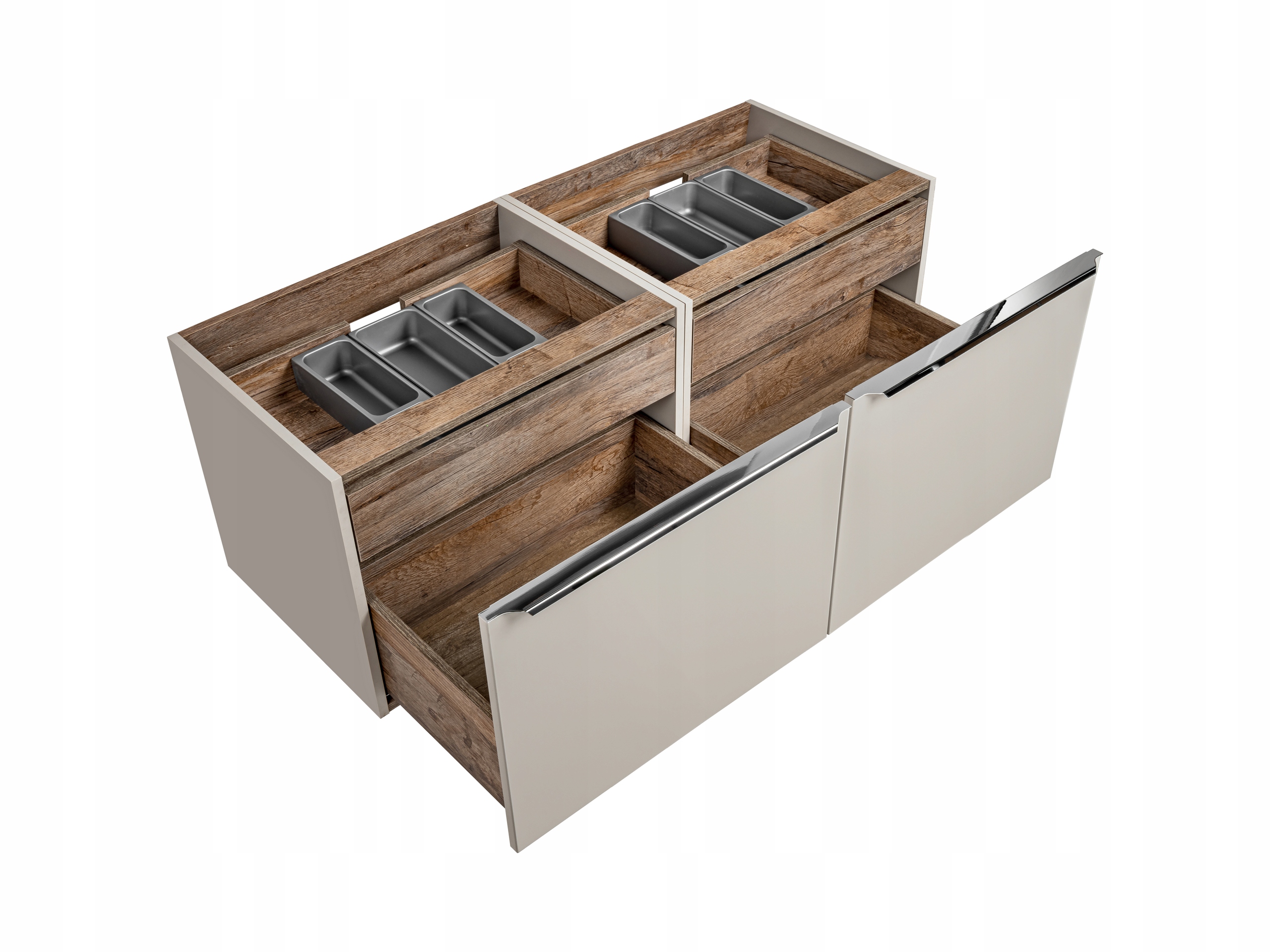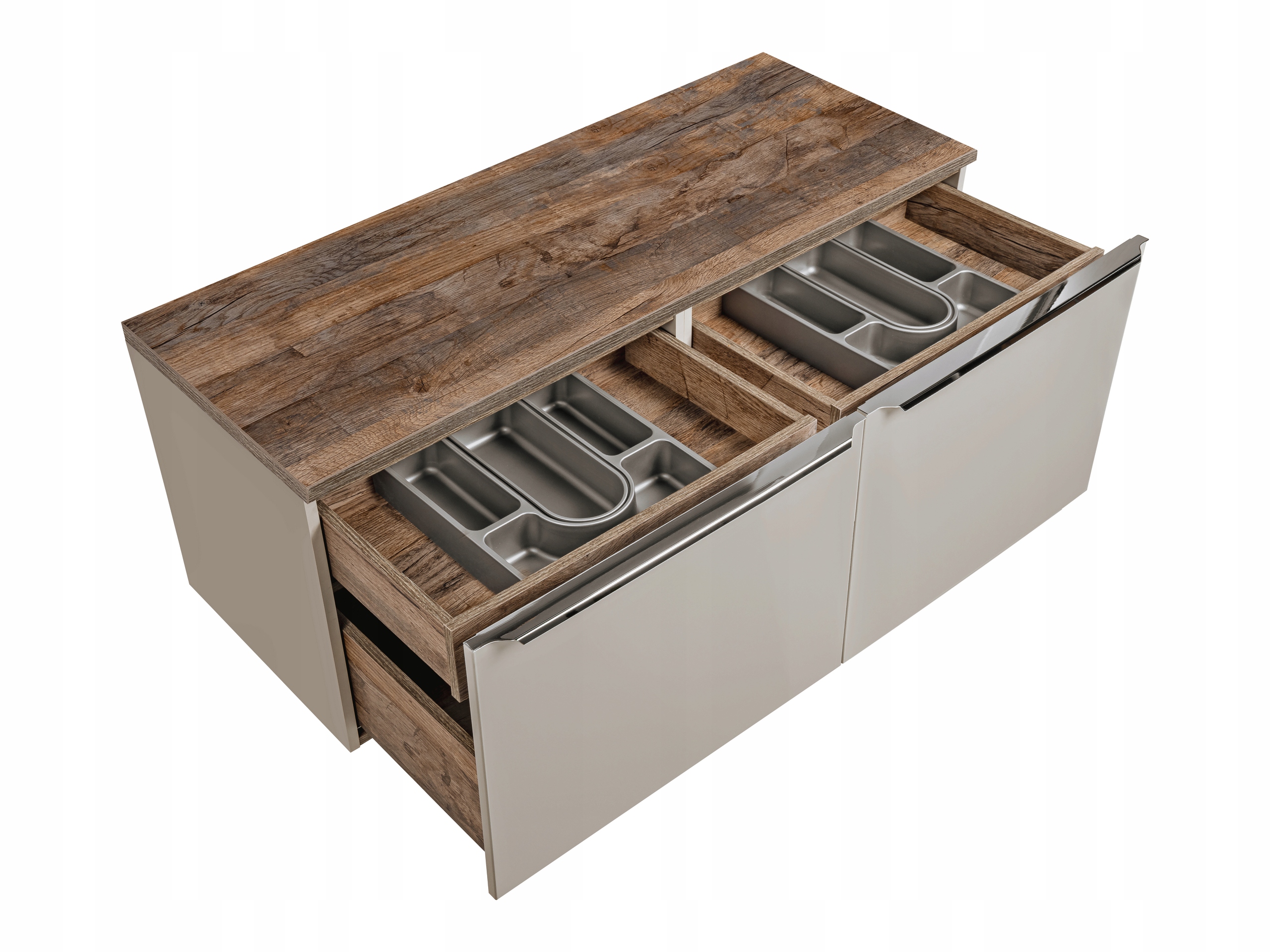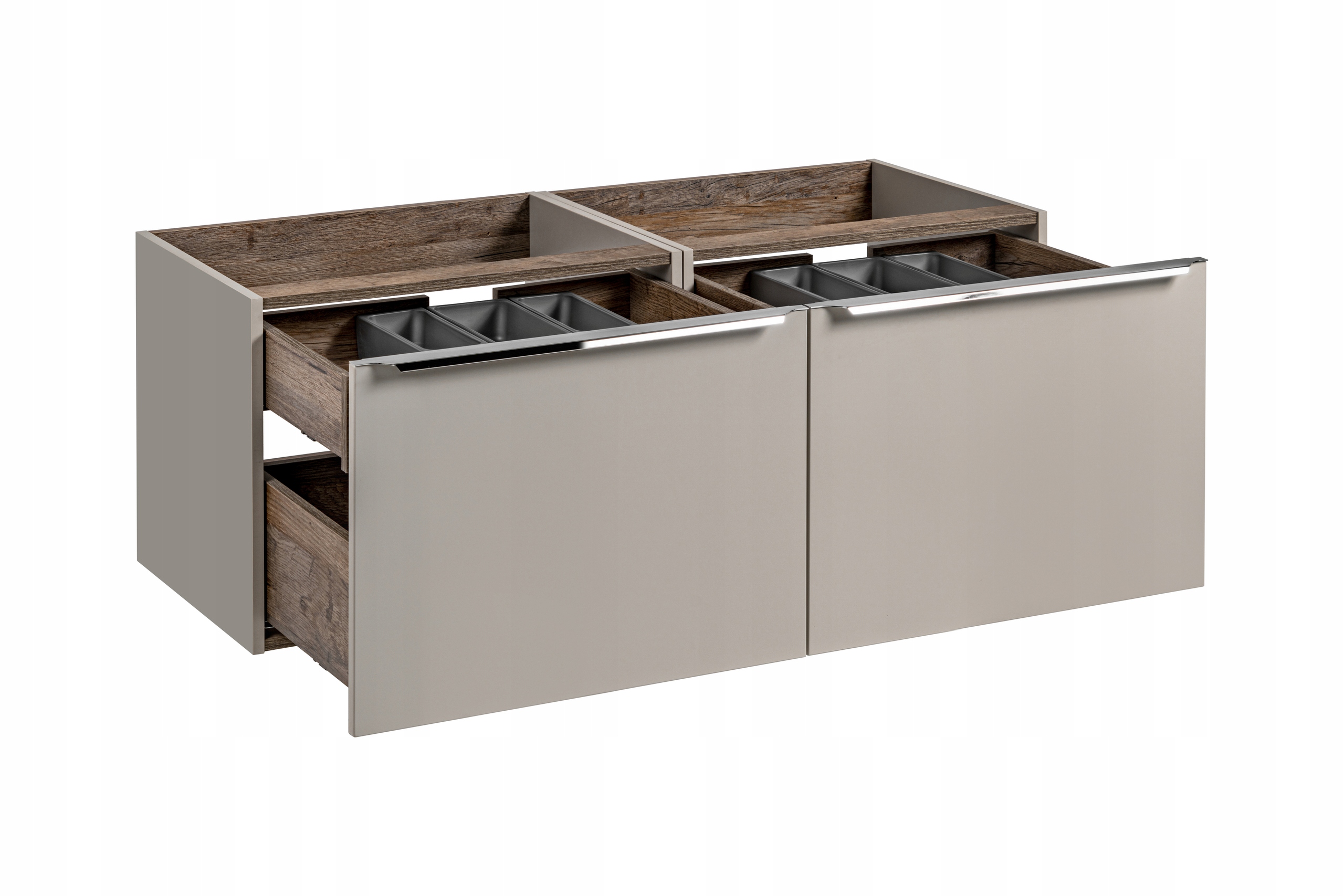 Elegancki zestaw łazienkowy z kolekcji SANTA FE TAUPE idealnie sprawdzi się w nowoczesnych wnętrzach. Dwie szafki o szerokości 60 cm każda z chromowanymi uchwytami, w klasycznym odcieniu taupe, harmonijnie komponują się z szerokim blatem Santa Fe Oak o długości 120,4 cm. Dzięki przemyślanemu designowi, zestaw ten oferuje praktyczną przestrzeń do przechowywania, a cichy domyk szuflad zapewnia wygodę użytkowania. Dodatkowy organizer w szufladzie pozwala na uporządkowanie najpotrzebniejszych akcesoriów łazienkowych, tworząc przestrzeń funkcjonalną i estetyczną zarazem.