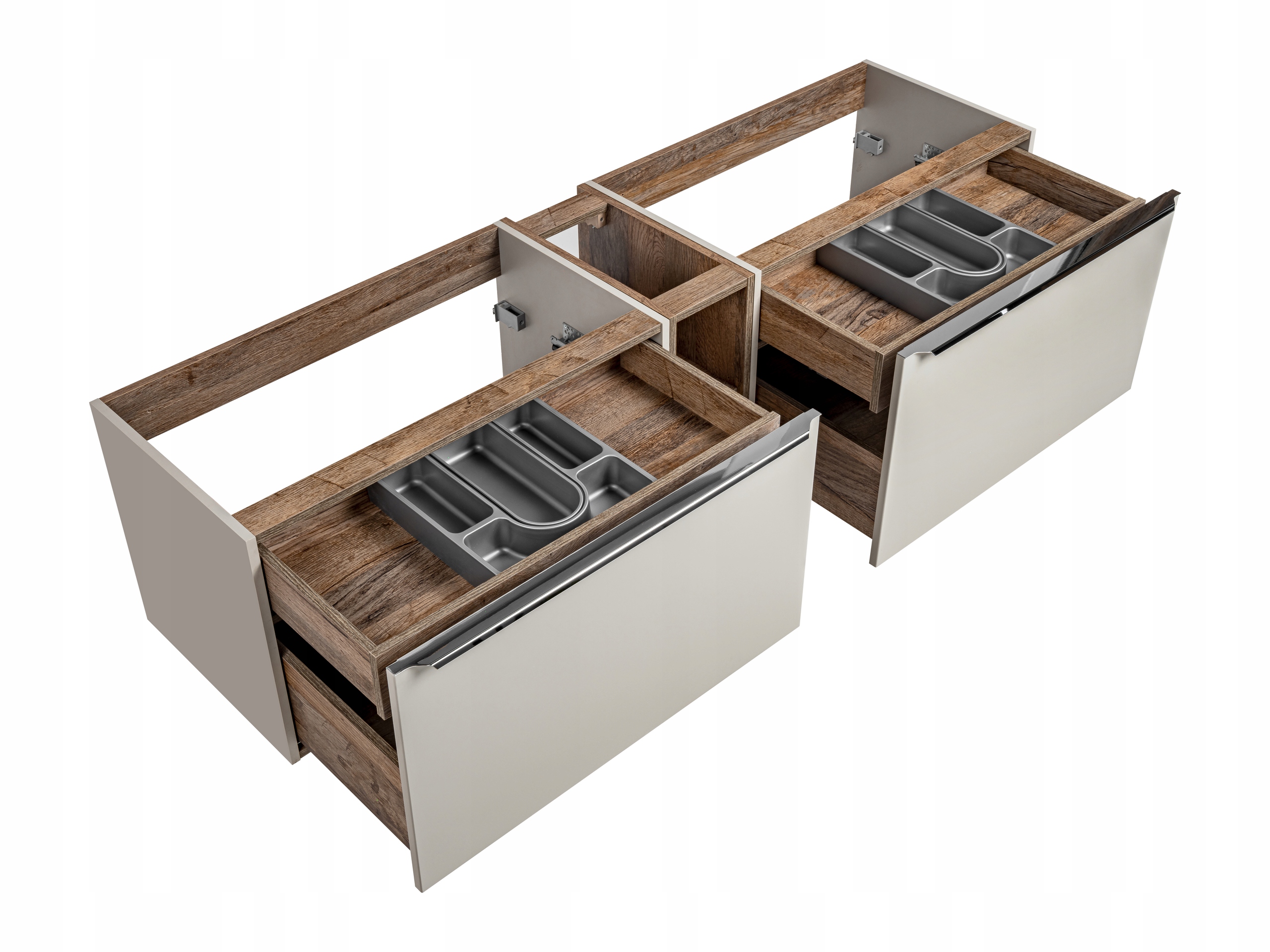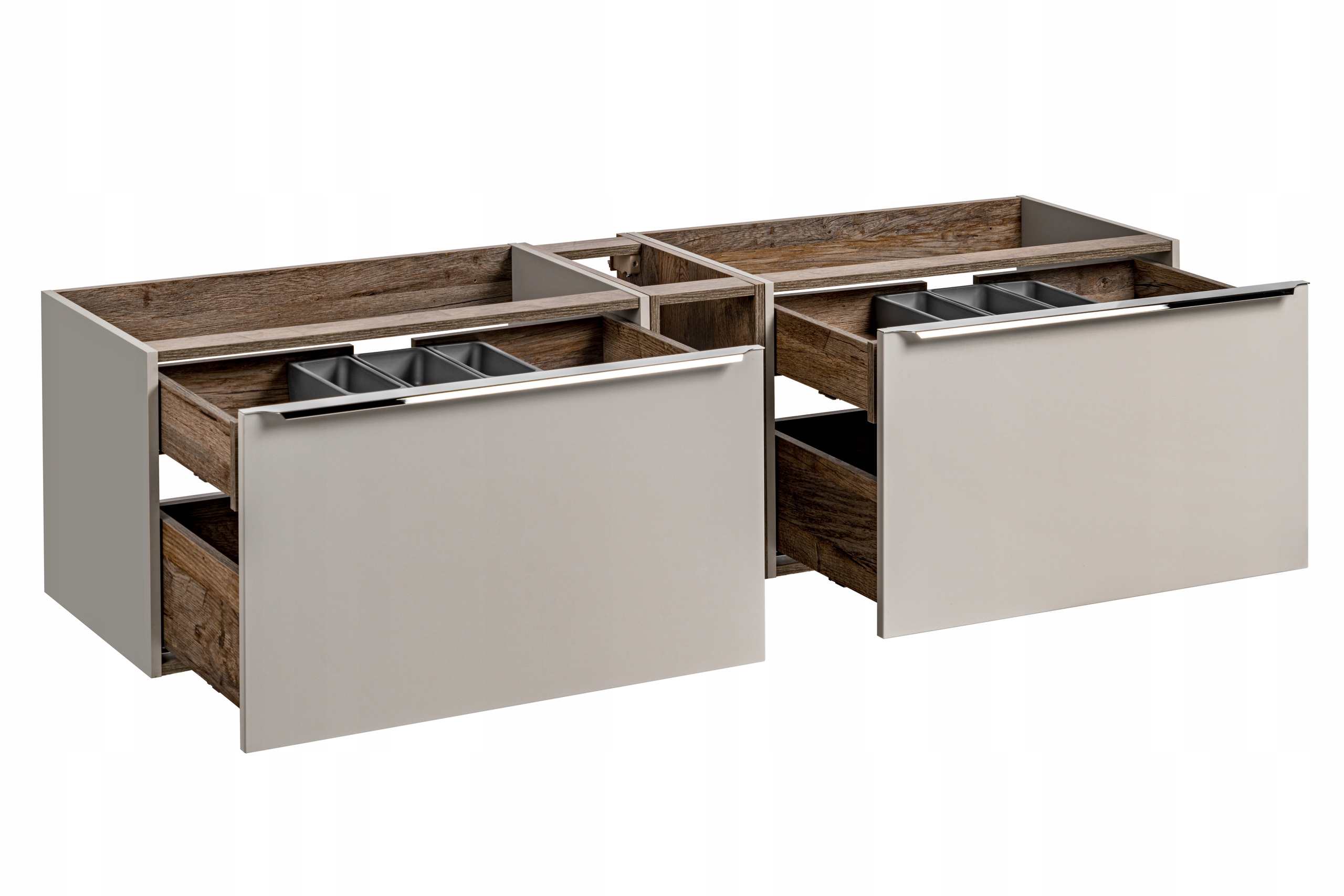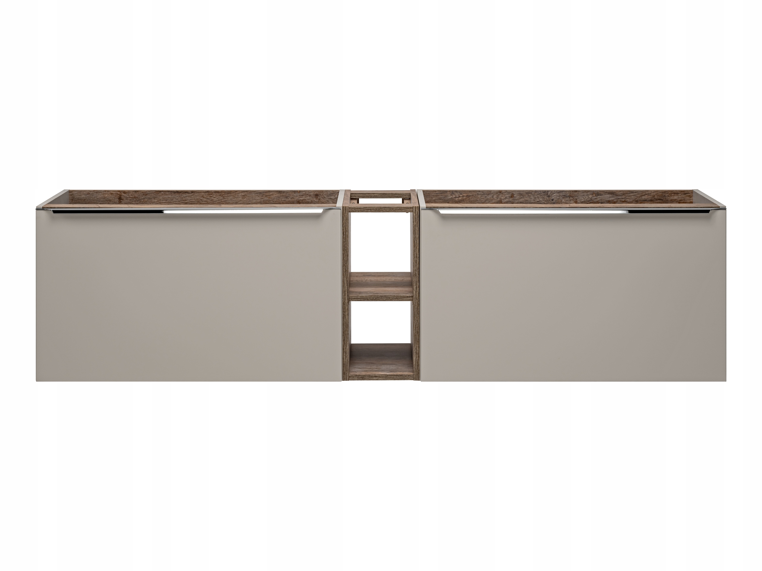Opis: Zestaw łazienkowy z kolekcji SANTA FE TAUPE o szerokości 180 cm, dedykowany pod umywalki nablatowe, łączy nowoczesny styl z funkcjonalnością. W skład zestawu wchodzą dwie szafki pod umywalkę oraz elegancki regał w wykończeniu Santa Fe Oak. Chromowane uchwyty oraz funkcja cichego domyku zapewniają komfort użytkowania i stylowy wygląd. Organizery do szuflad zwiększają funkcjonalność, oferując dodatkową przestrzeń na akcesoria.