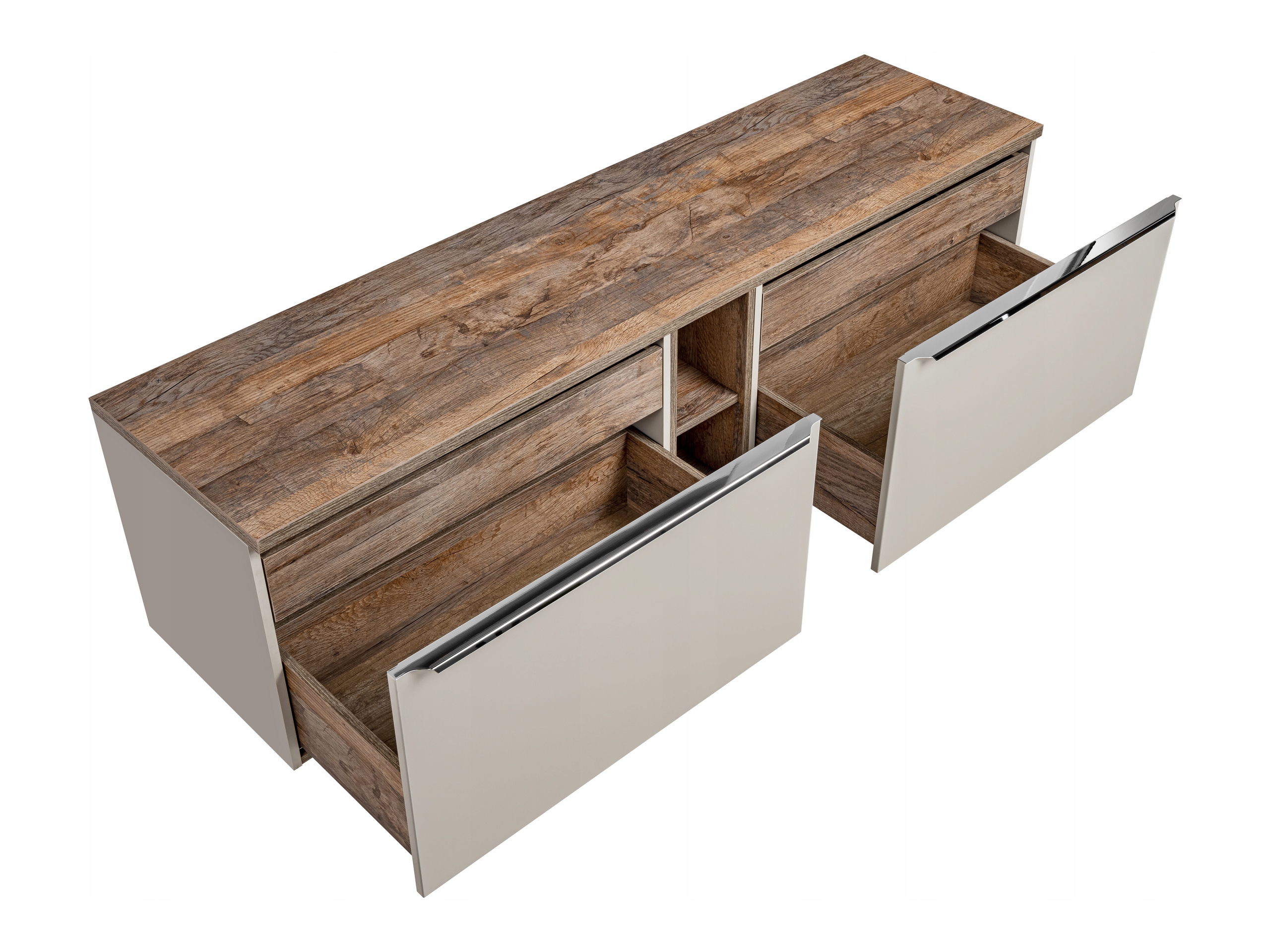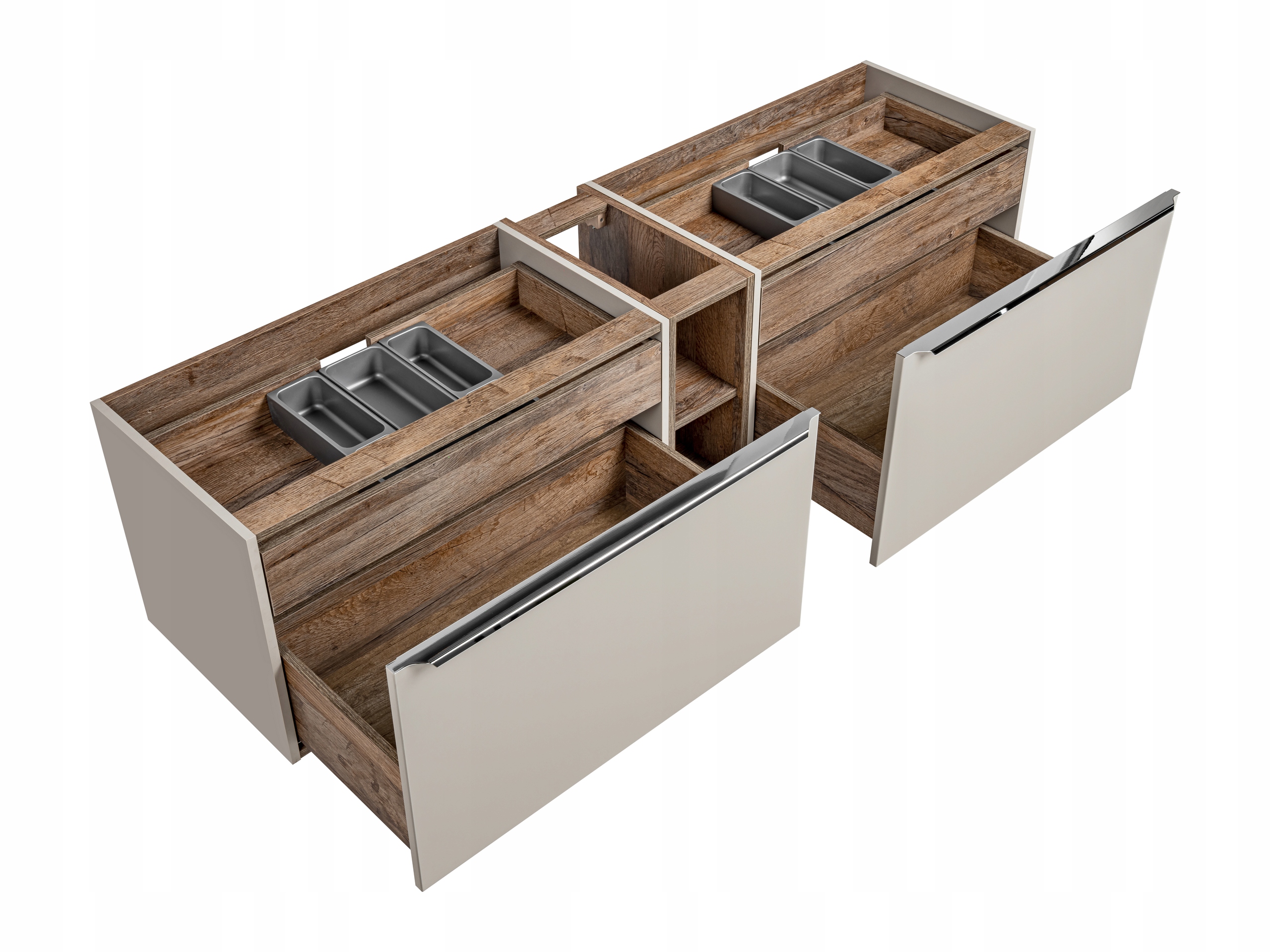 Zestaw łazienkowy SANTA FE TAUPE o szerokości 180 cm to elegancka propozycja, która doskonale sprawdzi się w nowoczesnych wnętrzach. Fronty i korpusy w odcieniu Taupe, wzbogacone chromowanymi uchwytami, wnoszą do łazienki lekkość i elegancję. W zestawie znajdują się dwie szafki pod umywalki, regał oraz szeroki blat, idealnie komponujące się z umywalkami nablatowymi. Każda szafka wyposażona jest w przestronne szuflady oraz wewnętrzne szuflady z organizerem, które umożliwiają wygodną organizację i przechowywanie. Zastosowane funkcje cichego domyku oraz montaż wiszący gwarantują komfort użytkowania i nowoczesny wygląd.