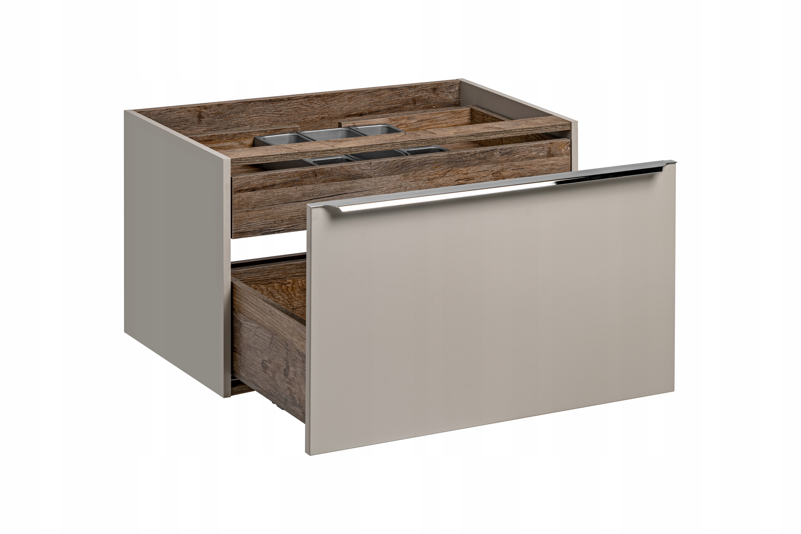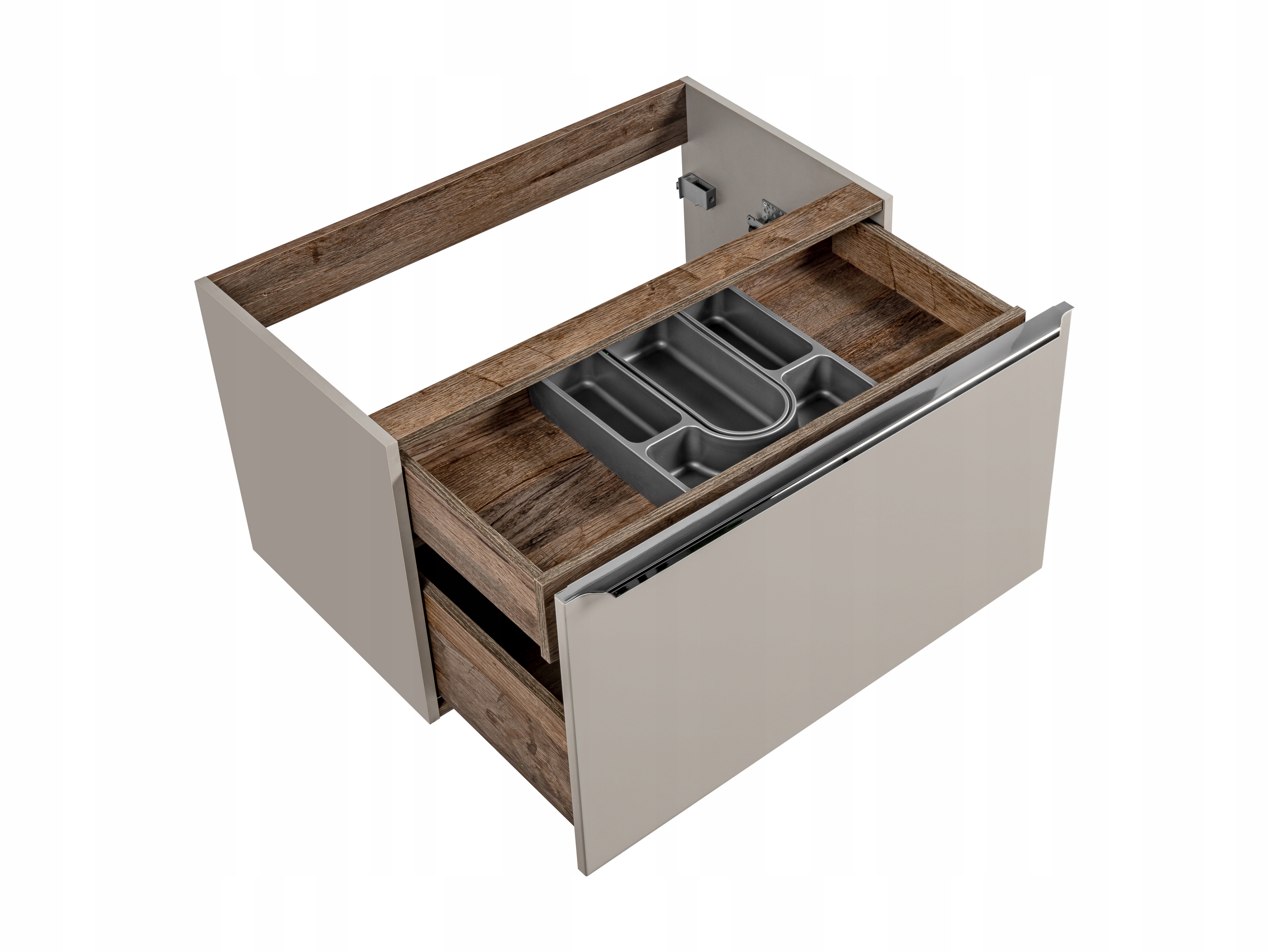 Szafka pod umywalkę z kolekcji SANTA FE TAUPE to idealne rozwiązanie dla nowoczesnych łazienek, dedykowane pod umywalki nablatowe. Kolor Taupe w połączeniu z eleganckimi chromowanymi uchwytami nadaje meblom lekkości i klasy. Zastosowanie funkcjonalnej szuflady z dodatkową szufladą wewnętrzną oraz organizerem zapewnia maksymalną wygodę i przestrzeń do przechowywania.