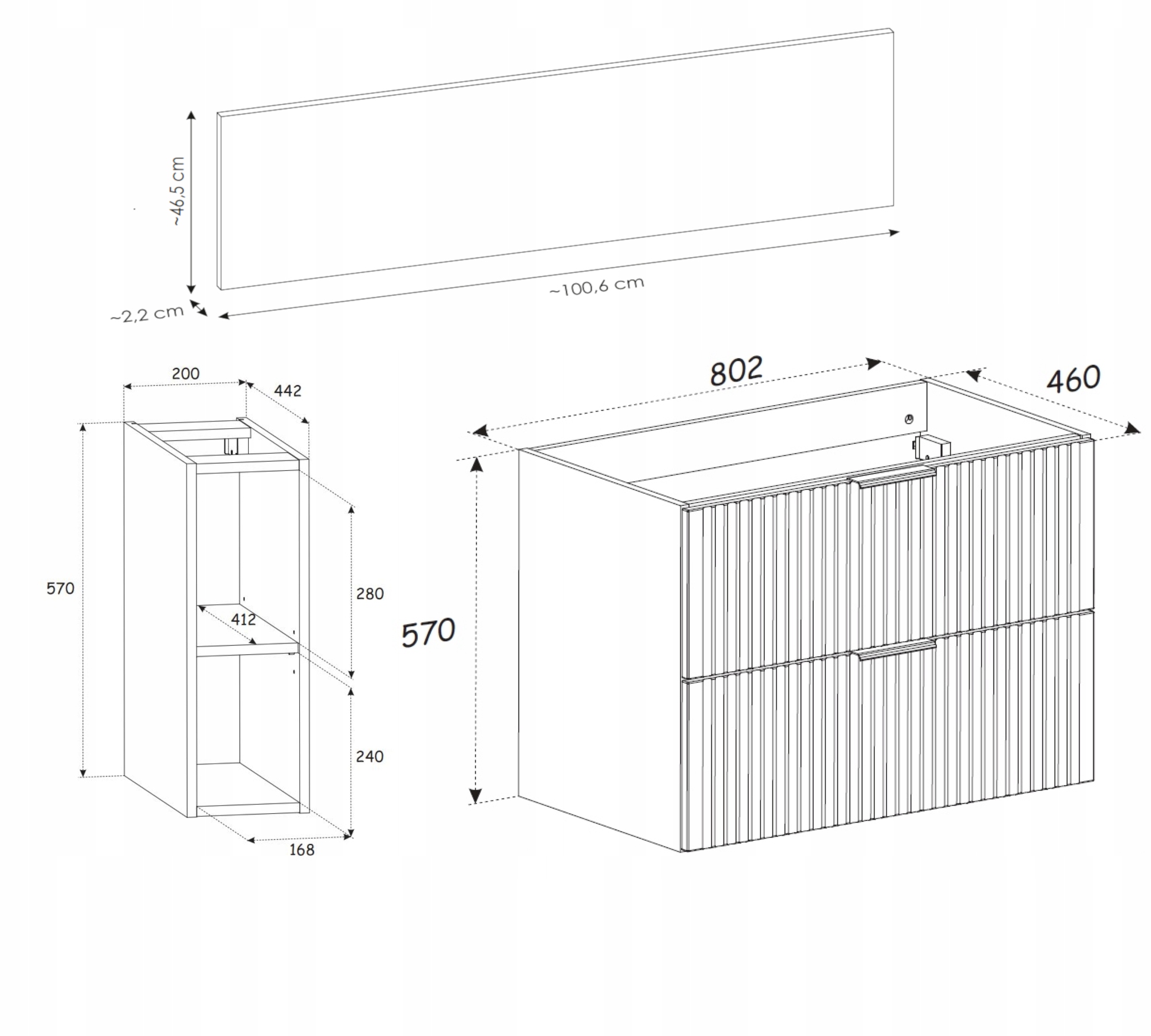 Szafka 80 cm: posiada 2 pojemne szuflady z cichym domykiem (SOFT CLOSE) oraz ryflowane fronty, co zapewnia wyjątkowy styl i komfort użytkowania.
