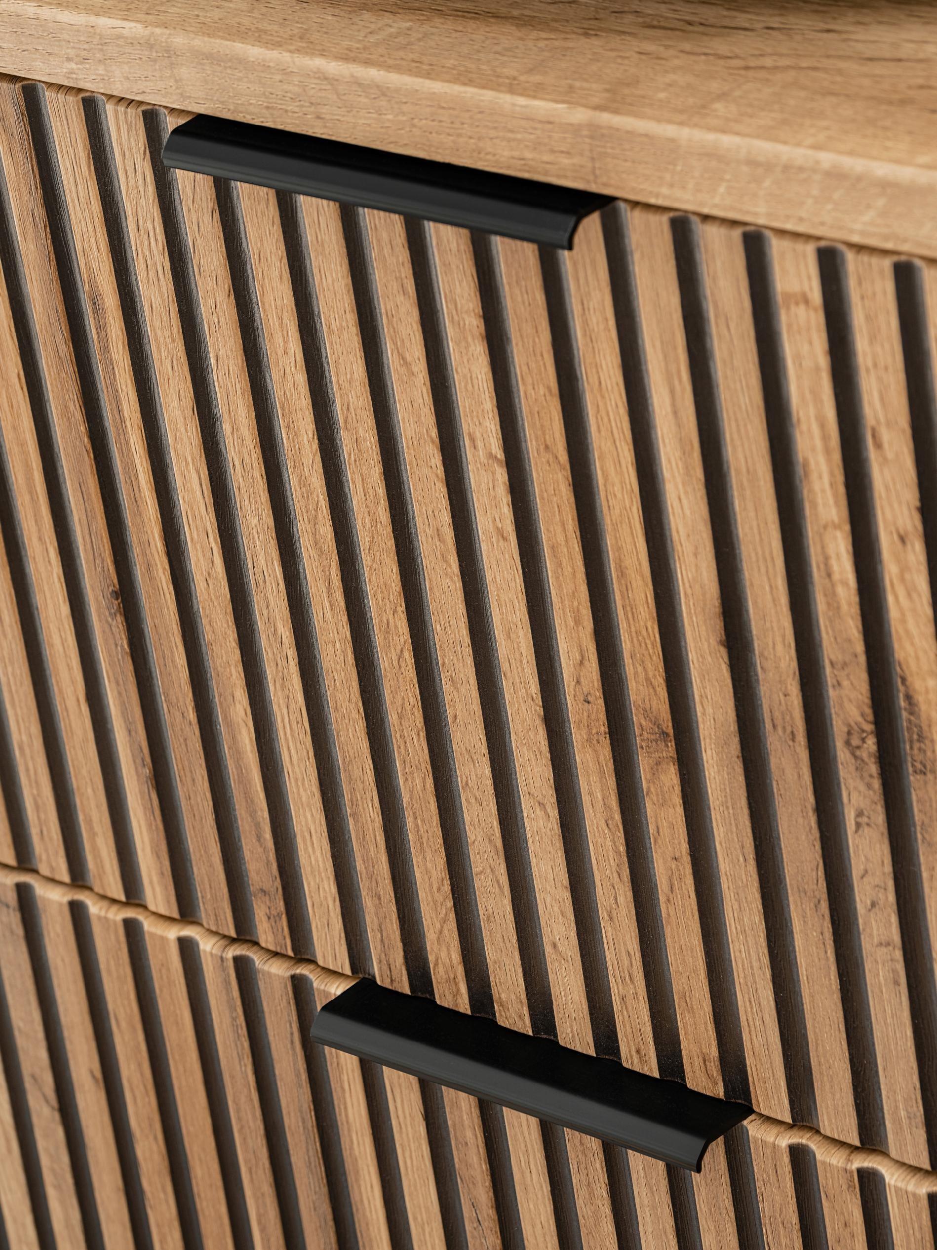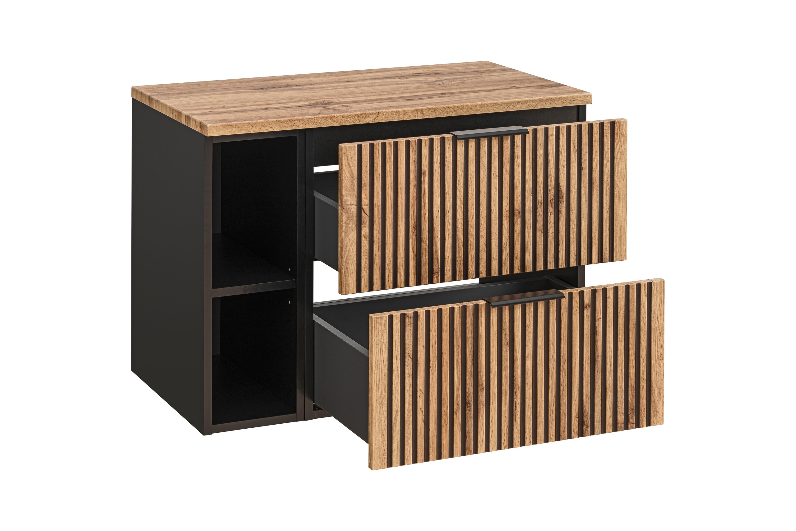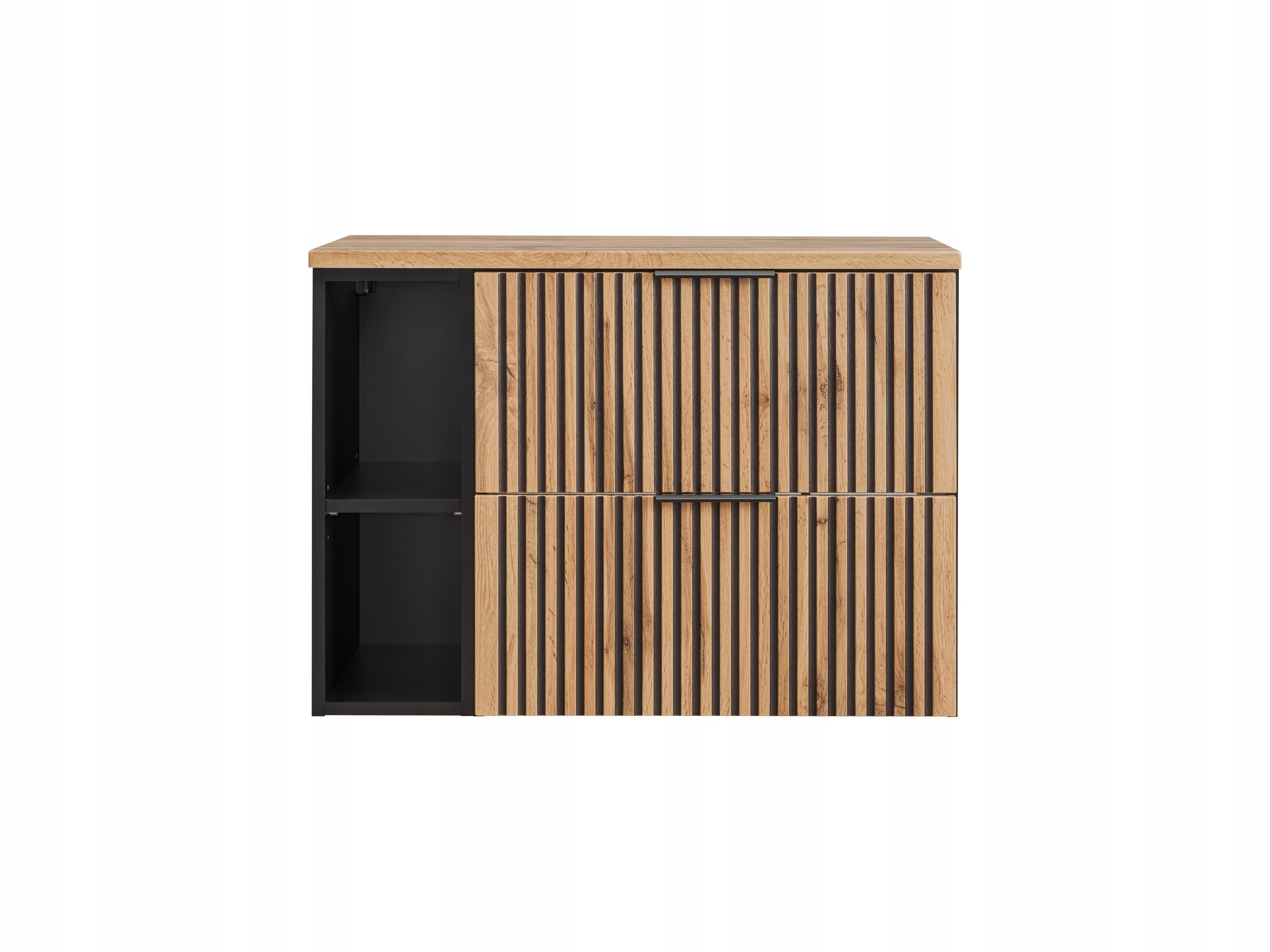 Kolekcja XILO to doskonała propozycja dla miłośników nowoczesnego designu. Czarna wisząca szafka o szerokości 80 cm, w połączeniu z blatem w odcieniu Dębu Wotan i wyjątkowym, ryflowanym frontem, tworzy elegancki i funkcjonalny element łazienki. Szafka wyposażona jest w dwie przestronne szuflady z funkcją cichego domyku, zapewniającą komfort użytkowania oraz subtelne uchwyty krawędziowe, które podkreślają nowoczesny styl.