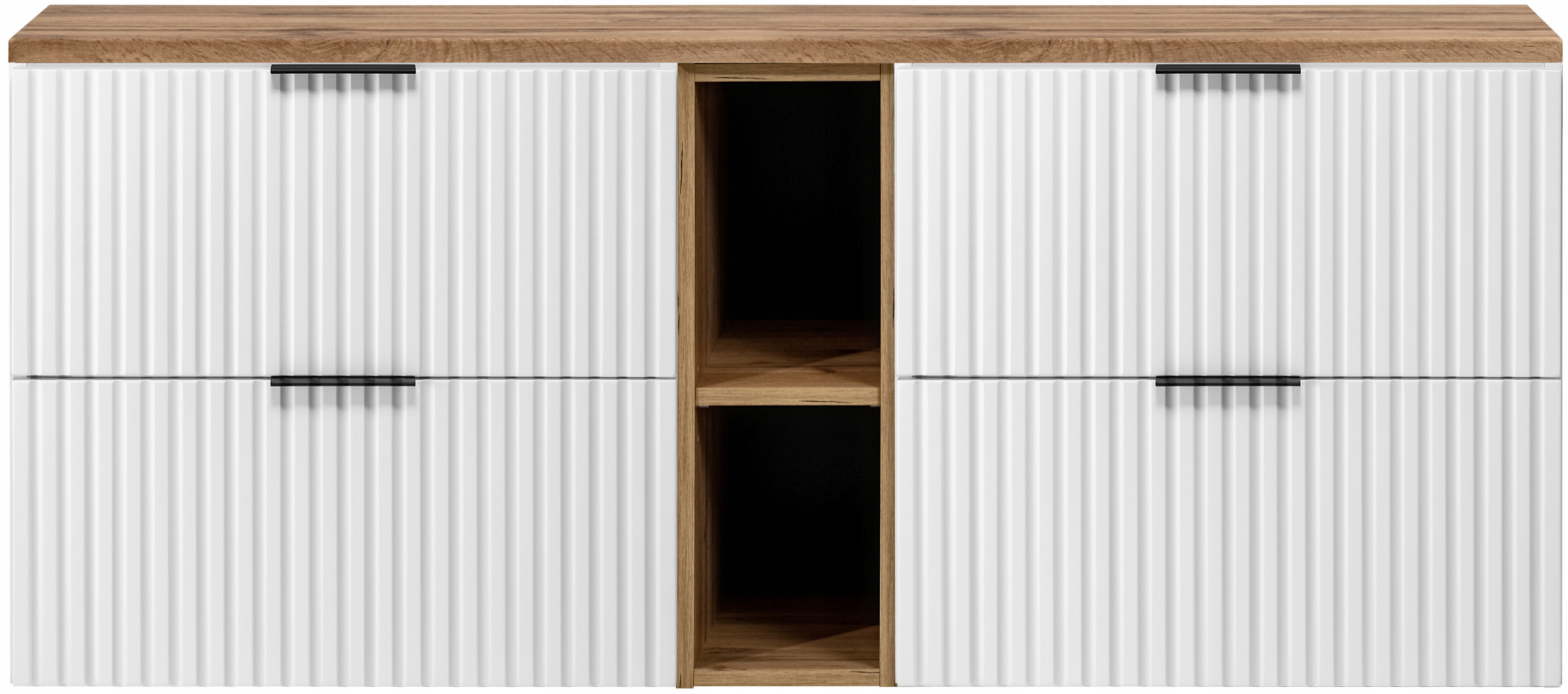 Kolekcja FLOW to harmonijne połączenie nowoczesnej elegancji i codziennej funkcjonalności. Zestaw o szerokości 140 cm składa się z dwóch wiszących szafek 60 cm, regału 20 cm oraz blatu w eleganckim odcieniu dąb wotan. Ryflowane fronty w białym macie nadają bryle subtelnej głębi i wyjątkowego charakteru, idealnie wpisując się w nowoczesne oraz glamour aranżacje.