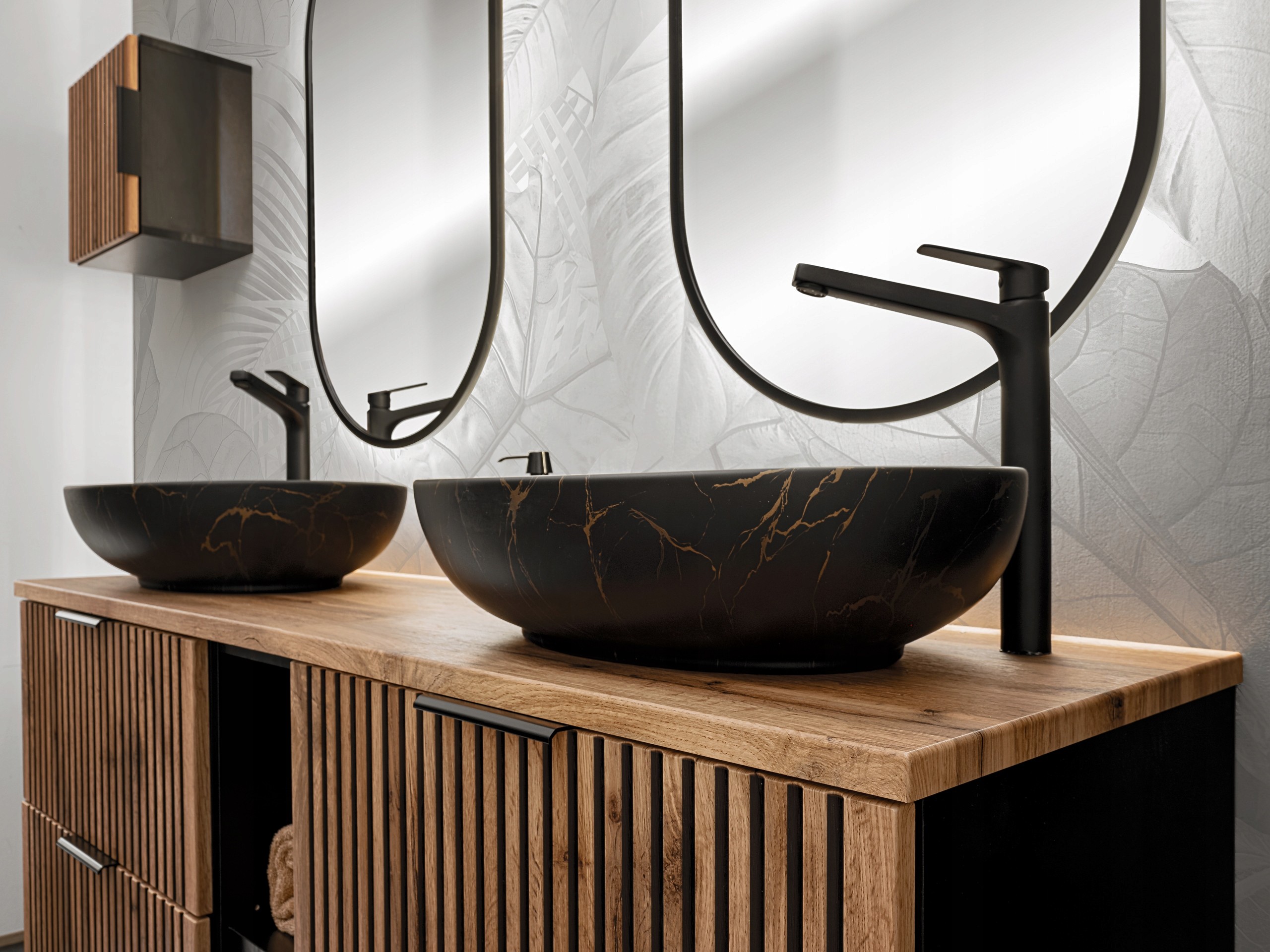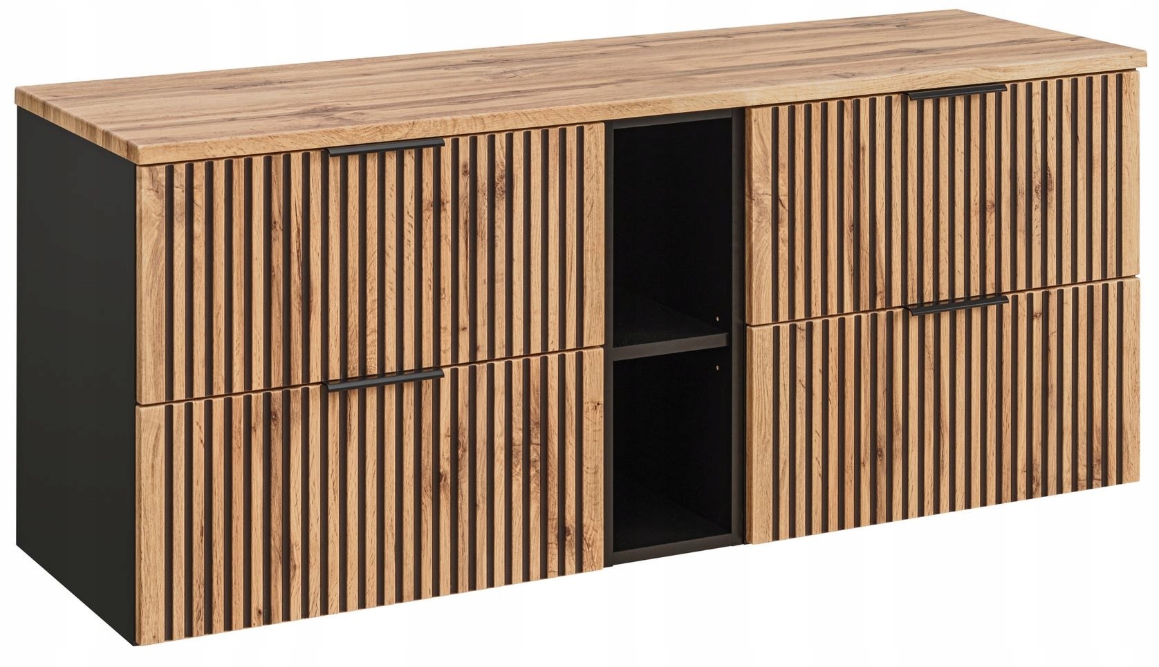 KOLEKCJA XILO to propozycja łącząca klasyczny styl z nowoczesnym wykończeniem, dedykowana osobom, które cenią unikatowy design. Charakterystyczne, wyraziste słoje dębu Wotan zestawione z czarnym, ryflowanym frontem tworzą kontrast, który nie tylko nadaje szafce wyjątkowy styl, ale również wprowadza harmonię kolorów do wnętrza łazienki. Zestawienie drewnianego blatu z ryflowanym frontem dodaje głębi i elegancji, co doskonale uzupełnia nowoczesne wnętrza.