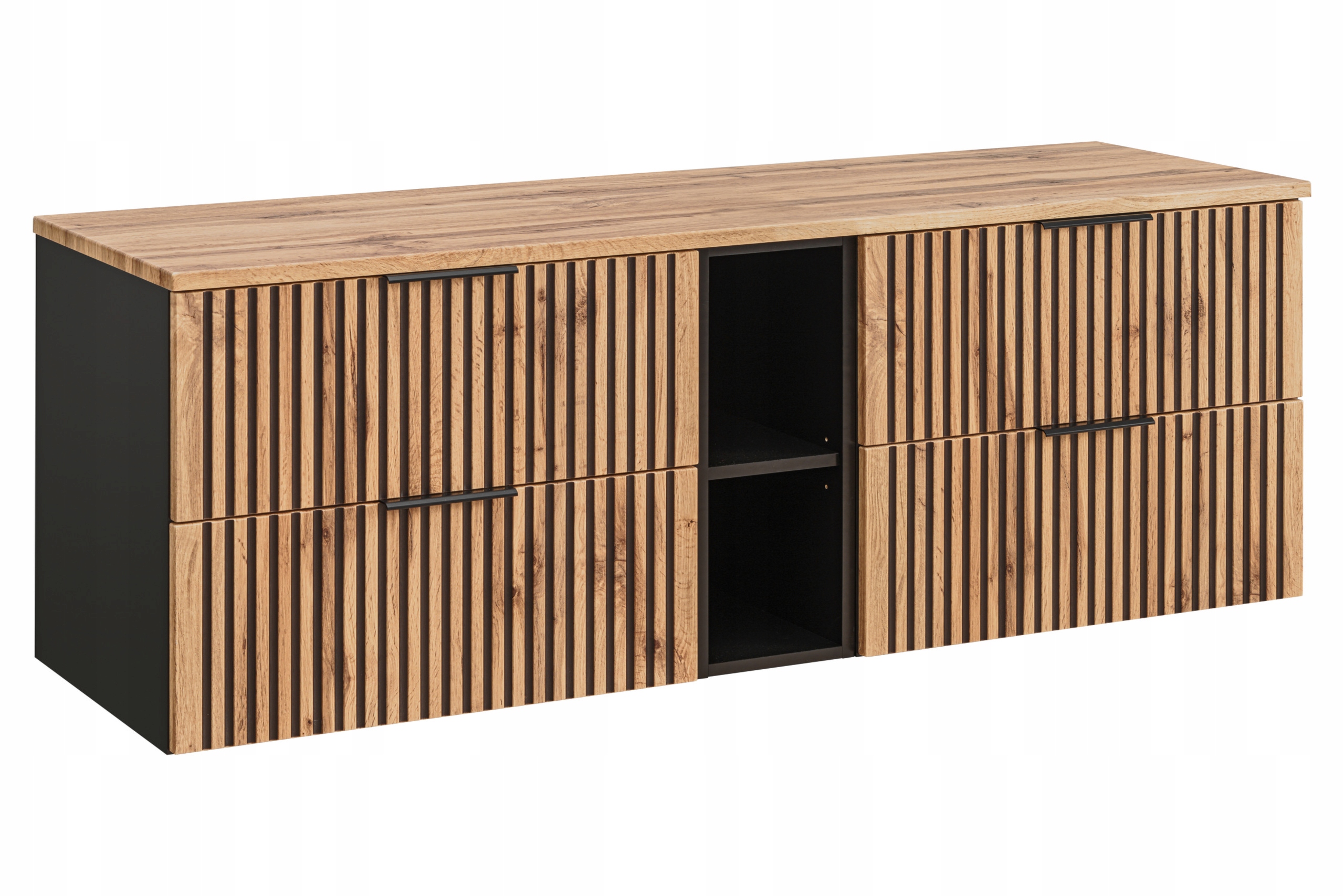 WISZĄCA Szafka do Łazienki CZARNA 180 cm z Blatem Dąb Wotan i Ryflowanymi Frontami