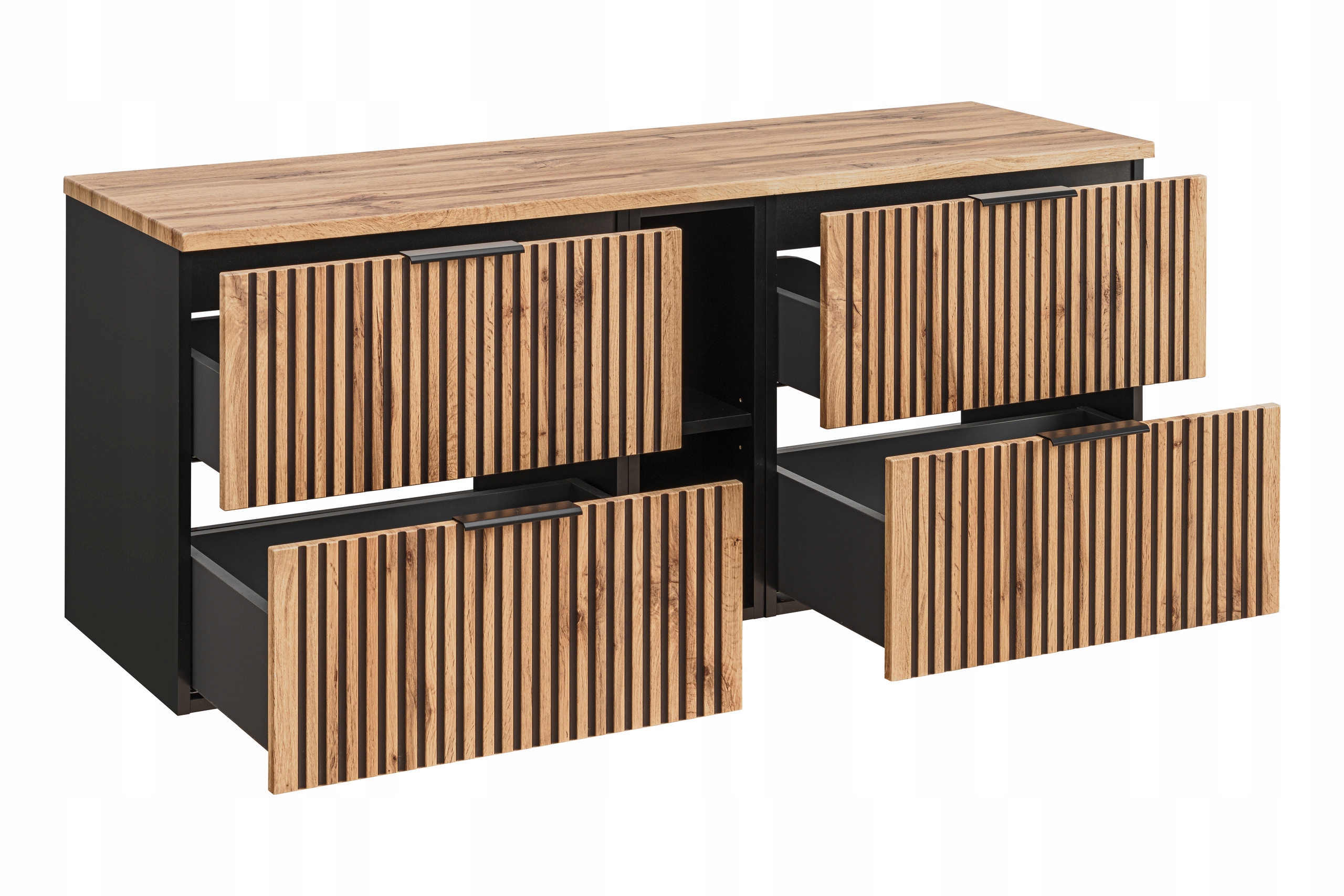 Elegancka wisząca szafka z kolekcji XILO to doskonałe rozwiązanie do dużej łazienki, łączące styl i funkcjonalność. Ryflowane fronty w kolorze dębu Wotan kontrastują z czarnym, matowym korpusem, tworząc nowoczesny i zarazem przytulny wygląd.