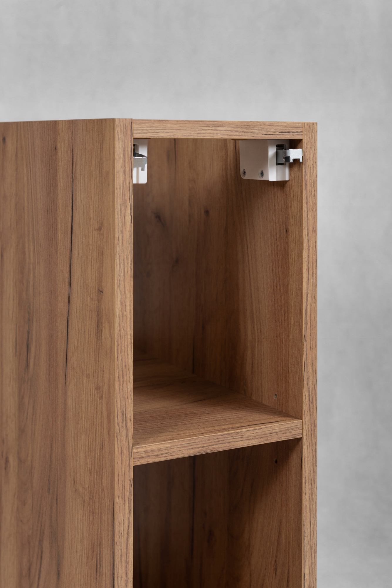 W skład zestawu wchodzą również dwa regały w kolorze dąb craft złoty, które można umiejscowić w dowolnej konfiguracji, dopasowując zabudowę do własnych potrzeb i układu pomieszczenia. Blat w kolorze dąb craft złoty doskonale komponuje się z kaszmirową szafką, oferując dużą i wygodną powierzchnię pod umywalkę.