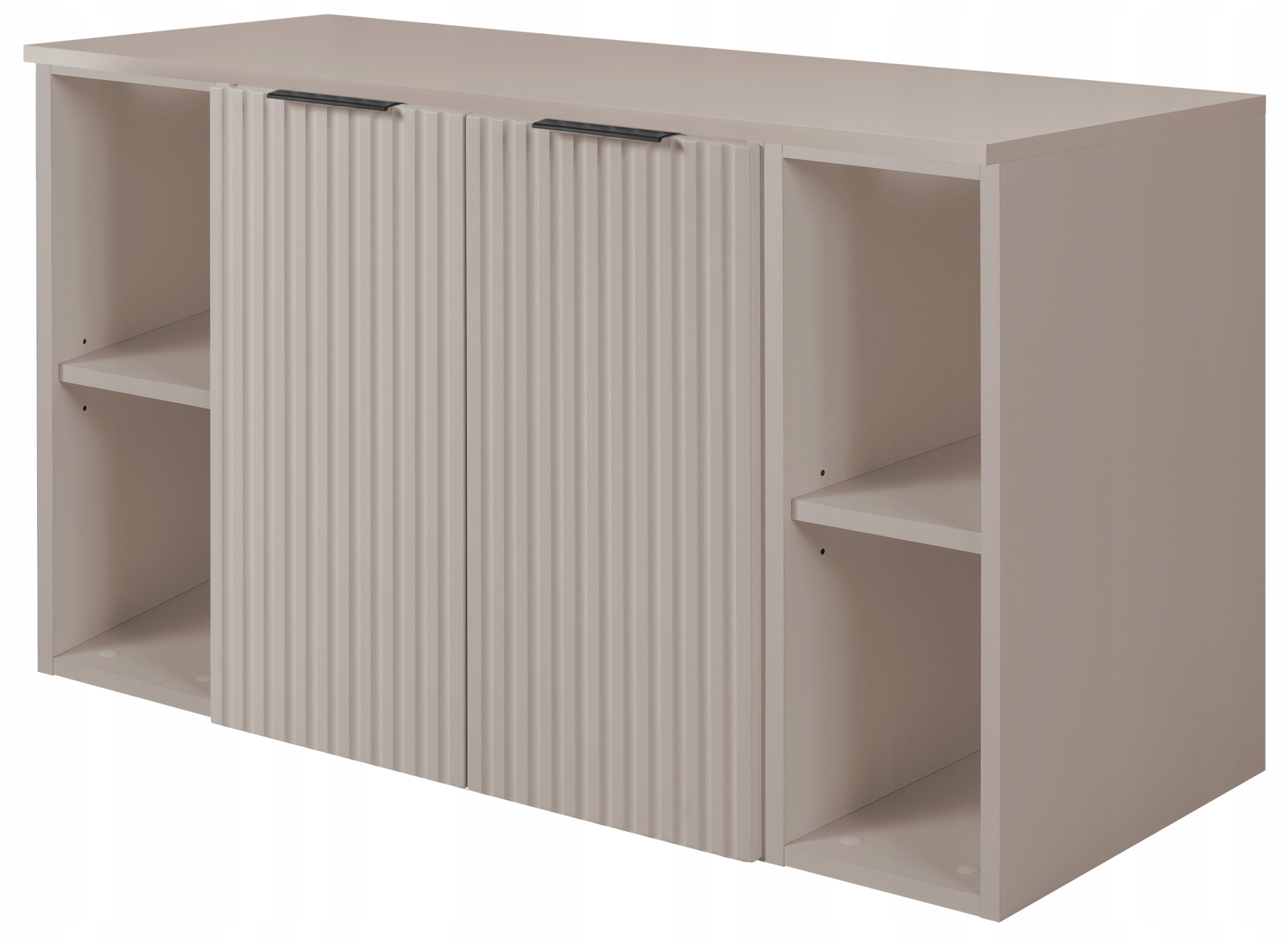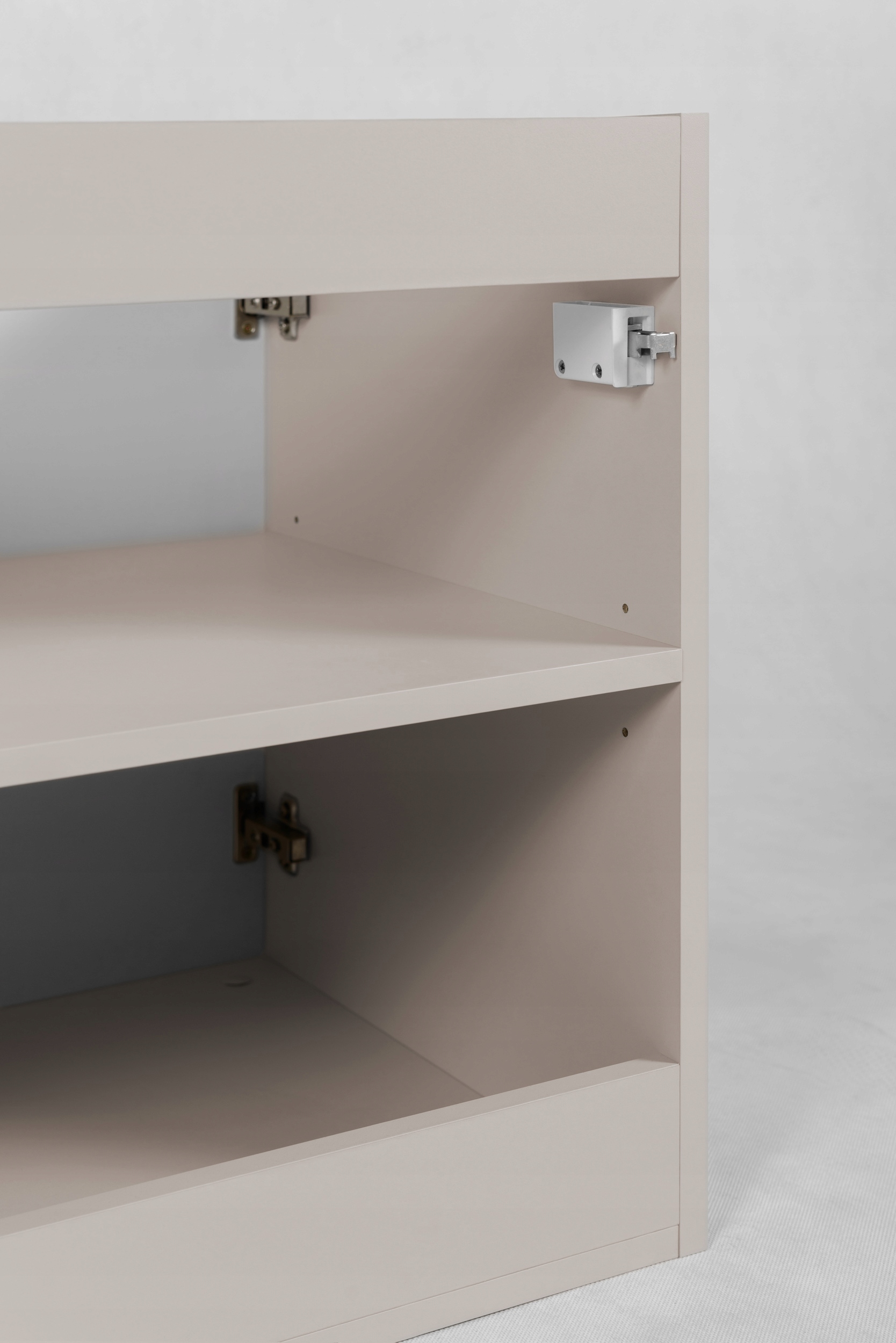 Uzupełnieniem zestawu są dwa regały w kolorze kaszmirowym, które można ustawić w dowolnej konfiguracji, dopasowując układ do indywidualnych potrzeb i przestrzeni. Blat w tym samym odcieniu kaszmiru harmonijnie dopełnia całość, oferując dużą i wygodną powierzchnię roboczą pod umywalkę.