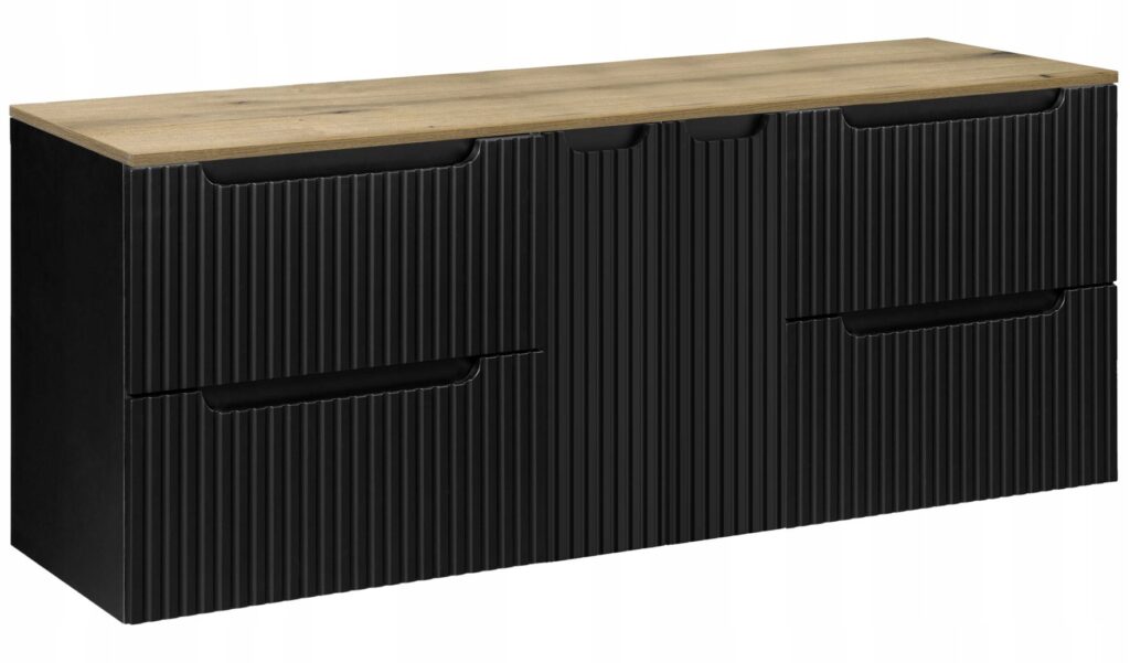 Ten stylowy zestaw łazienkowy z kolekcji FLOW łączy nowoczesną elegancję czerni z lekkim, kontrastowym akcentem bieli. Centralnym elementem jest wisząca czarna szafka pod umywalkę o szerokości 80 cm, wyróżniająca się dekoracyjnymi, ryflowanymi frontami, które nadają bryle wyrazisty i nowoczesny charakter. Dwie pojemne szuflady wyposażone w system SOFT CLOSE zapewniają ciche i komfortowe użytkowanie na co dzień.
