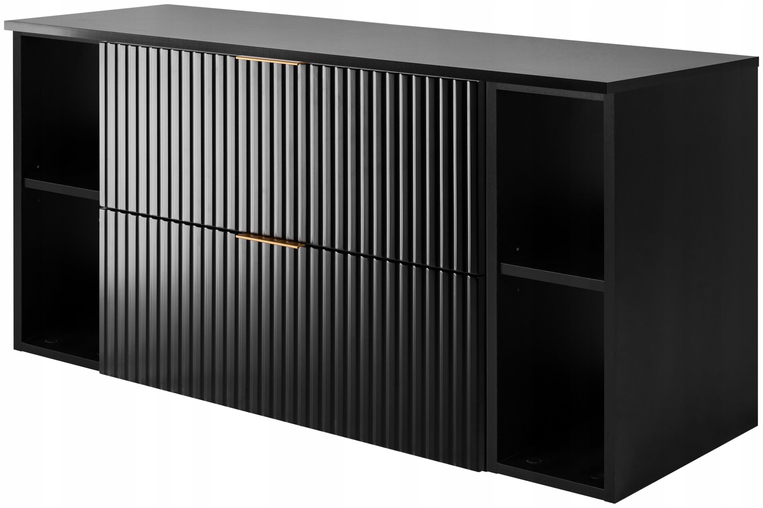 Szafka została wyposażona w dwie pojemne szuflady z systemem SOFT CLOSE, które zapewniają ciche i płynne domykanie oraz wysoki komfort codziennego użytkowania. Całość uzupełniają dwa czarne regały o szerokości 20 cm każdy, które można dowolnie rozmieszczać, dopasowując układ do przestrzeni łazienki. Czarny blat o szerokości 120 cm tworzy spójną i elegancką zabudowę, idealną pod nowoczesną umywalkę.