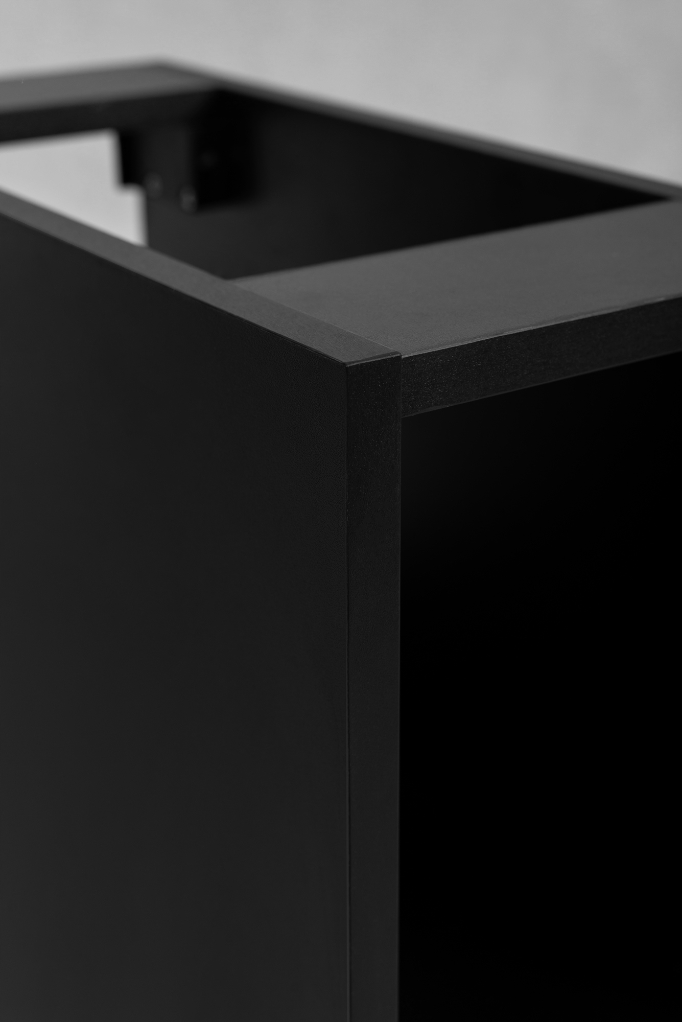 Blat o szerokości 120 cm w kolorze czarny mat tworzy elegancki kontrast z naturalnym odcieniem dębu, nadając zestawowi nowoczesny i wyrazisty charakter. Całość uzupełniają dwa regały o szerokości 20 cm w kolorze czarny mat, które oferują dodatkową przestrzeń do przechowywania kosmetyków i akcesoriów łazienkowych.