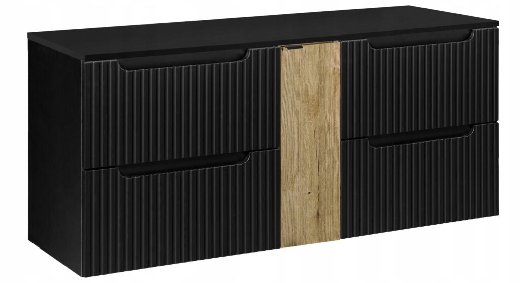 Dodatkowym atutem zestawu są dwa regały w kolorze dąb craft złoty, które można ustawić w dowolnej konfiguracji, dopasowując układ do własnych potrzeb i przestrzeni łazienki. W komplecie znajdują się trzy kolory uchwytów – czarne, złote i srebrne, co umożliwia personalizację wyglądu mebli zgodnie z indywidualnym stylem.