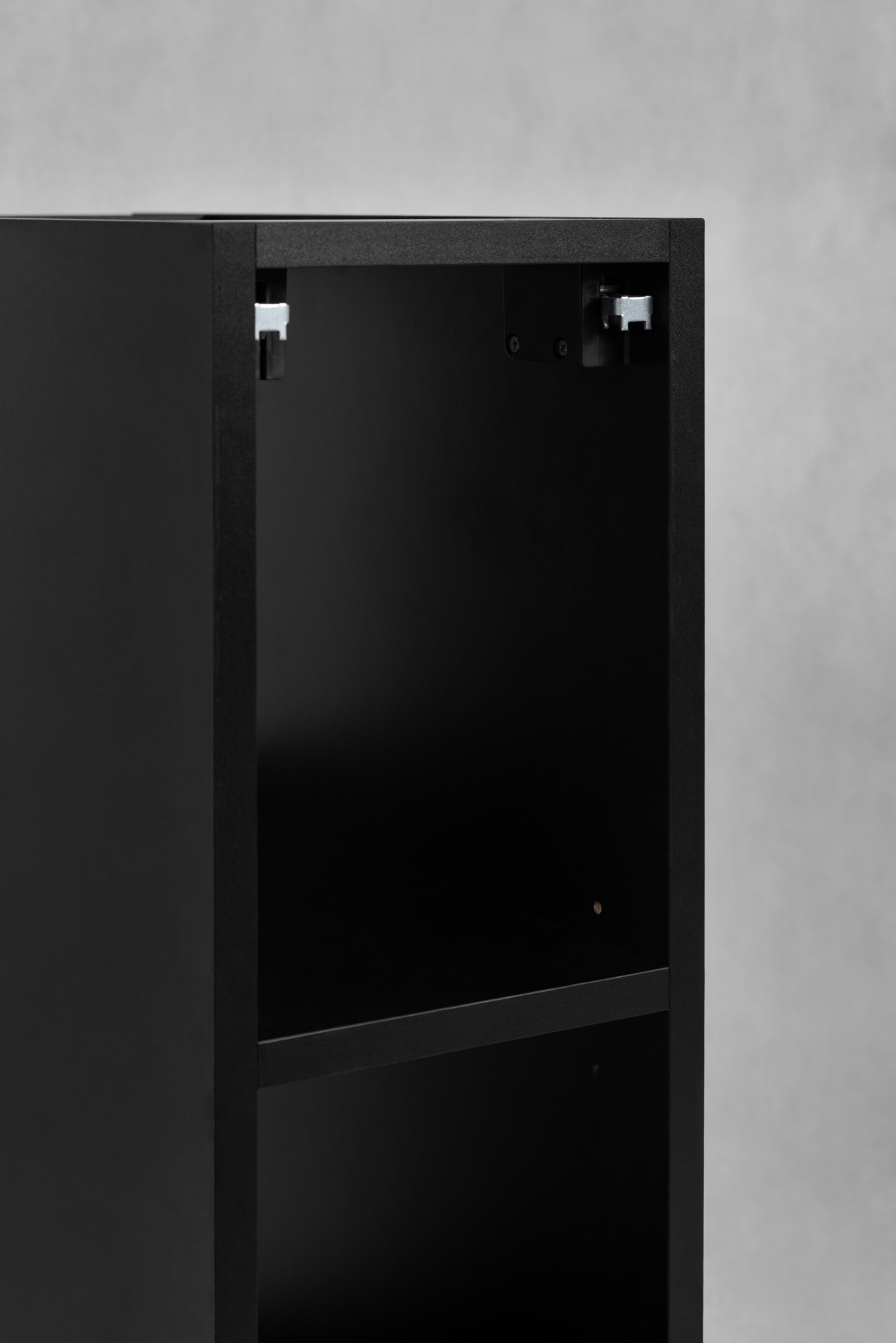 W zestawie znajdują się także dwa regały w kolorze czarnym, które można umiejscowić w dowolnym miejscu, co zapewnia elastyczność aranżacji i możliwość dopasowania układu do indywidualnych potrzeb. Blat w kolorze czarnym tworzy wyrazisty kontrast z dekorem dąb craft złoty i oferuje dużą powierzchnię roboczą pod umywalkę.