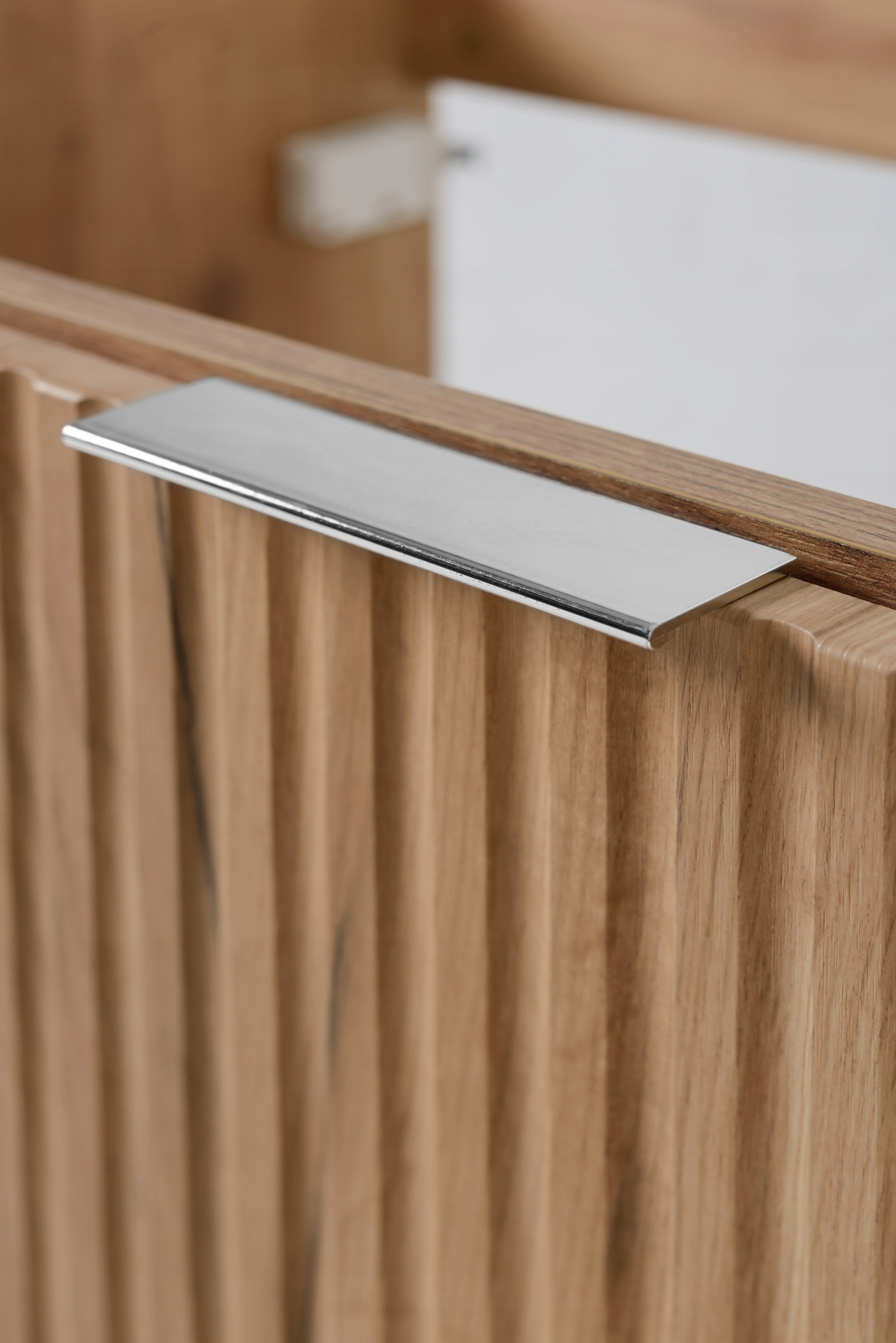 Zestaw mebli Flow to doskonałe rozwiązanie do każdej nowoczesnej łazienki, które łączy funkcjonalność z eleganckim designem. W skład zestawu wchodzi szafka pod umywalkę w kolorze dąb craft złoty, wyposażona w dwoje drzwi z ryflowanymi frontami. Dzięki temu mebel prezentuje się stylowo, a jednocześnie zapewnia dodatkową przestrzeń do przechowywania akcesoriów łazienkowych. Zawiasy z funkcją cichego domyku SOFT CLOSE gwarantują komfortowe i bezgłośne zamykanie.