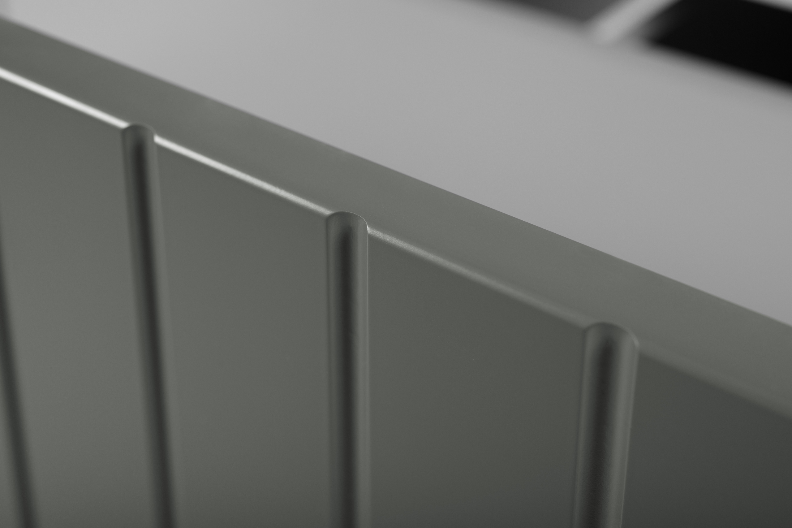 Kolekcja mebli łazienkowych HARMO to wyjątkowe połączenie elegancji i funkcjonalności, które doskonale wpisuje się w nowoczesne aranżacje. Model w zielonym półmacie z frezowanymi frontami wykonanymi z wysokiej jakości płyty MDF zachwyca subtelnym wzornictwem i dbałością o detale. Powierzchnie zostały pokryte trwałym lakierem, dzięki czemu są odporne na wilgoć i codzienne użytkowanie, co sprawia, że mebel idealnie sprawdza się w wymagających warunkach łazienki.
