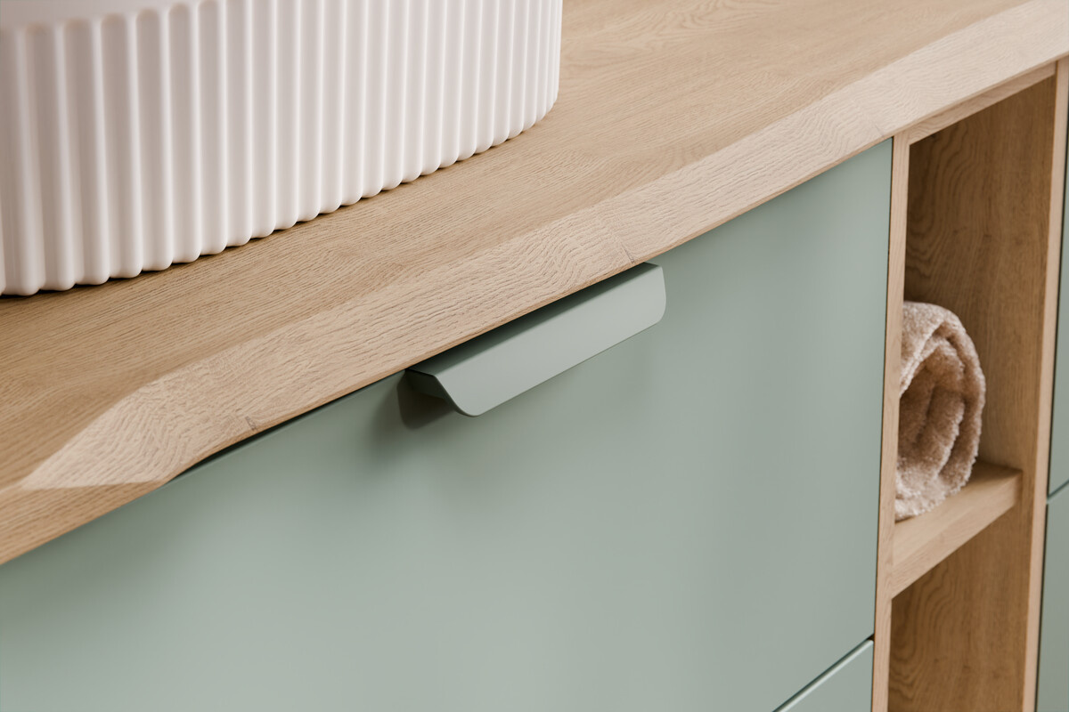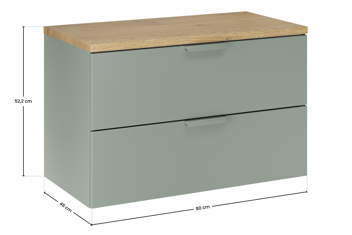 Zestaw o szerokości 80 cm tworzy funkcjonalną strefę umywalkową z dwiema pojemnymi szufladami zapewniającymi wygodne przechowywanie. Blat w dekorze Dąb Cremona stanowi estetyczne wykończenie zabudowy i umożliwia montaż umywalki nablatowej według własnej aranżacji. Nie posiada fabrycznie wyciętego otworu pod umywalkę – należy go wykonać zgodnie z wybraną instalacją. Zestaw nie zawiera umywalki.