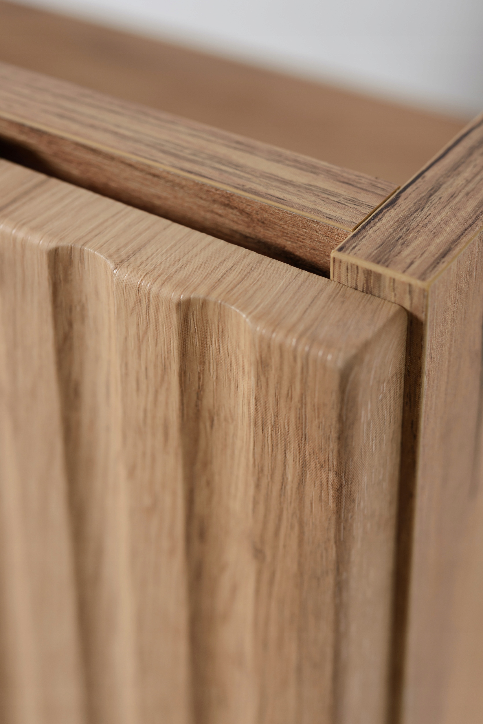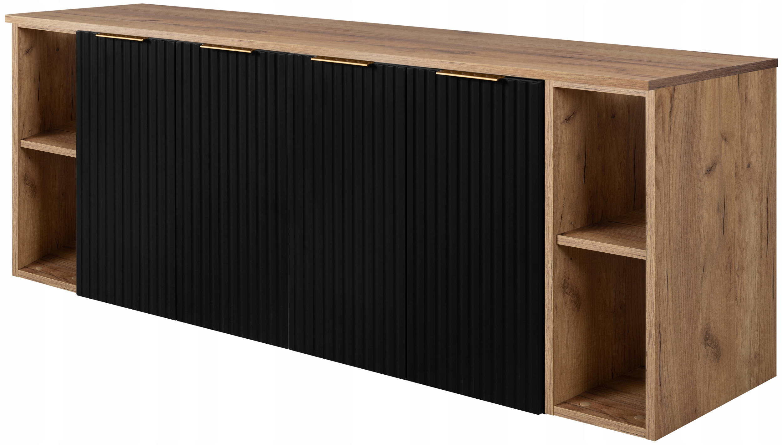 Nowoczesny design glamour w połączeniu z charakterystycznymi, ryflowanymi frontami tworzy efektowną i ponadczasową formę, która nada wnętrzu elegancji i charakteru. Meble w wersji wiszącej nadają zabudowie lekkości oraz ułatwiają utrzymanie czystości. Zastosowany system SOFT CLOSE gwarantuje ciche i komfortowe użytkowanie, a możliwość dowolnego rozmieszczenia regałów pozwala dopasować układ do indywidualnych potrzeb.