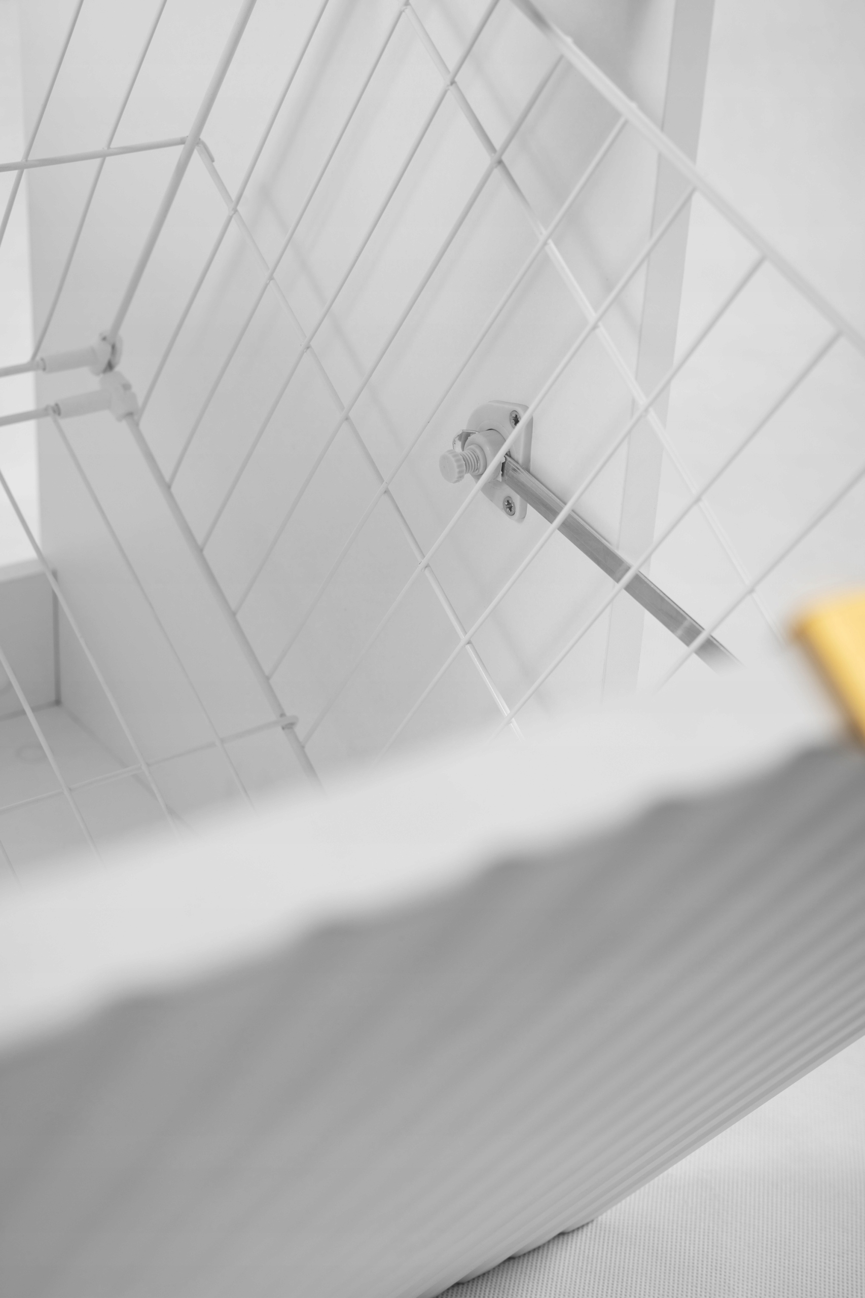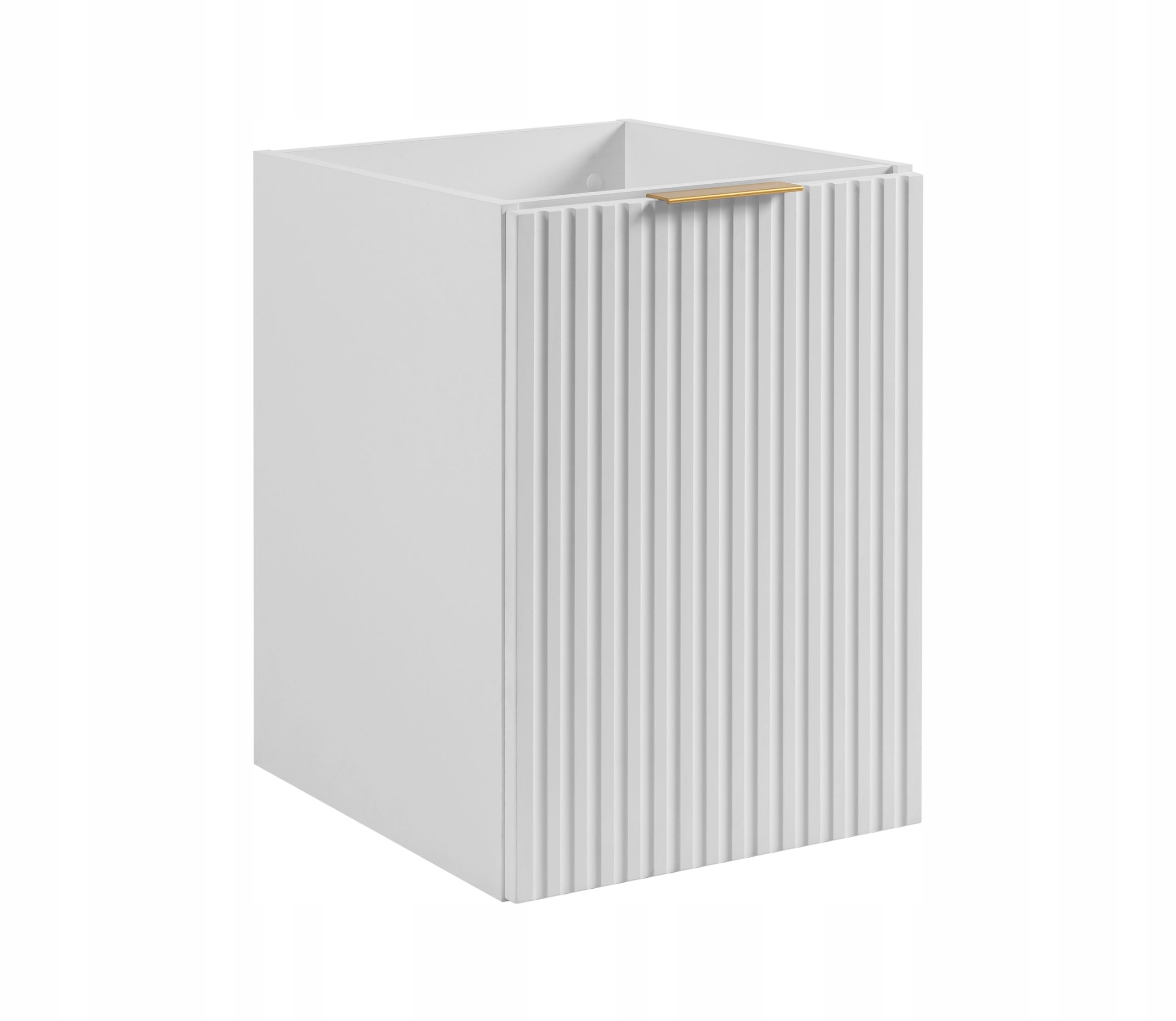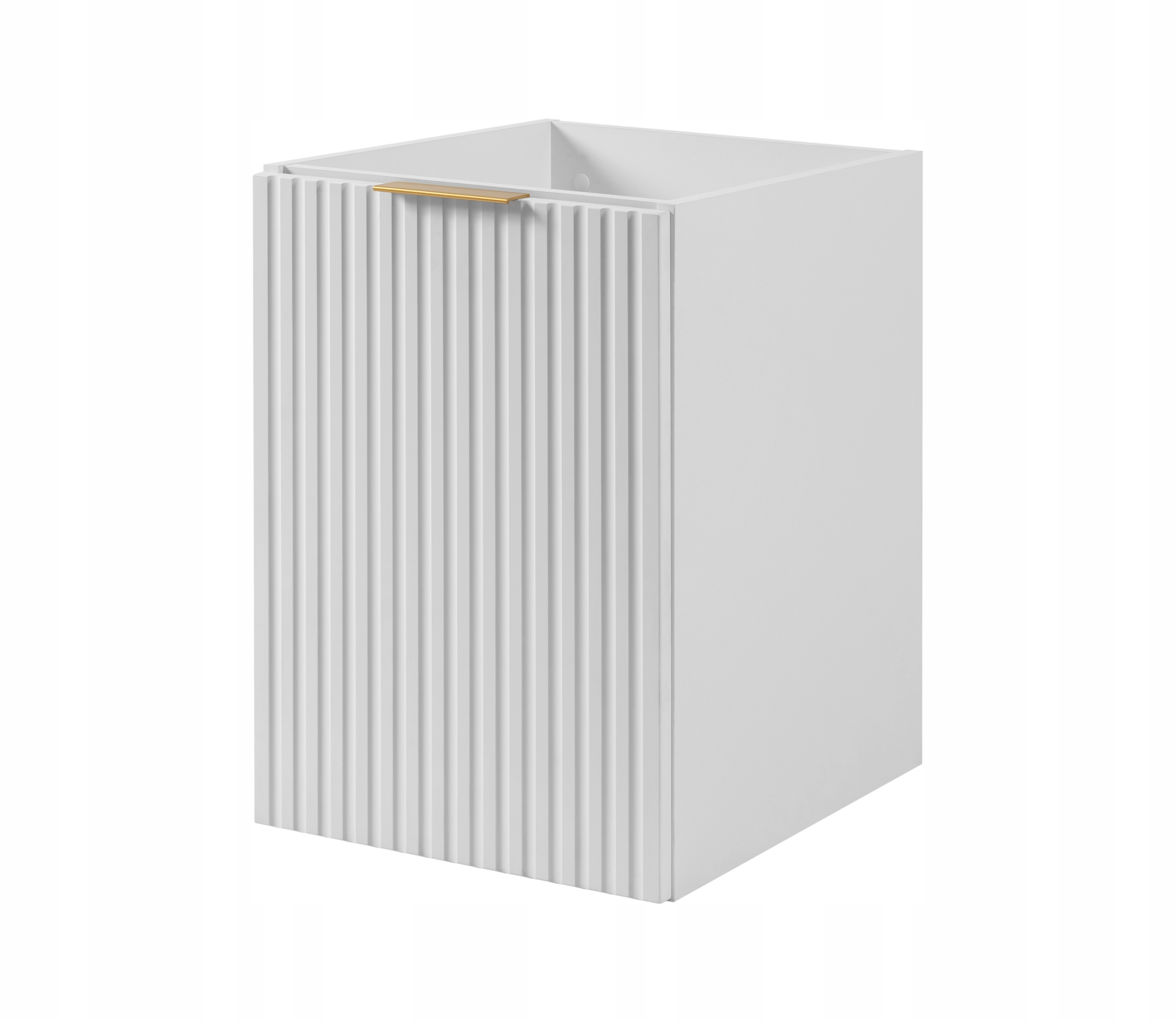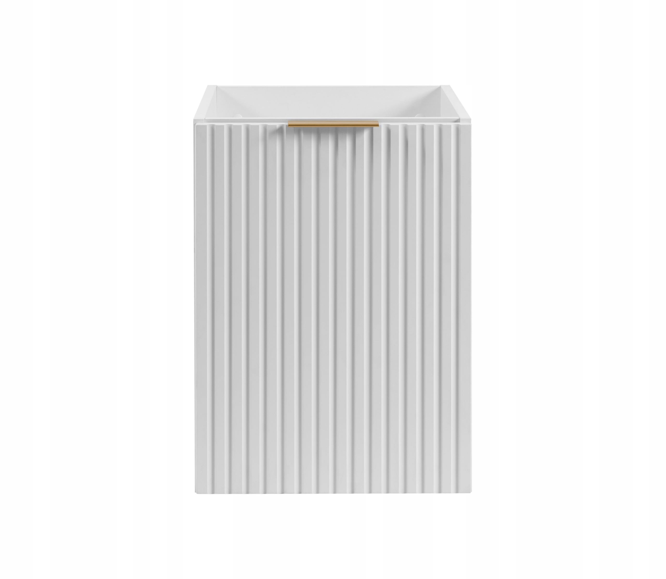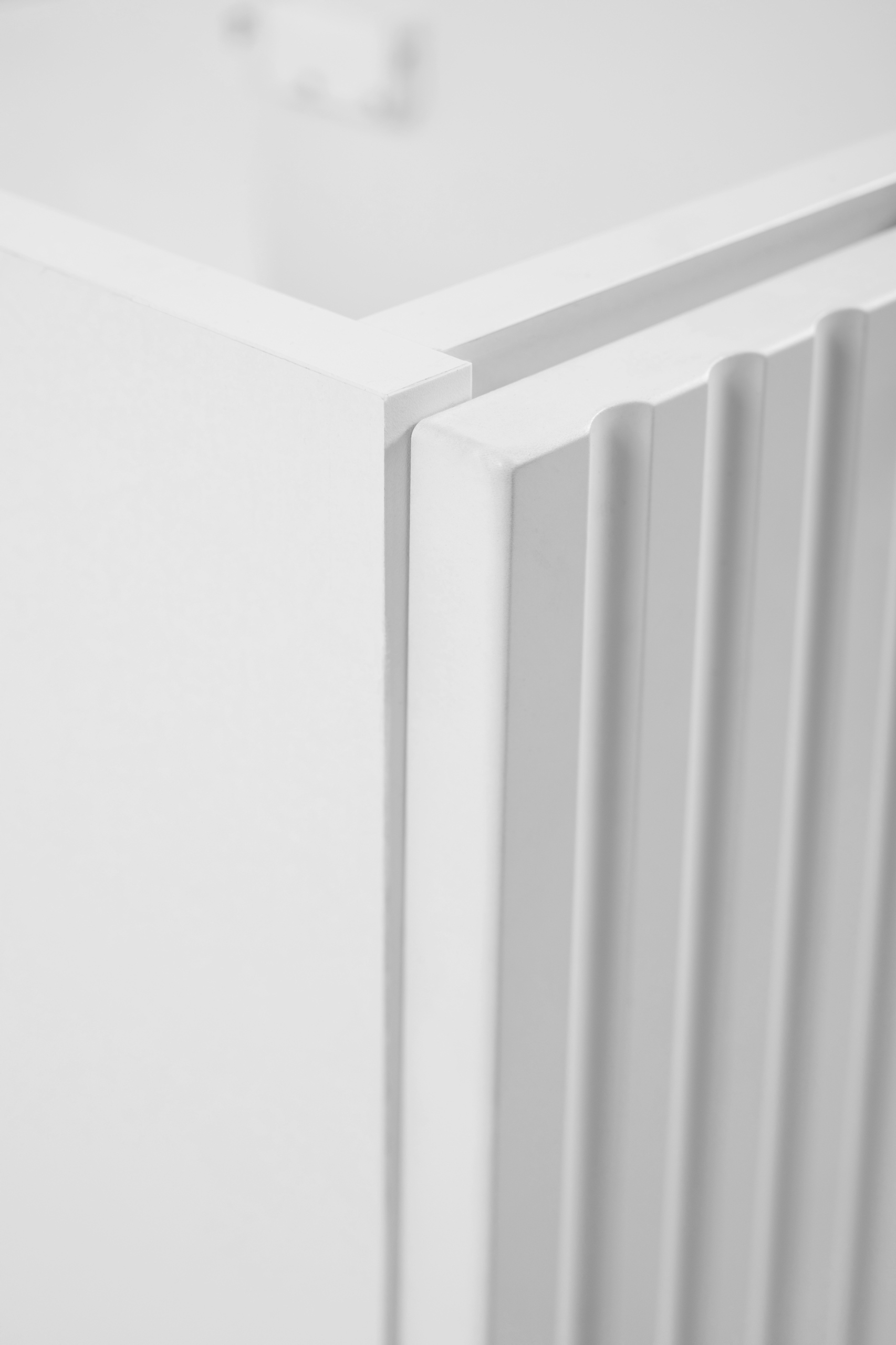 Front wykonany jest z ryflowanej płyty MDF o grubości 16 mm, natomiast korpus z płyty laminowanej o grubości 16 mm w kolorze białym. Krawędzie zabezpieczono obrzeżem ABS o grubości 0,5 mm zwiększającym trwałość mebla podczas codziennego użytkowania. Szafka wyposażona jest w system cichego domyku drzwi zapewniający komfortowe zamykanie. Zestaw przeznaczony pod dowolny blat, który należy dobrać osobno.