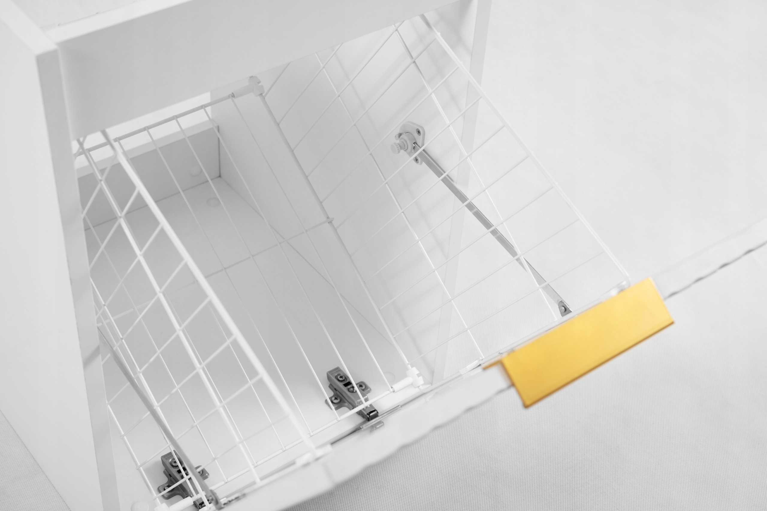 Szafka łazienkowa FLOW o szerokości 40 cm to praktyczne rozwiązanie pomagające utrzymać porządek w łazience. Bryła o szerokości 40 cm, wysokości 57 cm oraz głębokości 46 cm została wyposażona w metalowy kosz na pranie o pojemności około 35 litrów. Konstrukcja kosza została zaprojektowana tak, aby maksymalnie wykorzystać przestrzeń wewnętrzną mebla i zajmuje około 90 procent wnętrza szafki, dzięki czemu zapewnia dużą pojemność przy kompaktowych wymiarach. Szafka przeznaczona jest do montażu pod blatem i może funkcjonować jako samodzielny element lub zostać połączona z innymi modułami kolekcji FLOW w celu stworzenia większej zabudowy łazienkowej.