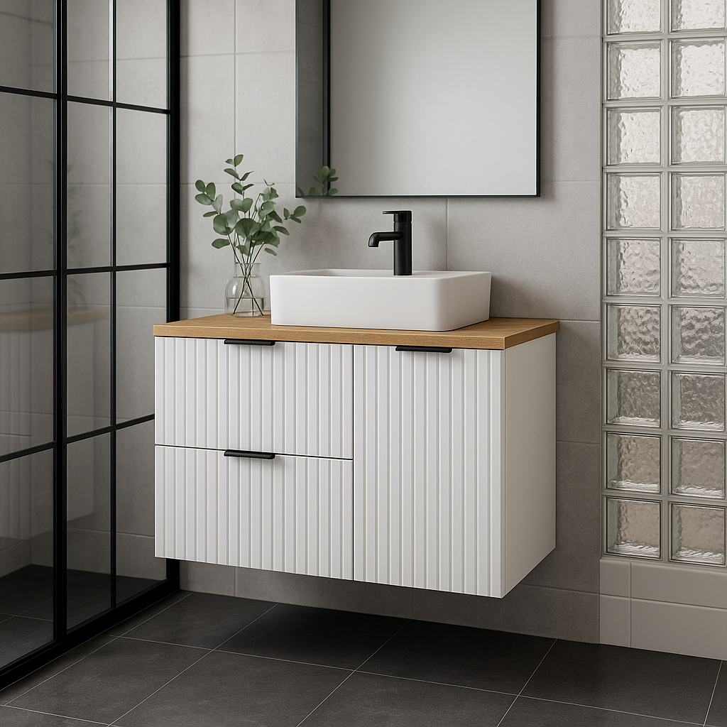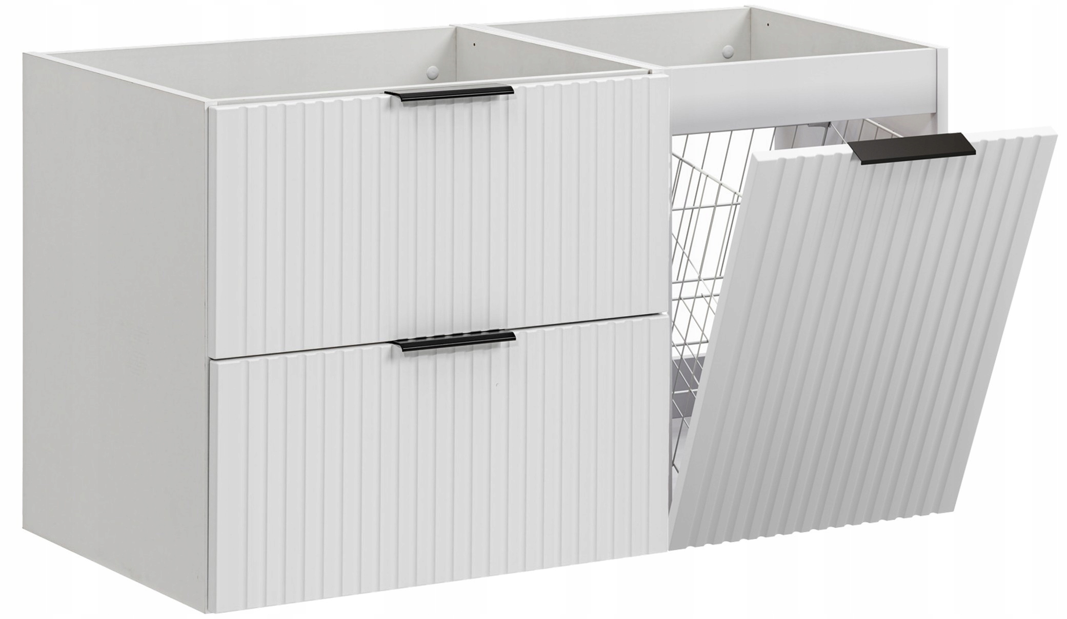 Białe ryflowane fronty dodają całości lekkości i elegancji, jednocześnie optycznie powiększając przestrzeń. Zintegrowane uchwyty krawędziowe dostępne są w trzech kolorach: złoty, chromowany i czarny – wszystkie trzy wersje otrzymujesz w komplecie. Dzięki systemowi SOFT CLOSE, szuflady i kosz zamykają się cicho i bezpiecznie, co podnosi komfort codziennego użytkowania.