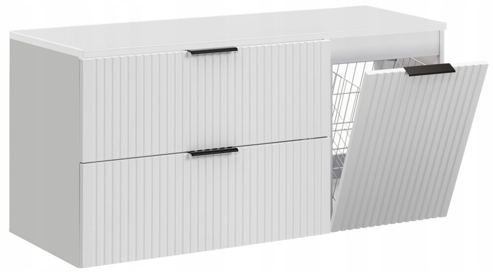 W zestawie znajdują się dwie szafki: moduł 60 cm z dwiema szufladami oraz szafka 40 cm z koszem na pranie, która pozwala przechowywać brudną bieliznę w dyskretny sposób. Oba meble posiadają zintegrowane frezowane uchwyty i cichy domyk (SOFT CLOSE), co gwarantuje komfort codziennego użytkowania. Układ mebli jest uniwersalny, więc możesz ustawić szafki w dowolnej kolejności – idealnie dopasowując je do swojej przestrzeni. Czarny blat to solidna i elegancka podstawa pod umywalkę nablatową, doskonale kontrastująca z białymi frontami. W zestawie znajdziesz trzy kolory uchwytów – złoty, chromowany oraz czarny – które ułatwią dopasowanie mebla do wybranego stylu armatury.
