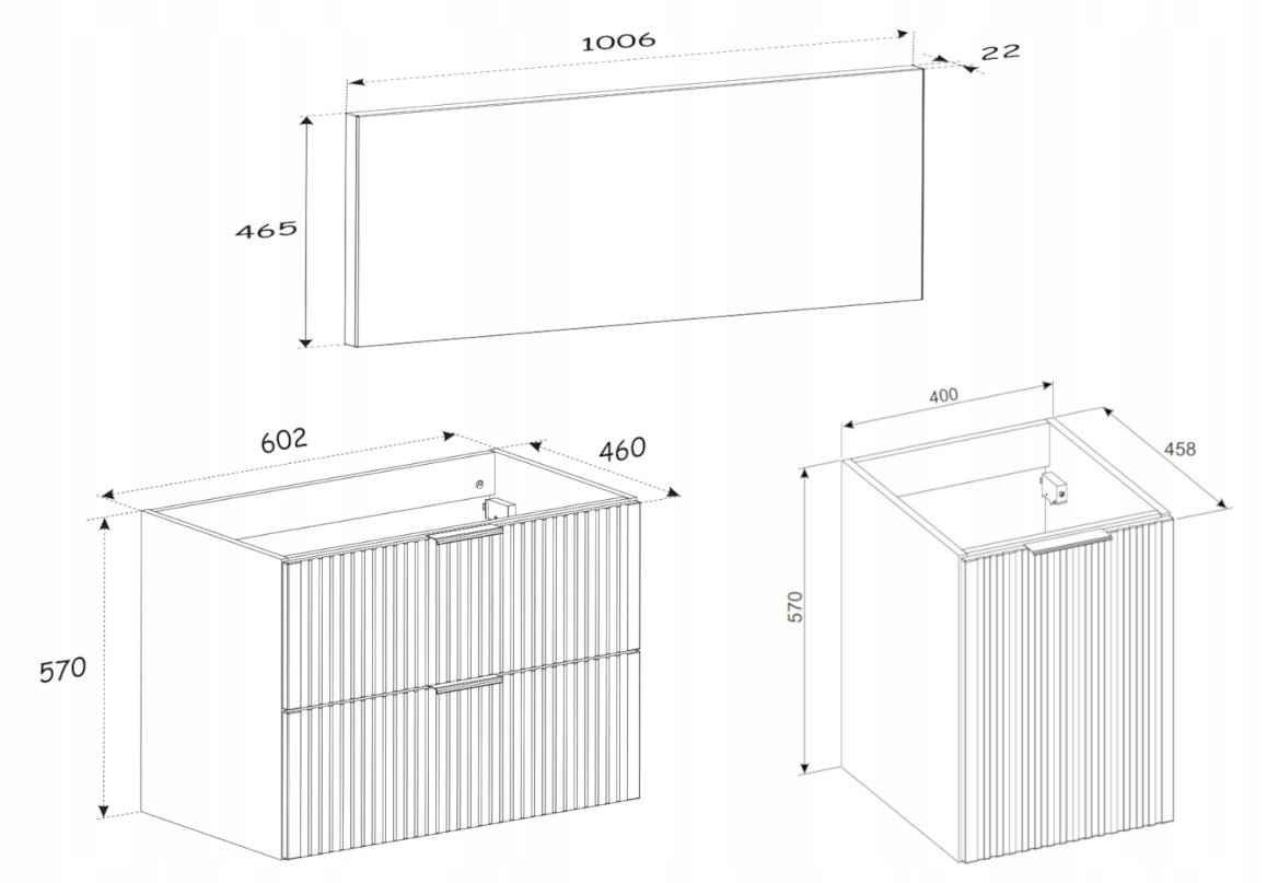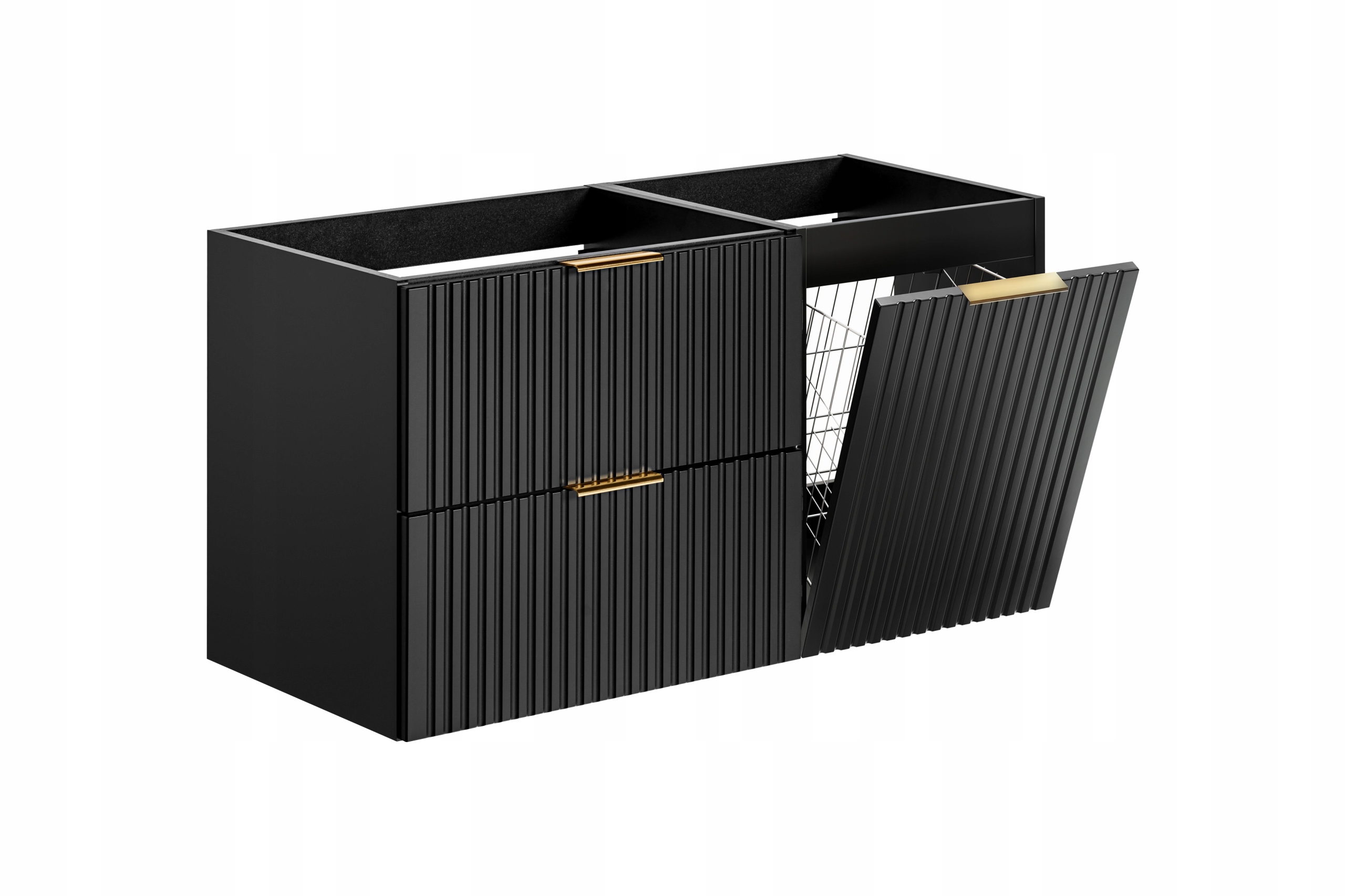 Zestaw składa się z dwóch niezależnych szafek: szafki 60 cm z dwiema pojemnymi szufladami oraz szafki 40 cm z praktycznym koszem na pranie w zabudowie. Szuflady wyposażone są w nowoczesny system SOFT CLOSE, zapewniający ciche i płynne domykanie. Ułożenie szafek jest uniwersalne – możesz dopasować ich kolejność do swojego wnętrza. Do kompletu dołączony jest blat w dekorze dąb wotan, który nie tylko nadaje ciepła, ale także umożliwia montaż umywalki nablatowej. W zestawie znajdziesz również trzy kolory uchwytów: czarny, złoty i chrom, dzięki czemu bez trudu dopasujesz całość do armatury i dodatków.