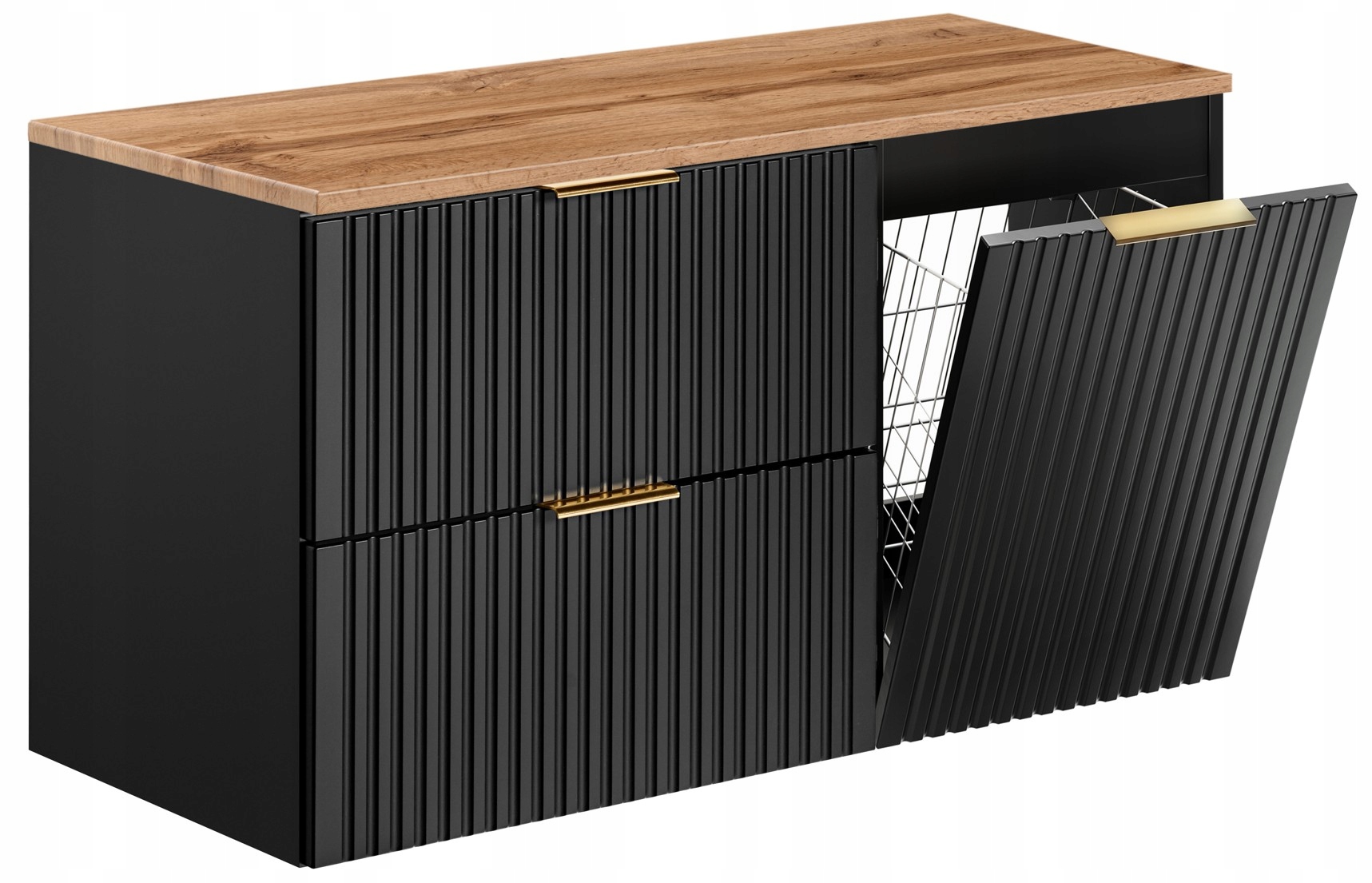 Zestaw mebli łazienkowych ADEL 100 cm z blatem w dekorze dąb wotan i szafkami w kolorze czarnym to nowoczesna i niezwykle praktyczna propozycja do stylowych wnętrz. Matowa czerń frontów z pionowym ryflowaniem w połączeniu z ciepłym odcieniem blatu tworzy efektowny kontrast i ponadczasową elegancję. To rozwiązanie, które świetnie odnajdzie się zarówno w industrialnych, jak i minimalistycznych łazienkach.