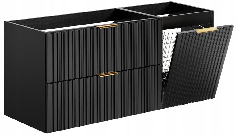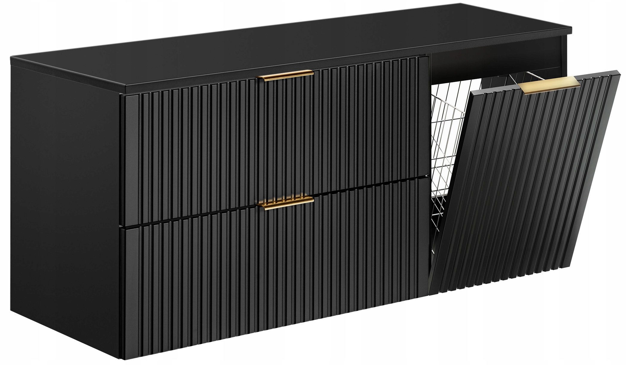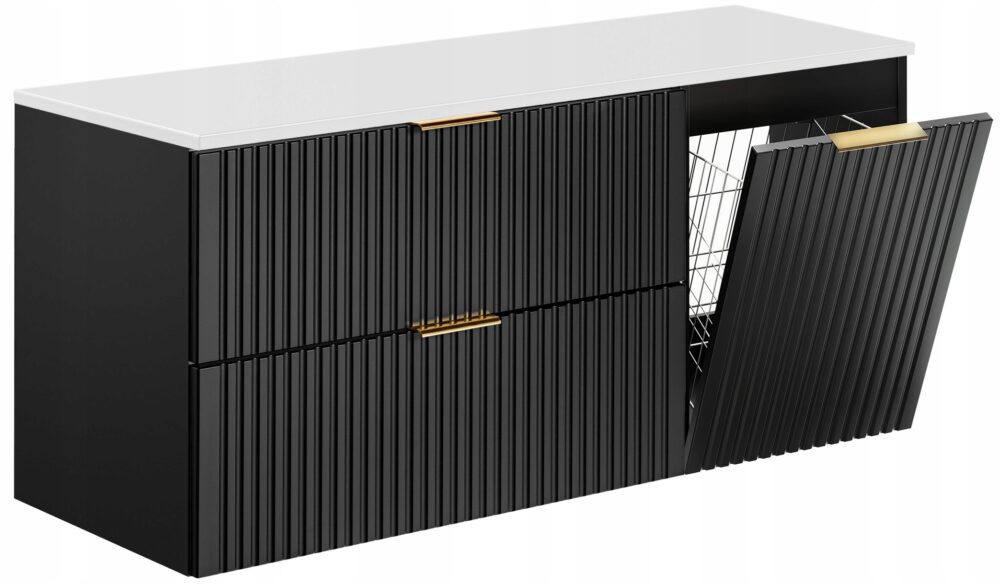 Szafka łazienkowa ADEL 120 cm w kolorze czarnym z czarnym blatem to odważna, stylowa propozycja do nowoczesnych i minimalistycznych łazienek. Czerń we wszystkich elementach – zarówno frontach, jak i blacie – tworzy spójną, elegancką całość, która przyciąga wzrok i nadaje wnętrzu luksusowy charakter. Pionowe ryflowania na frontach dodają całości wyrafinowanego detalu, a matowe wykończenie podkreśla nowoczesny styl.