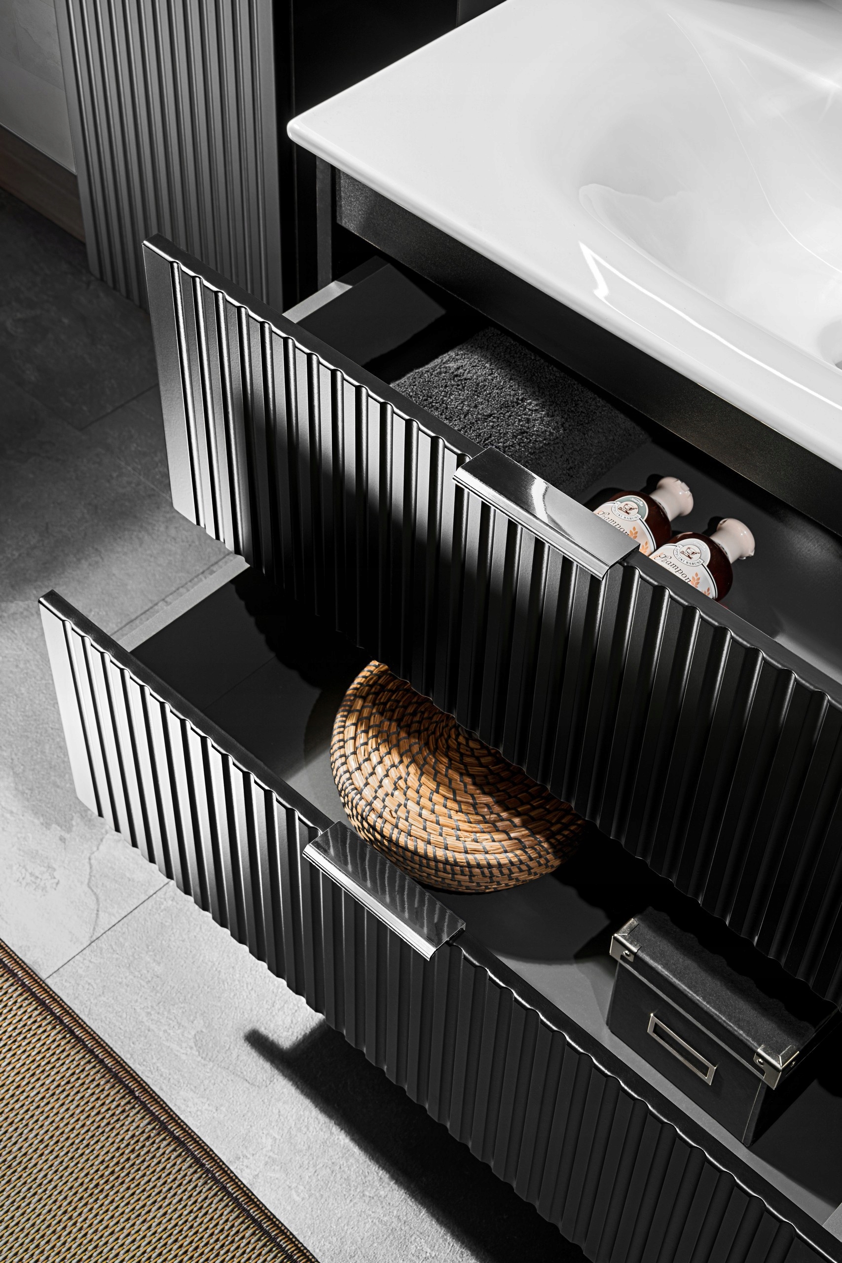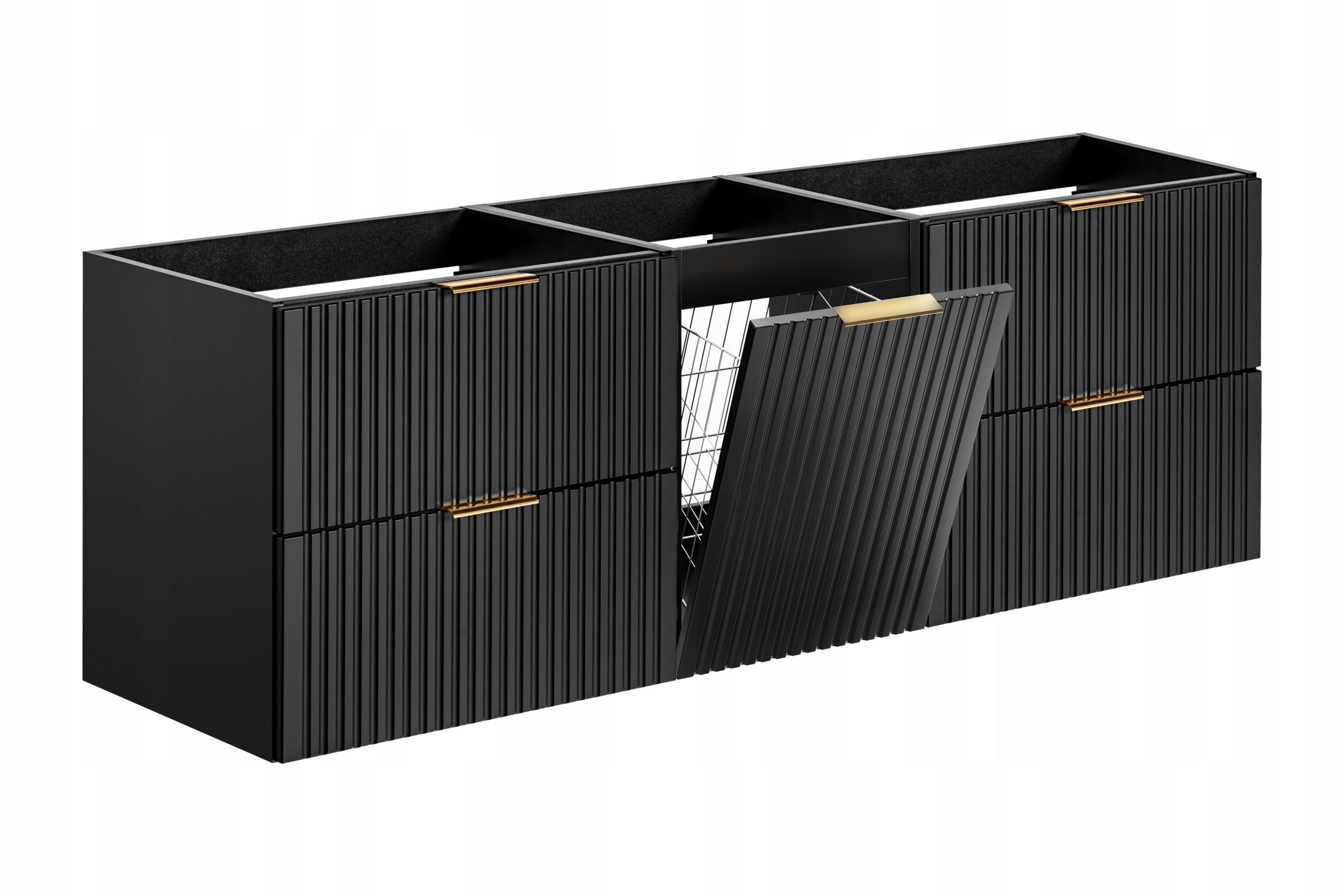 Zestaw składa się z dwóch szafek 60 cm wyposażonych w pojemne szuflady oraz centralnej szafki 40 cm z koszem na pranie, który umożliwia wygodne i estetyczne przechowywanie bielizny. Układ 60–40–60 zapewnia dużą powierzchnię użytkową oraz symetryczny wygląd, idealny do większych łazienek.