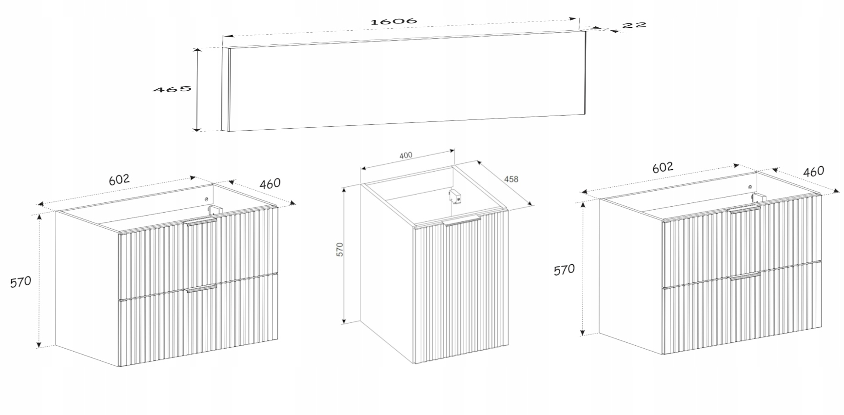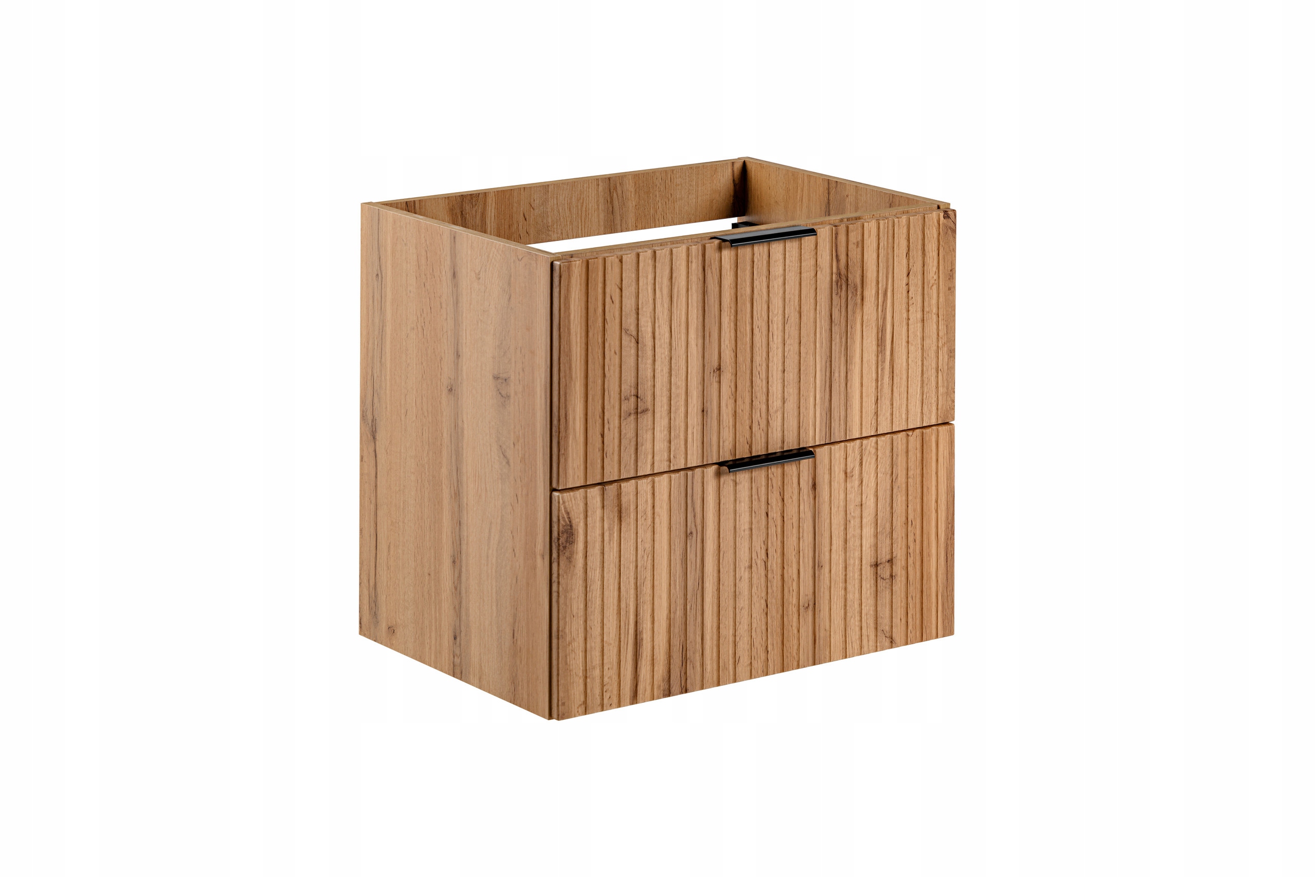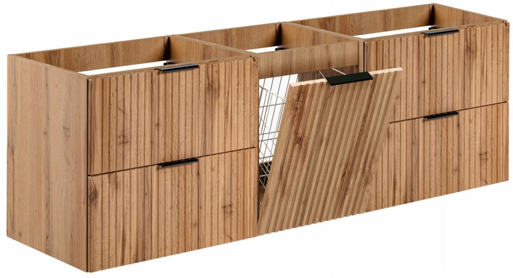 Zestaw tworzą dwie szafki 60 cm z pojemnymi szufladami oraz szafka 40 cm z koszem na pranie, który pozwala utrzymać porządek i estetycznie ukryć brudną bieliznę. Wszystkie szafki wyposażone są w frezowane uchwyty oraz system SOFT CLOSE, który zapewnia komfortowe i bezgłośne użytkowanie. Układ 60–40–60 jest uniwersalny, dzięki czemu możesz swobodnie ustawić meble w wybranej konfiguracji. Blat w kolorze dąb wotan tworzy spójną całość z frontami, stanowiąc stabilną podstawę pod umywalkę nablatową. Dodatkowym atutem zestawu są trzy warianty uchwytów – czarny, złoty i chromowany – które pozwalają na dopasowanie detali do stylu całej łazienki.