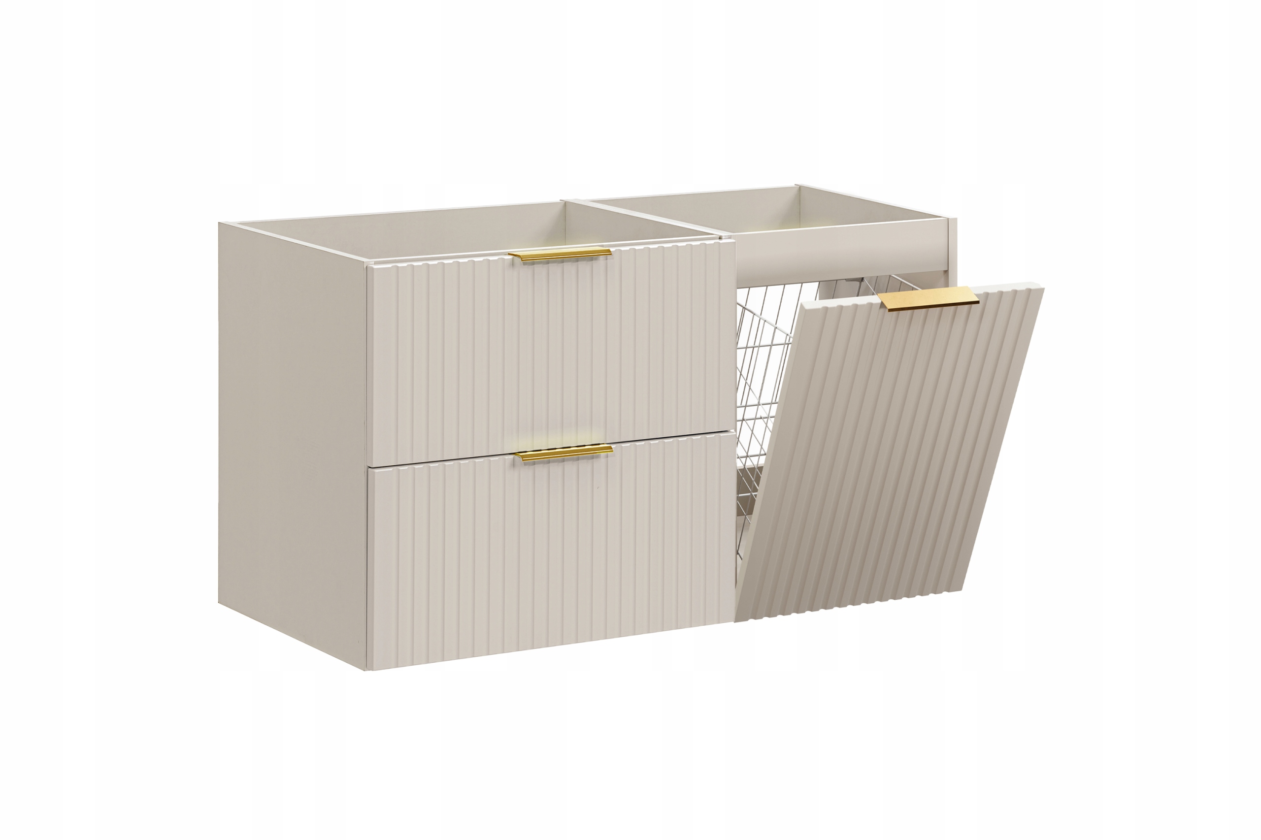 Zestaw składa się z szafki 60 cm z dwiema pojemnymi szufladami oraz szafki 40 cm z koszem na pranie w zabudowie. Obie szafki posiadają zintegrowane uchwyty i system SOFT CLOSE, co gwarantuje wysoki komfort codziennego użytkowania. Kolejność elementów można dowolnie zmieniać – układ jest uniwersalny. Blat dąb wotan wprowadza naturalny akcent i doskonale komponuje się z kaszmirowym frontem. Do zestawu dołączamy trzy kolory uchwytów: czarny, złoty i chromowany, które pozwolą spójnie dopasować całość do wybranych dodatków i armatury.