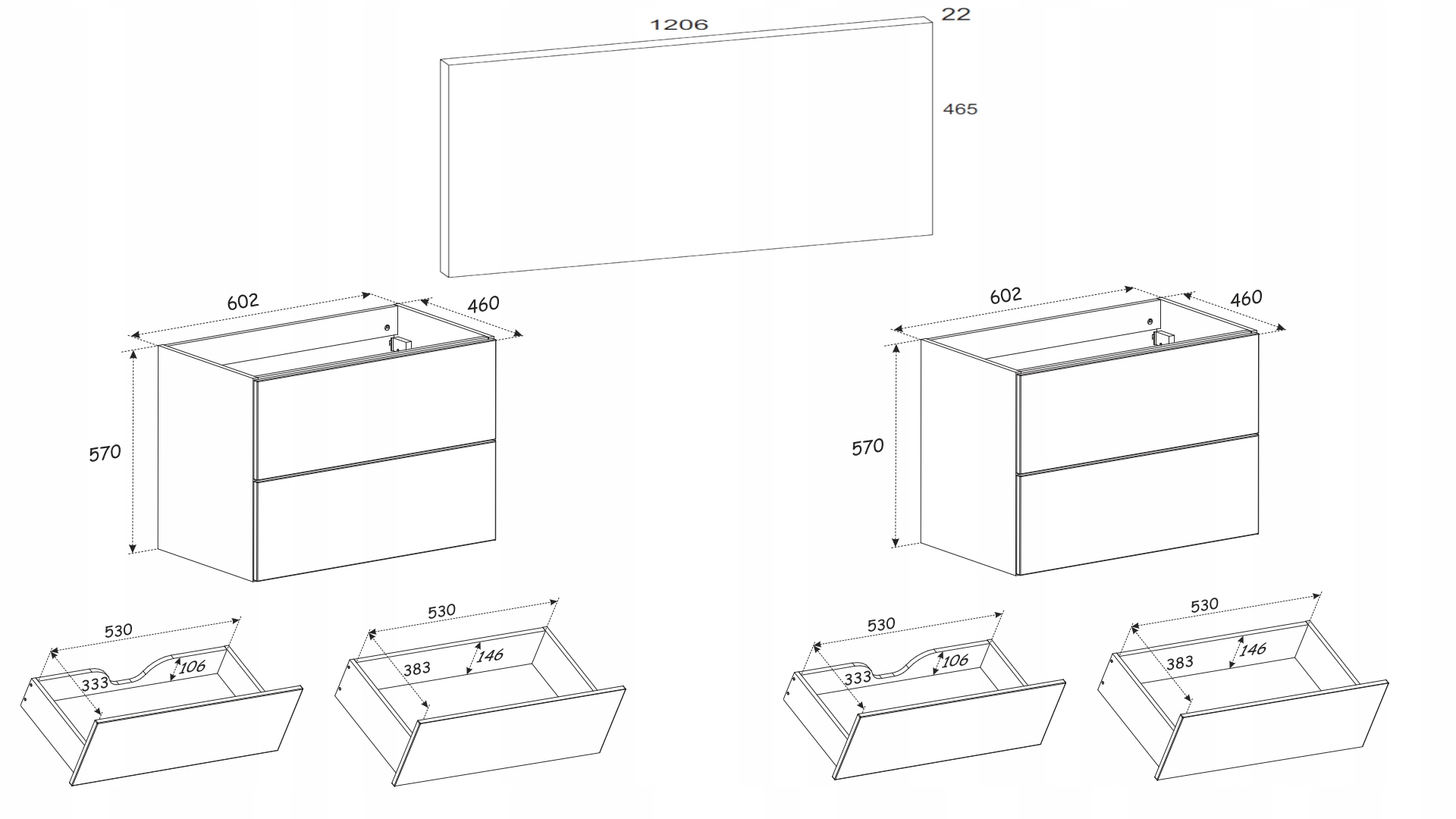Zestaw składa się z dwóch wiszących szafek po 60 cm szerokości, połączonych wspólnym blatem oraz z dwóch ceramicznych umywalek w odcieniu cappuccino. To praktyczne i estetyczne rozwiązanie dla większych przestrzeni – oferuje cztery pojemne szuflady z systemem cichego domykania, które pomieszczą wszystkie niezbędne akcesoria.