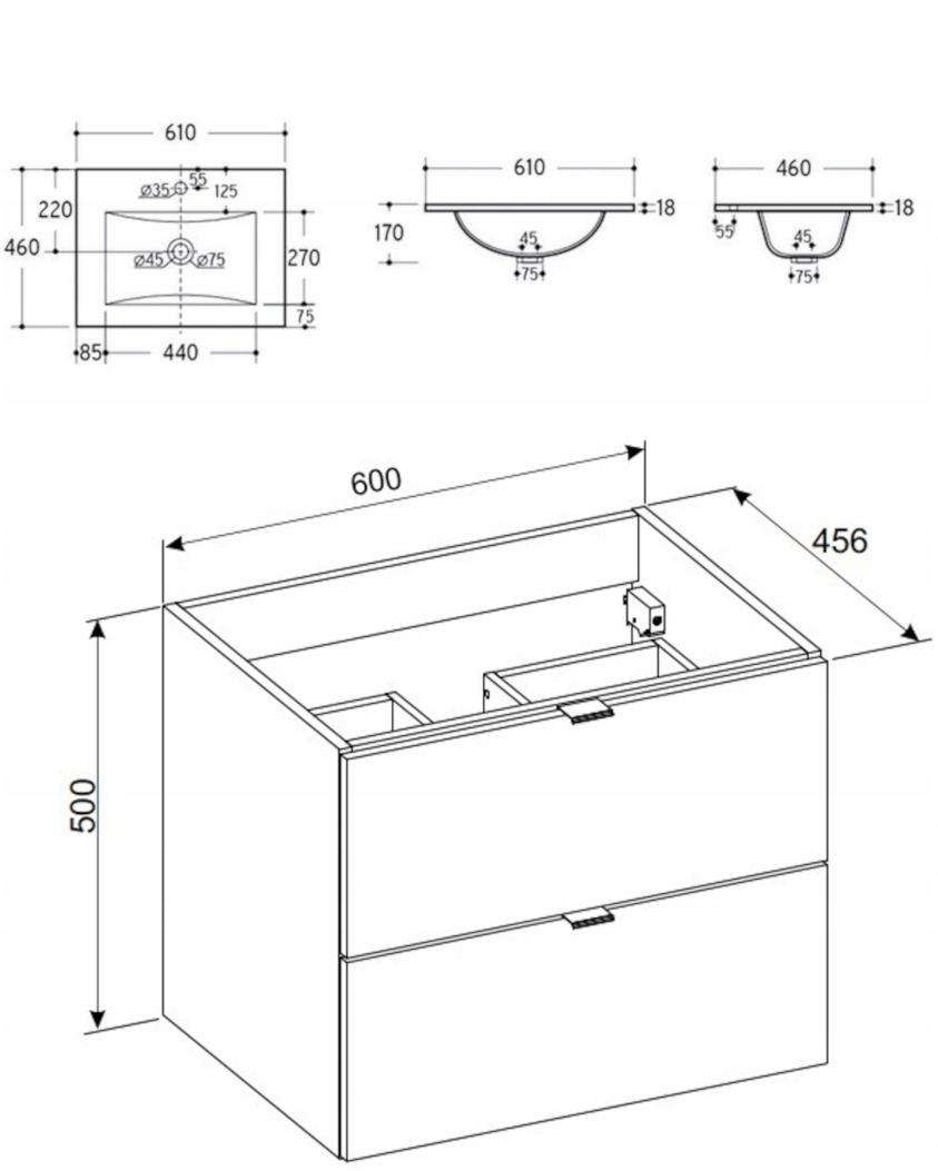 Szafka wyposażona jest w dwie pojemne szuflady, które pozwalają na wygodne przechowywanie kosmetyków, środków czystości i wszelkich niezbędnych akcesoriów. Zastosowany system cichego i płynnego domykania (SOFT CLOSE) zapewnia nie tylko wysoki komfort użytkowania, ale też zwiększa trwałość mebla, chroniąc go przed uszkodzeniami mechanicznymi.