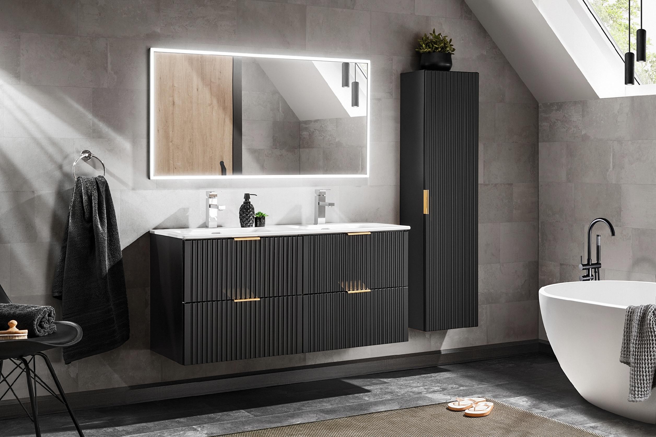 Szafka łazienkowa ADEL BLACK to elegancka propozycja, która łączy nowoczesny design z wysoką funkcjonalnością. Czarny matowy kolor i ryflowane fronty nadają meblom wyjątkowy charakter, doskonale komponujący się zarówno w minimalistycznych, jak i klasycznych aranżacjach.
