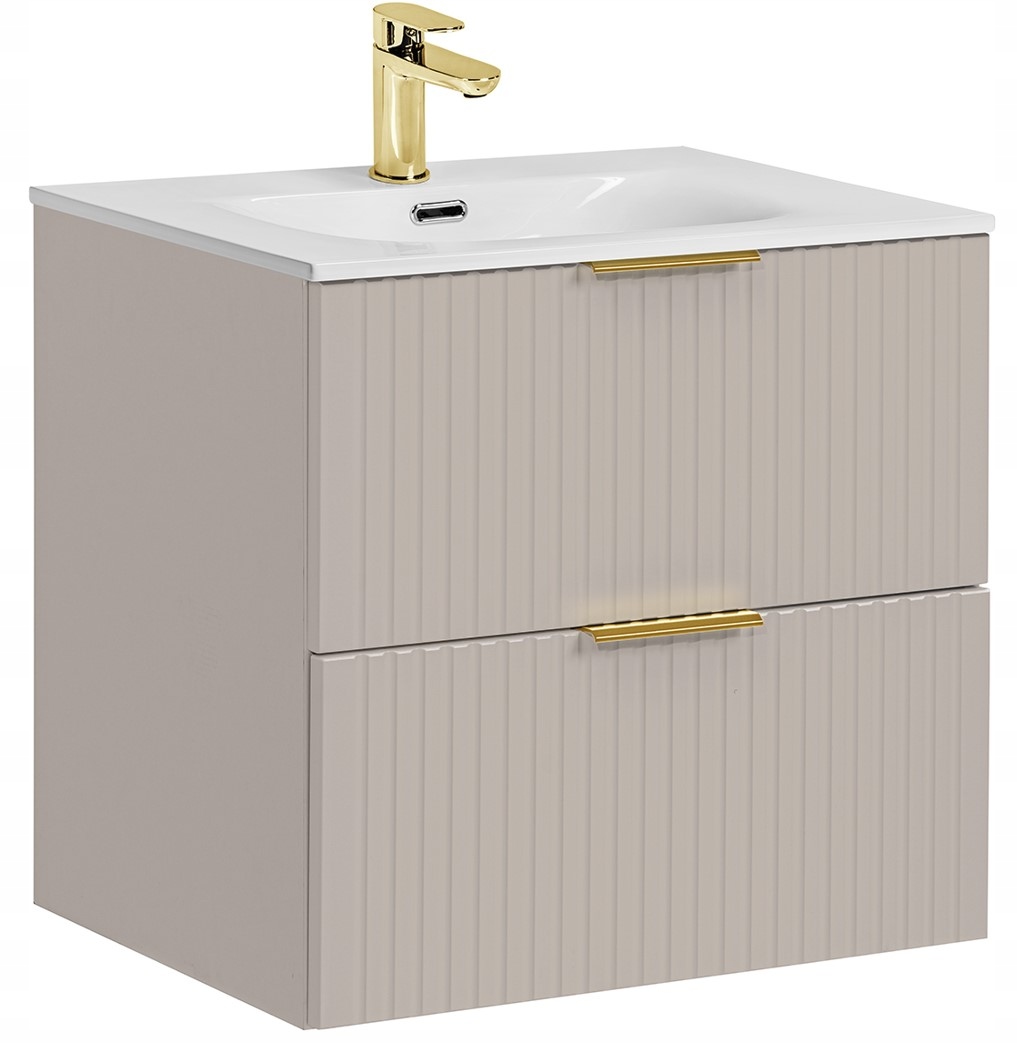 Kaszmirowa szafka łazienkowa ADEL to elegancka i funkcjonalna szafka wisząca z umywalką, doskonała do nowoczesnych i klasycznych wnętrz. Wyposażona w dwie przestronne szuflady z ryflowanymi frontami i systemem cichego domyku SOFT CLOSE, zapewnia wygodne przechowywanie i łatwy dostęp do potrzebnych akcesoriów. Dostępna jest w kaszmirowym wykończeniu, a zestaw obejmuje ceramiczną umywalkę w białym kolorze. Dzięki trzem opcjom uchwytów – czarnemu, chromowanemu i złotemu – szafka łatwo dopasowuje się do różnych stylów i dodatków w łazience.