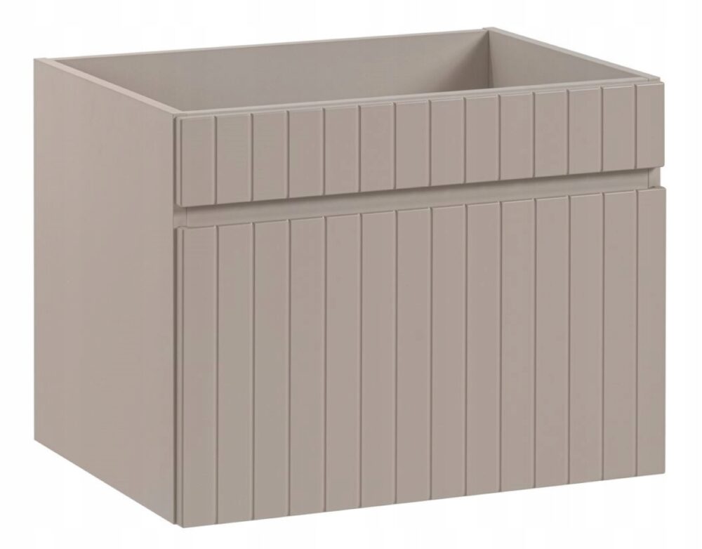 Oferujemy KASZMIROWĄ Szafkę Łazienkową z umywalką o szerokości 60 cm, która łączy elegancję z nowoczesnym stylem, idealna do każdej łazienki. Jej wyjątkowe pionowe frezowania we frontach wprowadzają subtelny ruch i oryginalność, podkreślając współczesny design.