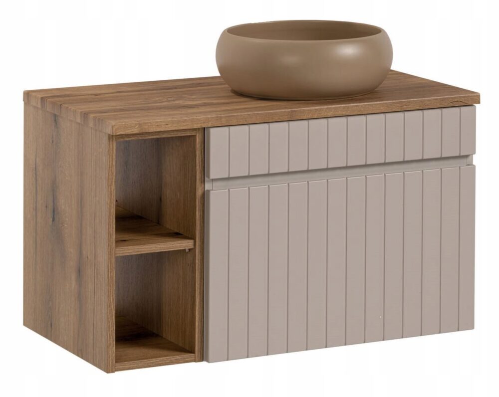 Odkryj elegancję i nowoczesność z KASZMIROWĄ Szafką Łazienkową z umywalką, idealną do każdej łazienki. Jej wyjątkowy design, charakteryzujący się pionowymi frezowaniami, wprowadza subtelny ruch i dynamikę do wnętrza, nadając mu niepowtarzalny charakter.