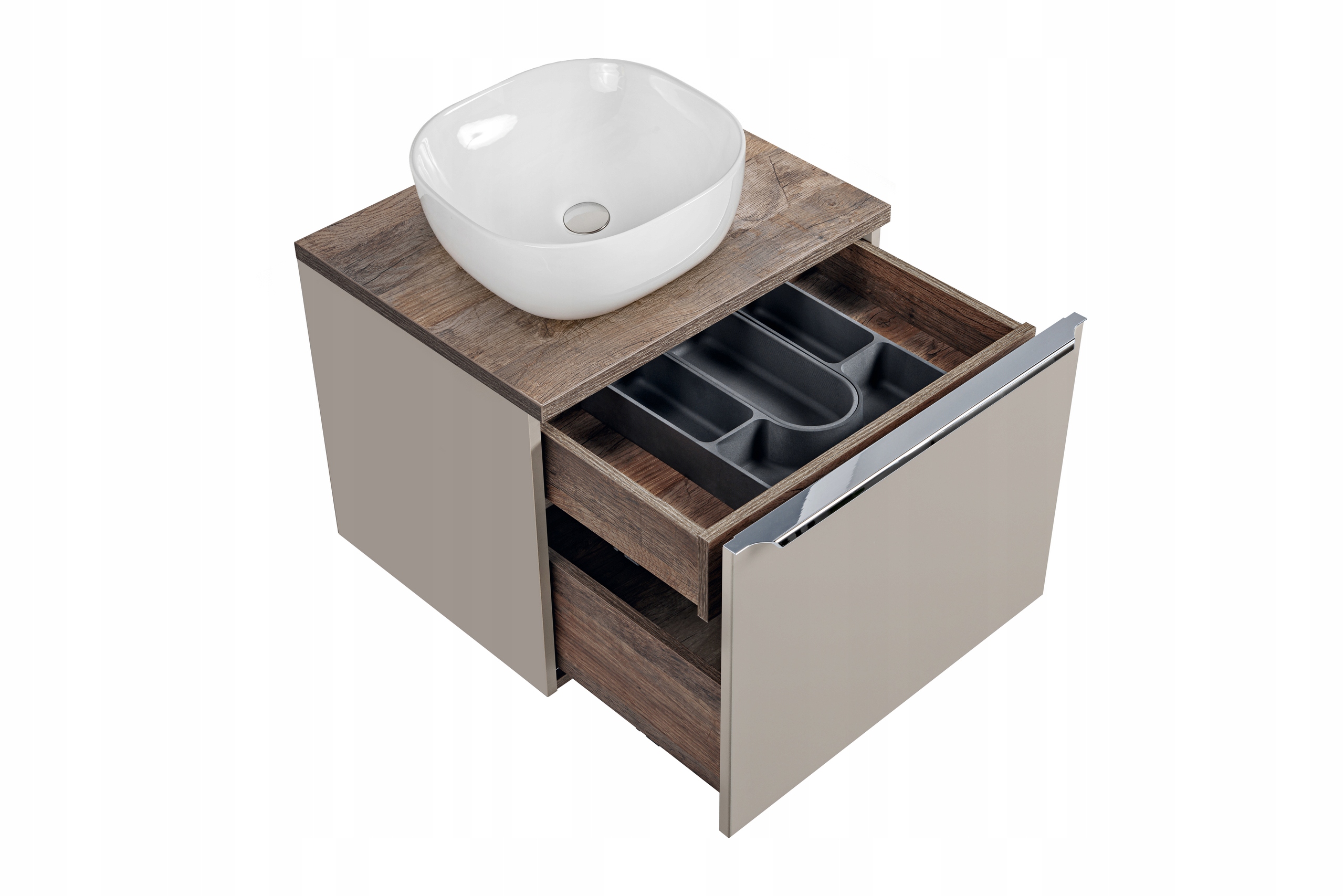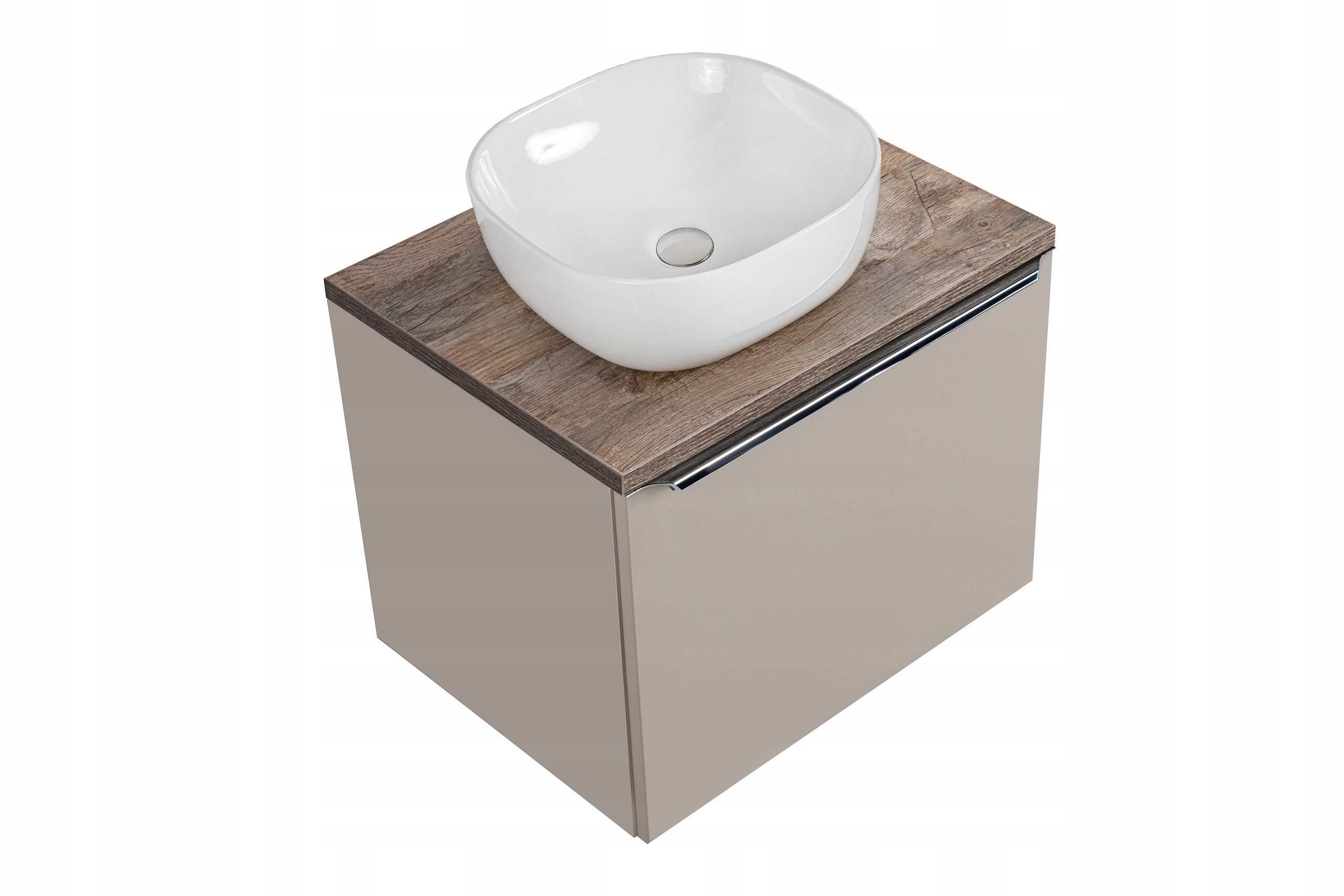 Kolekcja SANTA FE TAUPE zachwyca nowoczesnym stylem i funkcjonalnością, doskonale pasując do współczesnych łazienek. Szafka pod umywalkę o szerokości 60 cm w kolorze taupe z chromowanymi uchwytami, stanowi eleganckie połączenie estetyki i praktyczności. Wyposażona w pojemną szufladę oraz dodatkową wewnętrzną, pozwala na organizację przestrzeni, a dodany organizer ułatwia przechowywanie najpotrzebniejszych rzeczy. Całość dopełnia blat Santa Fe Oak idealnie komponujący się z ceramiczną umywalką, która dodaje subtelnej elegancji.