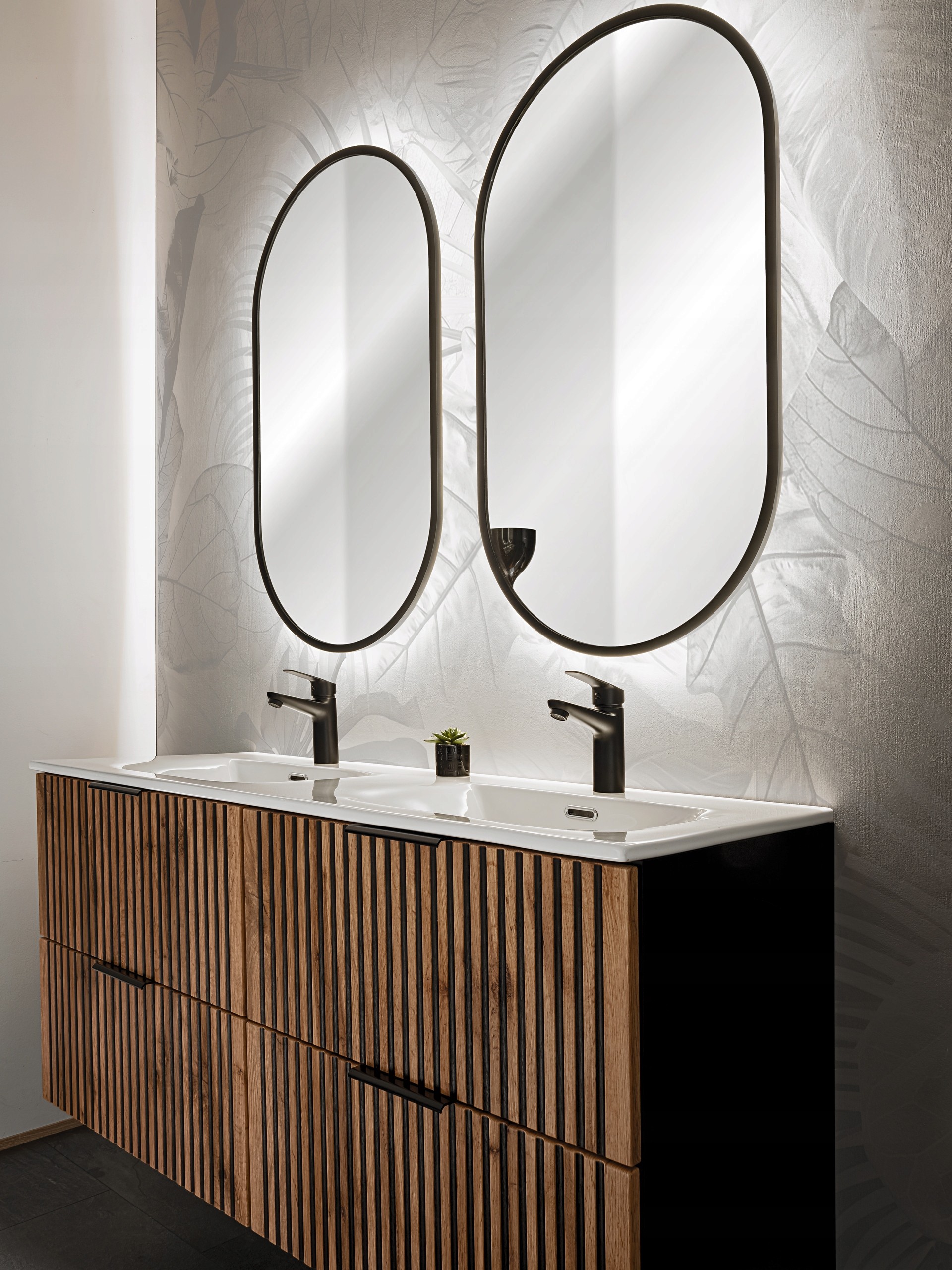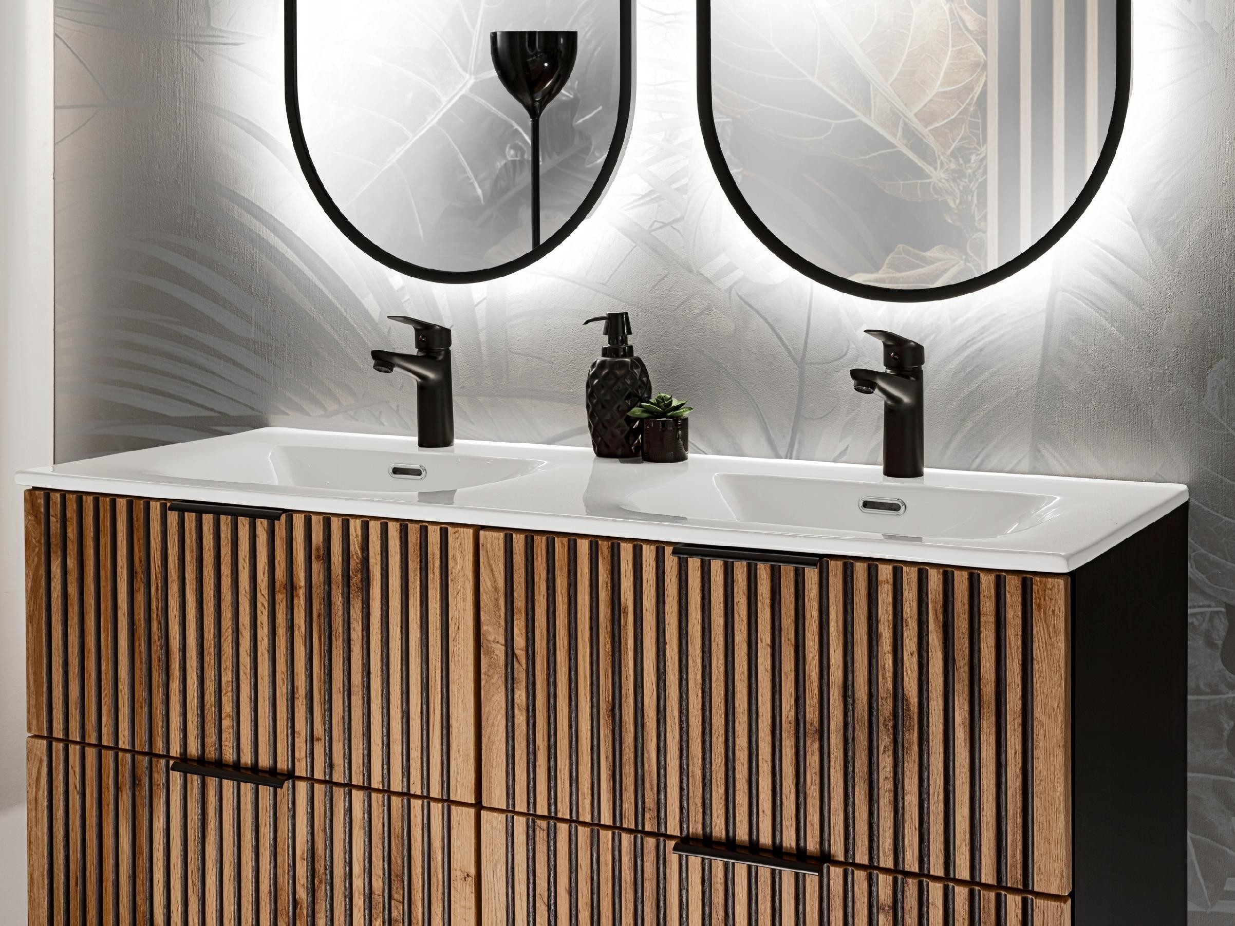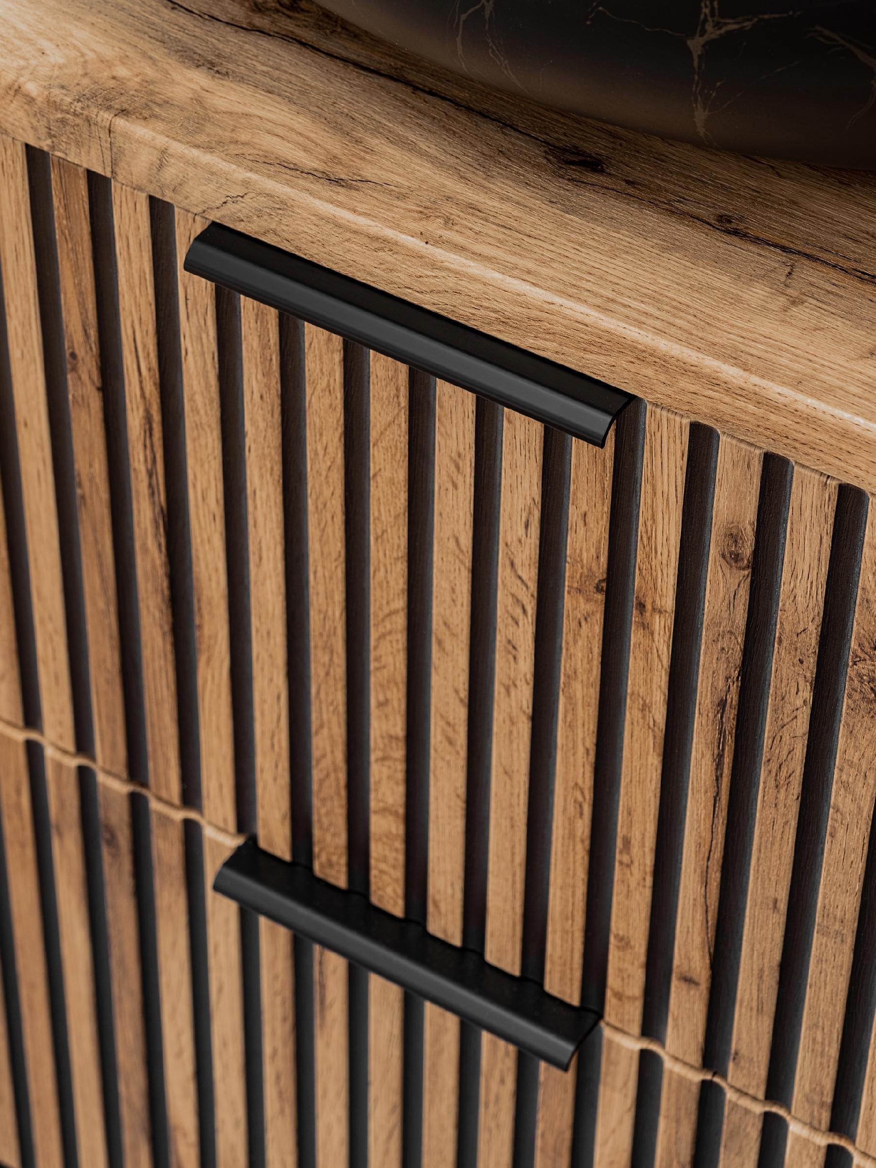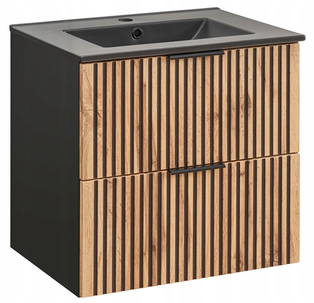 Kolekcja XILO prezentuje szafkę łazienkową z czarną umywalką, idealną dla miłośników eleganckiego designu i funkcjonalnych rozwiązań. Czarna, matowa szafka o szerokości 60 cm z ryflowanymi frontami w kolorze Dąb Wotan stanowi luksusowy akcent w każdej łazience. Charakterystyczne ryflowane detale dodają jej wyjątkowego stylu, a wyrazisty kontrast czerni i drewna tworzy nowoczesny, a zarazem przytulny efekt.