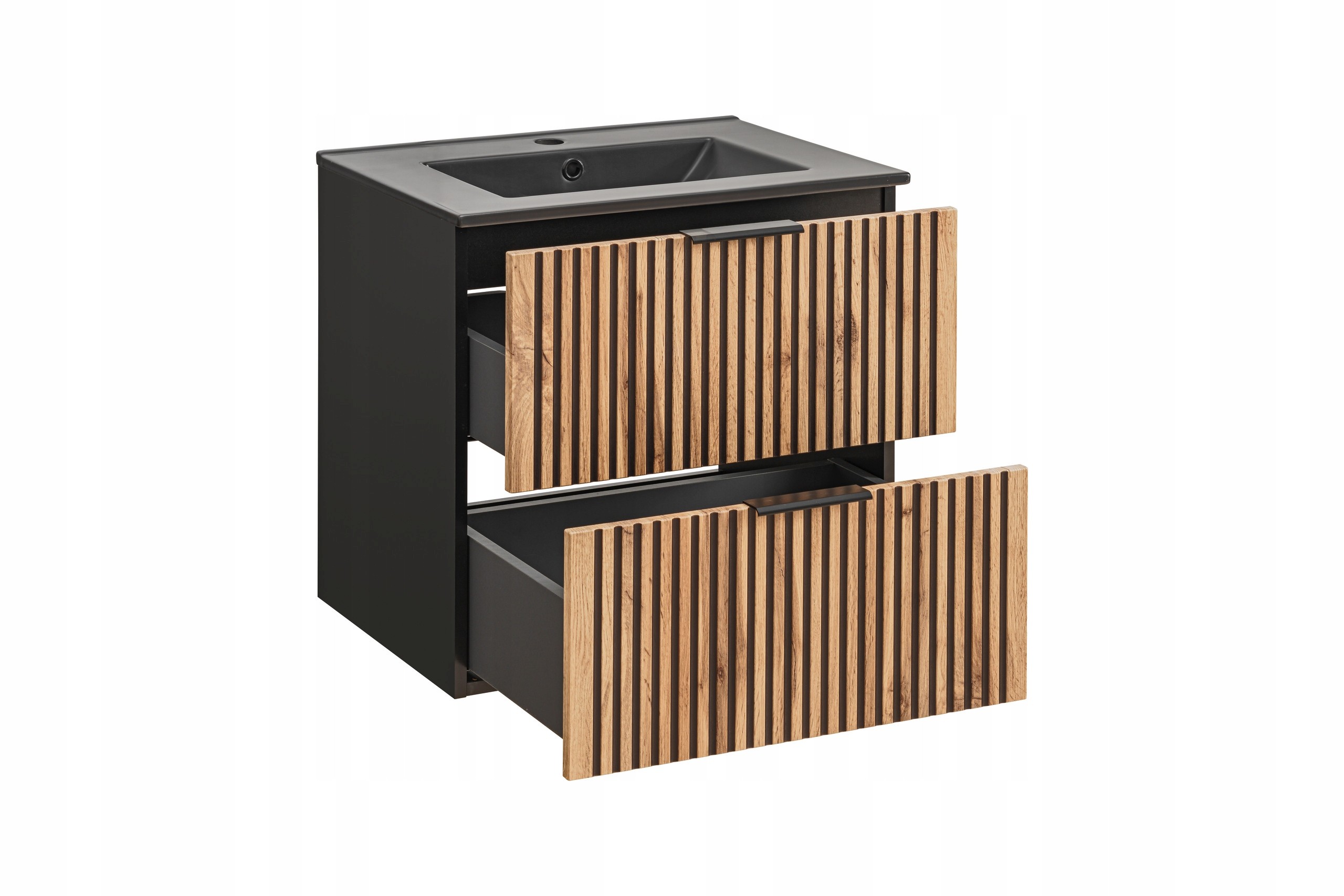 Szafka wyposażona jest w dwie pojemne szuflady z systemem cichego domyku (SOFT CLOSE), co zapewnia komfort i płynne użytkowanie. Uchwyty krawędziowe podkreślają nowoczesny charakter mebla, a solidna konstrukcja gwarantuje trwałość. W zestawie znajduje się umywalka o szerokości 60 cm z wysokiej jakości ceramiki sanitarnej w eleganckiej czerni, doskonale dopasowana do blatu w kolorze Dąb Wotan.