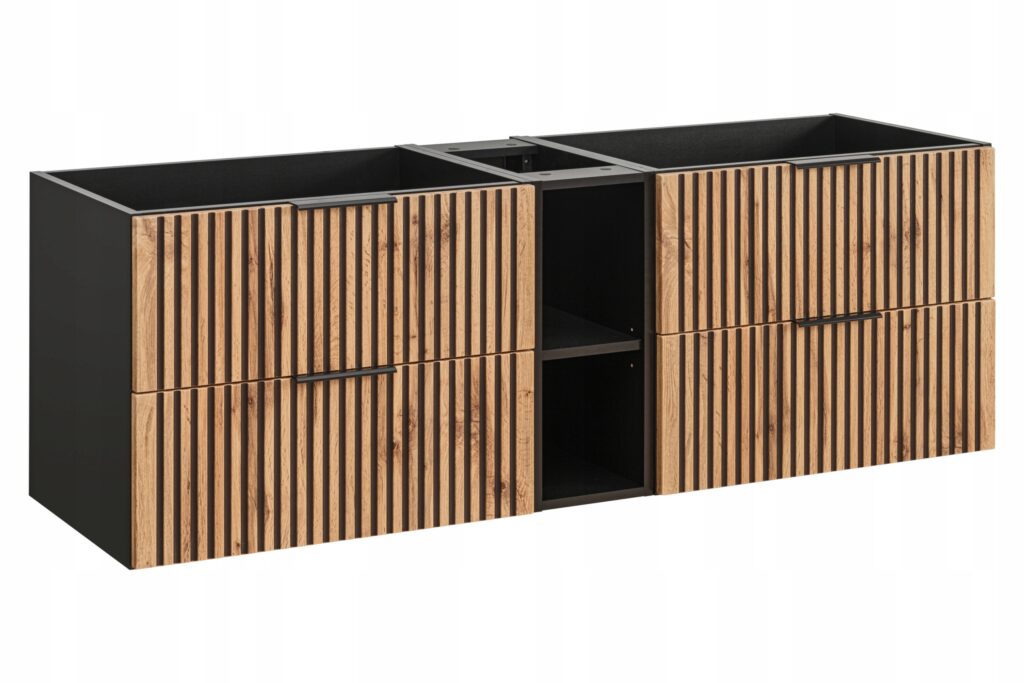 Elegancka, czarna wisząca szafka z kolekcji XILO o szerokości 80 cm łączy wyrazisty design i funkcjonalność. Wyjątkowe połączenie czarnego matu z naturalnymi słojami Dębu Wotan oraz ryflowanymi frontami tworzy nowoczesny akcent, który doskonale podkreśli charakter każdej łazienki. Szafka wyposażona jest w przestronną główną szufladę oraz dodatkową wewnętrzną szufladę, co zapewnia idealne miejsce na przechowywanie, a system SOFT CLOSE umożliwia ciche domykanie, zwiększając komfort użytkowania.