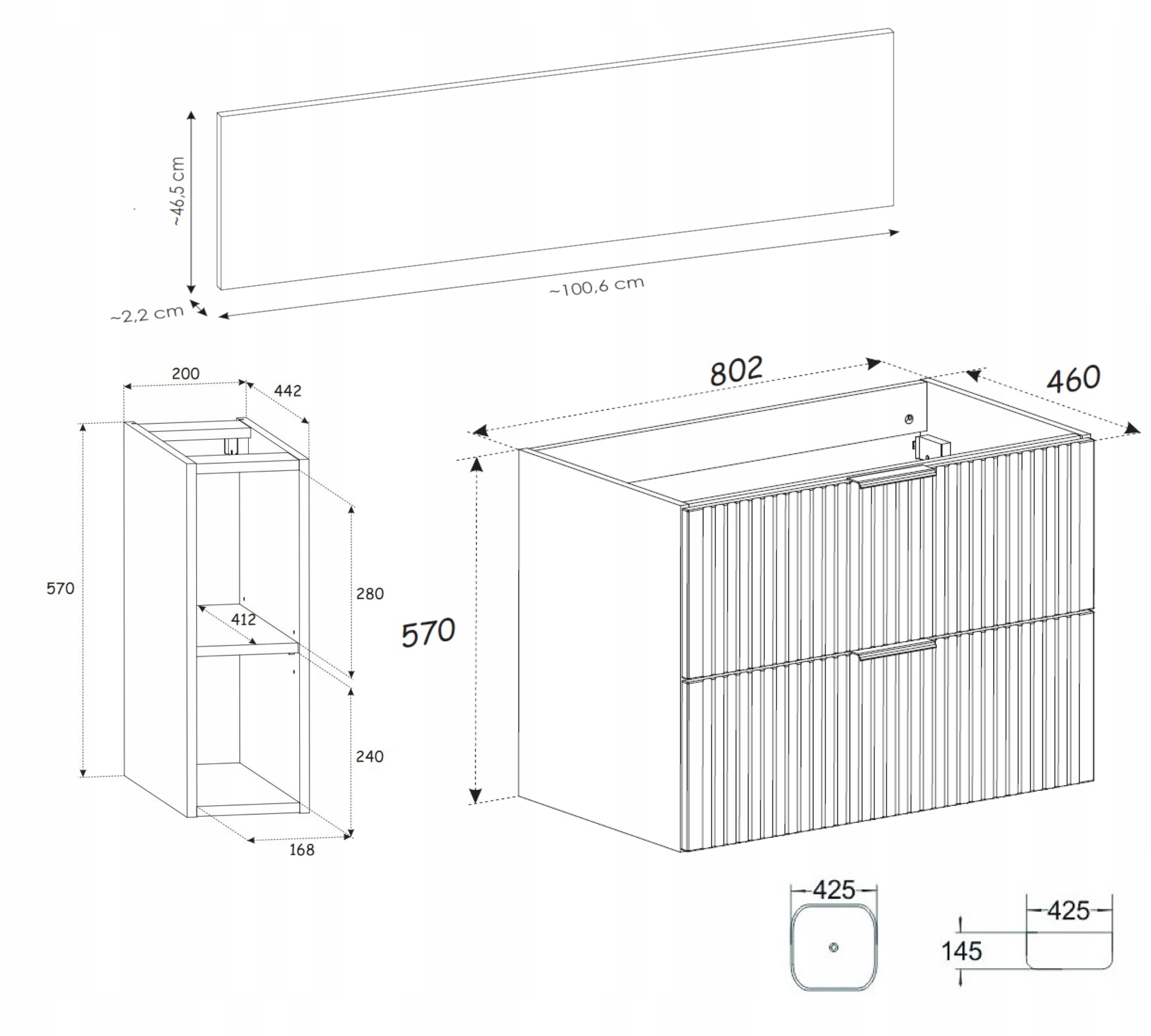 Zestaw umożliwia pełną personalizację dzięki trzem opcjom kolorystycznym uchwytów: czarny, chrom oraz złoty połysk. Meble wiszące nie tylko prezentują się lekko, ale także ułatwiają utrzymanie czystości w łazience.