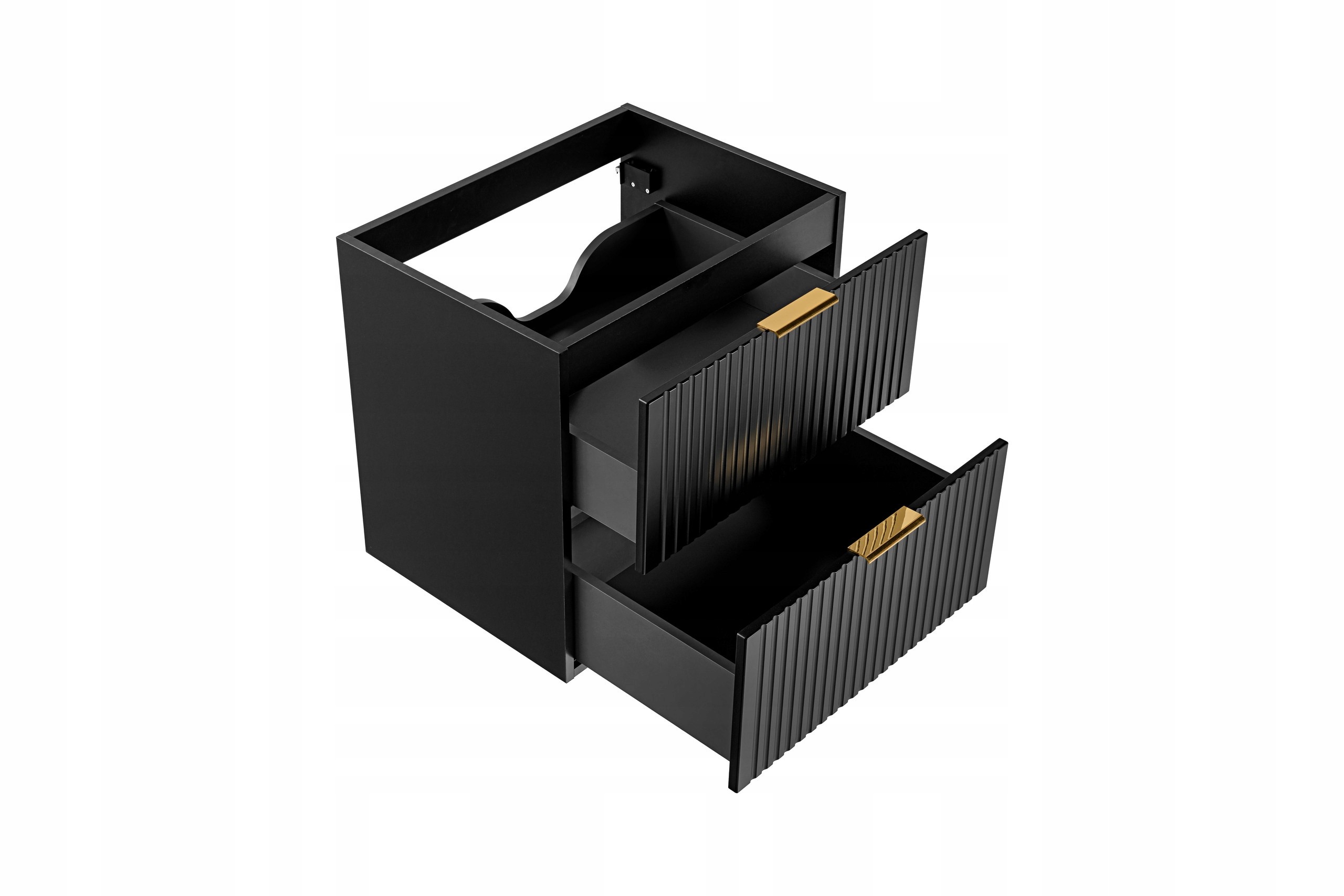 Szafka łazienkowa ADEL BLACK to elegancka propozycja, która wprowadza nowoczesny styl i funkcjonalność do każdej łazienki. Ryflowane fronty szuflad w połączeniu z czarnym, matowym wykończeniem tworzą wyjątkowy design, idealnie komponujący się zarówno w minimalistycznych, jak i bardziej klasycznych wnętrzach. Dzięki wiszącej konstrukcji, mebel nie tylko prezentuje się lekko, ale również ułatwia utrzymanie porządku.