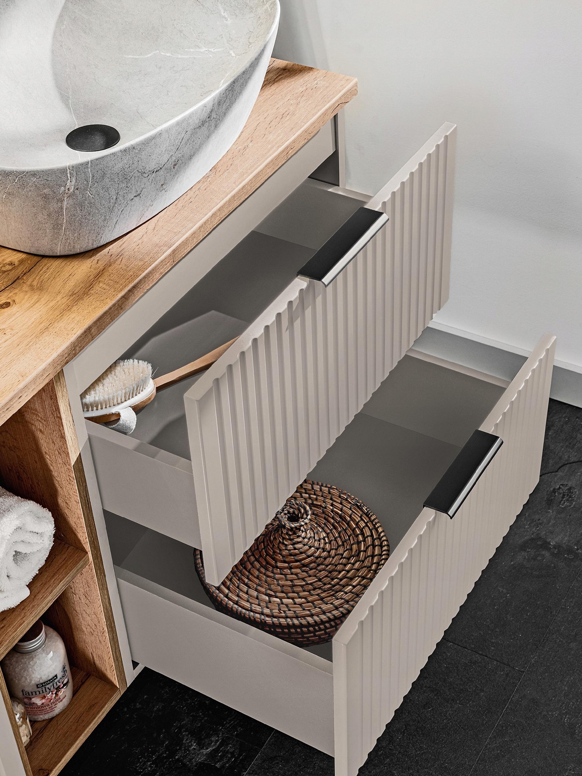 Blat i ryflowane fronty dodają oryginalnego charakteru, który przyciąga wzrok, a wysoka jakość wykonania gwarantuje trwałość.