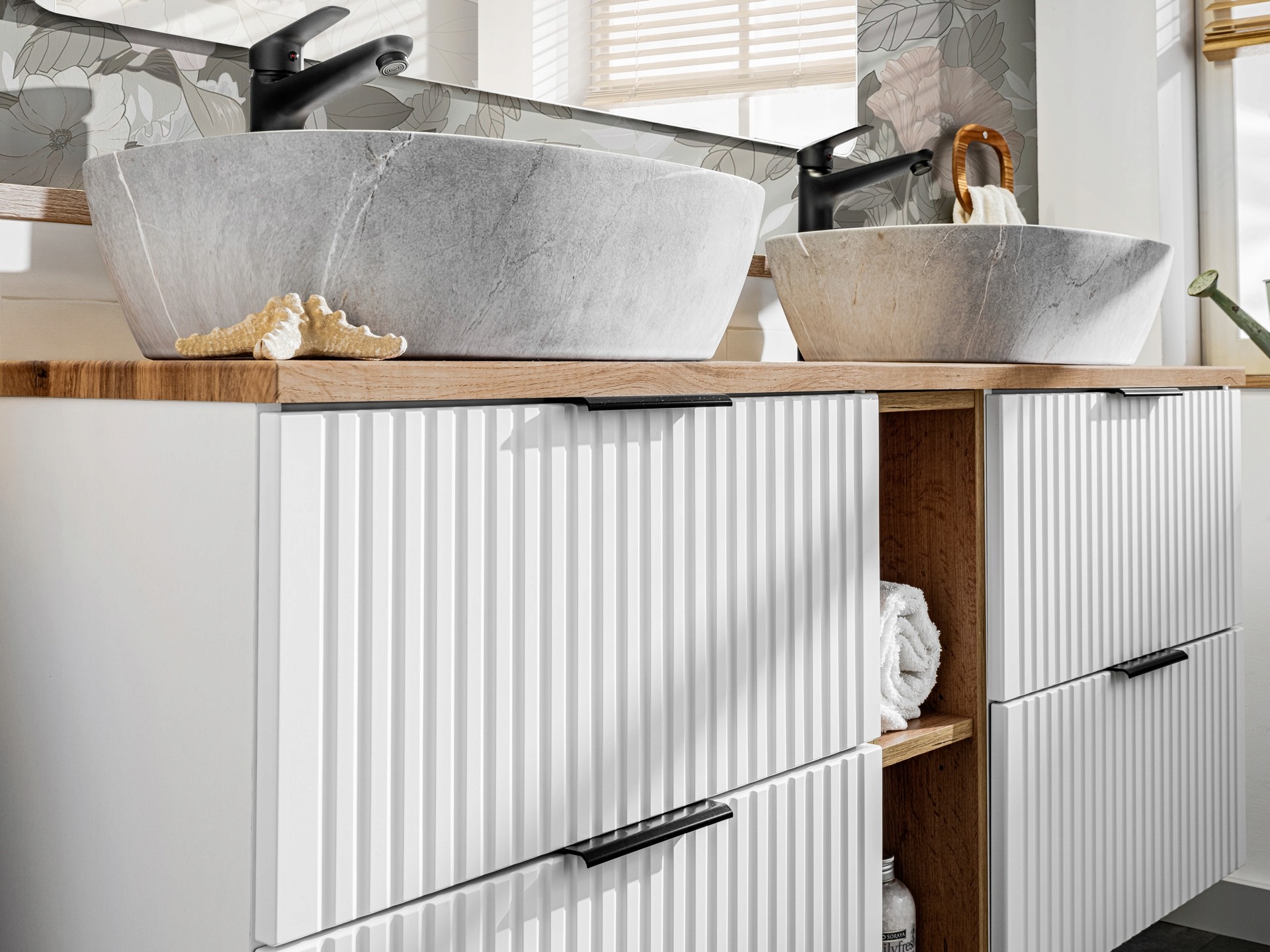 Uzupełnieniem zestawu jest regał w kolorze dąb Wotan, który harmonijnie współgra z blatem, wprowadzając naturalny, przytulny akcent. Możliwość wyboru uchwytów w trzech wariantach – złotym, chromowanym lub czarnym – pozwala na pełną personalizację, dzięki czemu szafka idealnie wpasuje się w każdą łazienkę, niezależnie od stylu aranżacji.