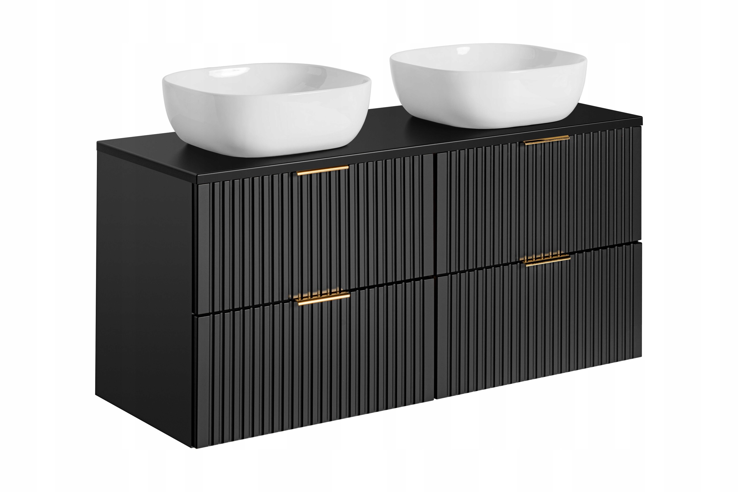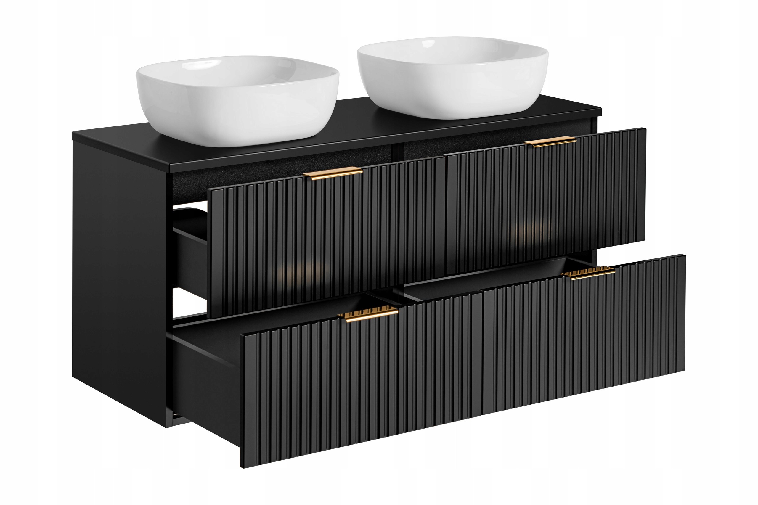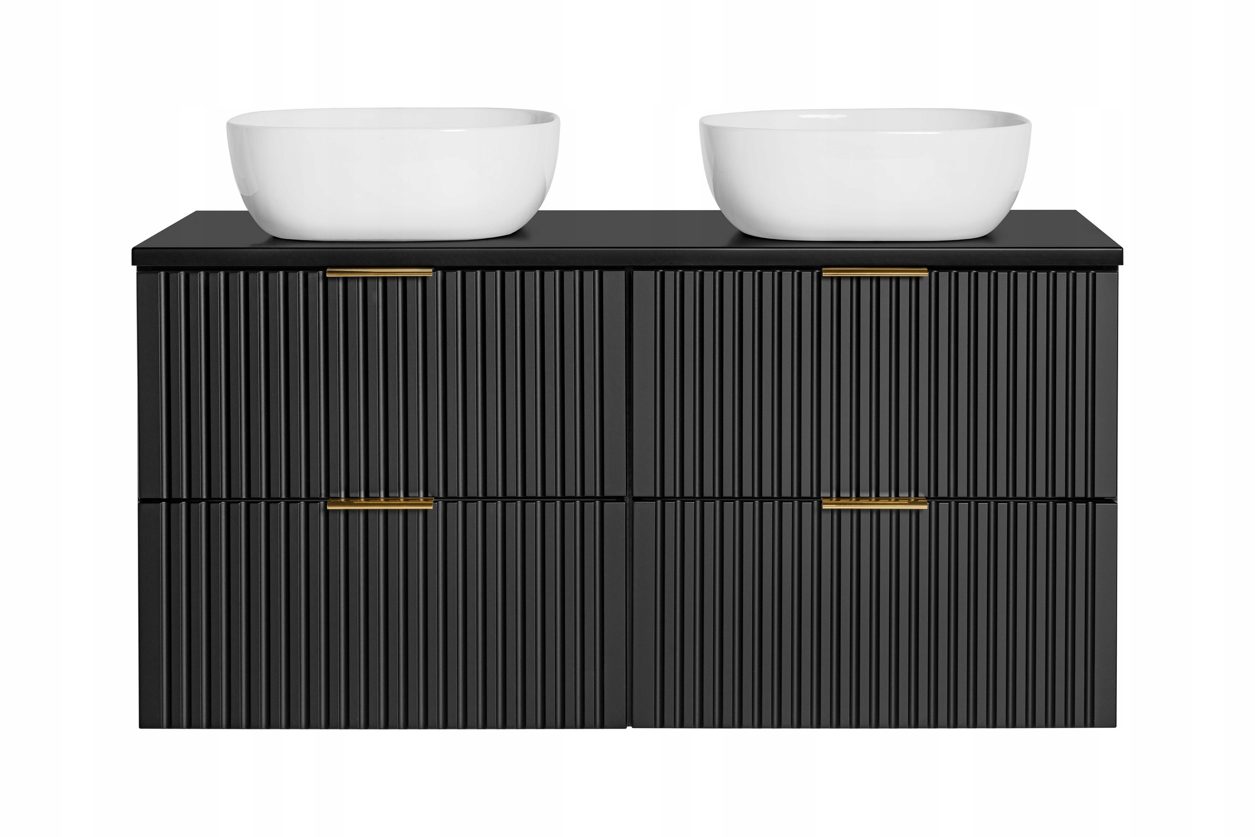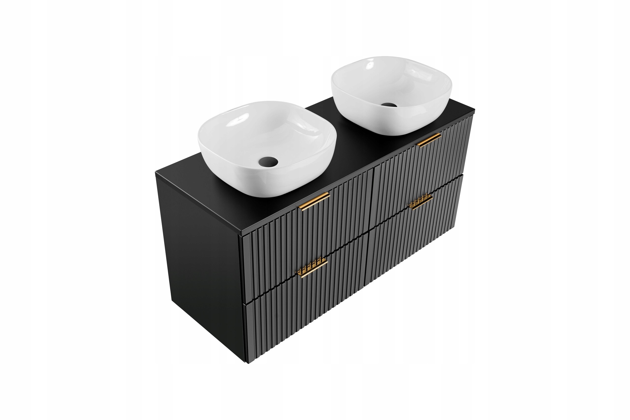 Blat w kolorze czarnym stanowi eleganckie i spójne wykończenie zestawu, tworząc solidną powierzchnię pod umywalki nablatowe. Dwie ceramiczne umywalki o kompaktowych wymiarach doskonale wpisują się w nowoczesne aranżacje, zapewniając wygodę codziennego użytkowania.