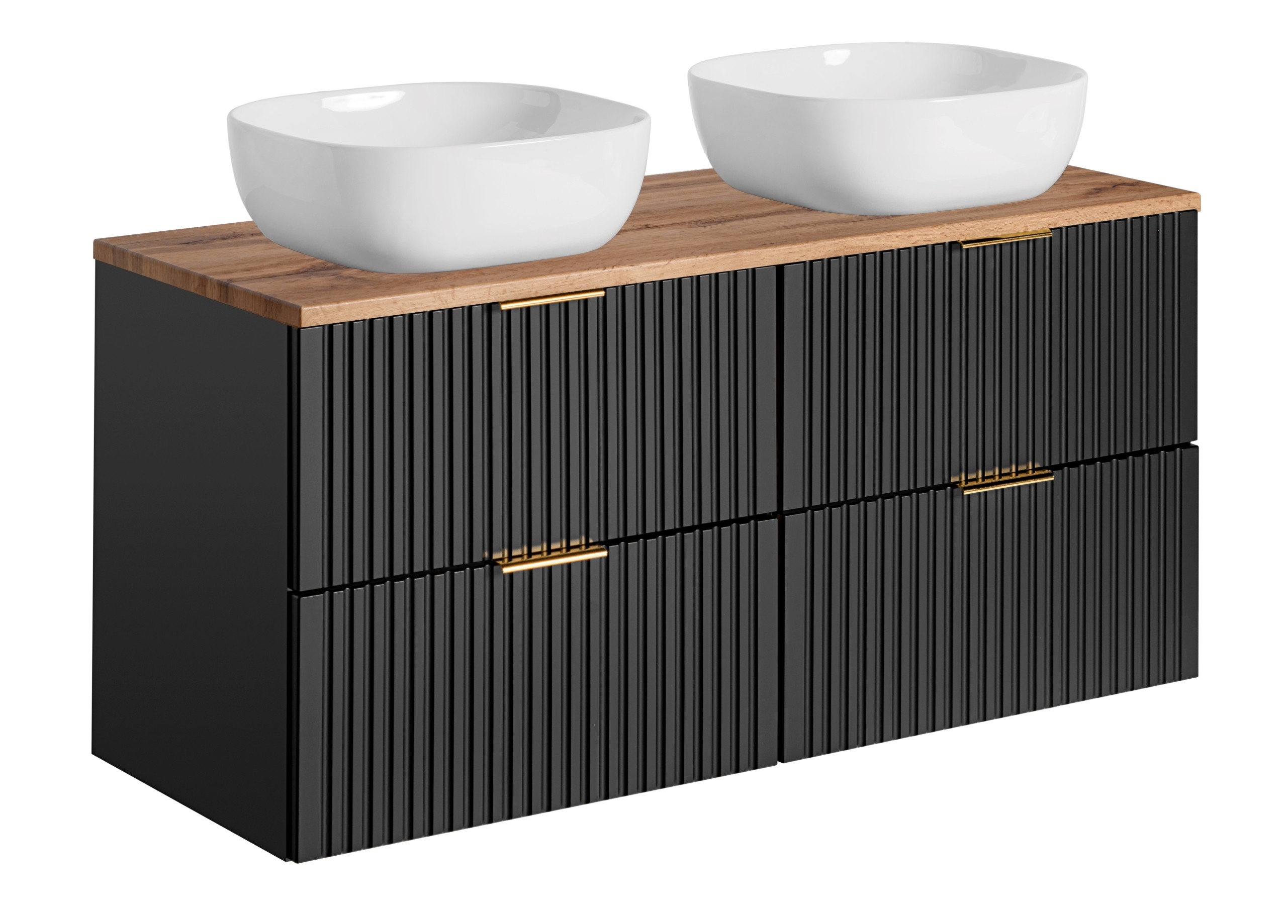 Szafka łazienkowa ADEL z podwójnymi umywalkami to elegancka propozycja dla osób ceniących styl i funkcjonalność. Dzięki czarnemu, matowemu wykończeniu i ryflowanym frontom, ta wisząca szafka wprowadza do łazienki nowoczesny charakter, który harmonijnie współgra z różnymi stylami aranżacji.