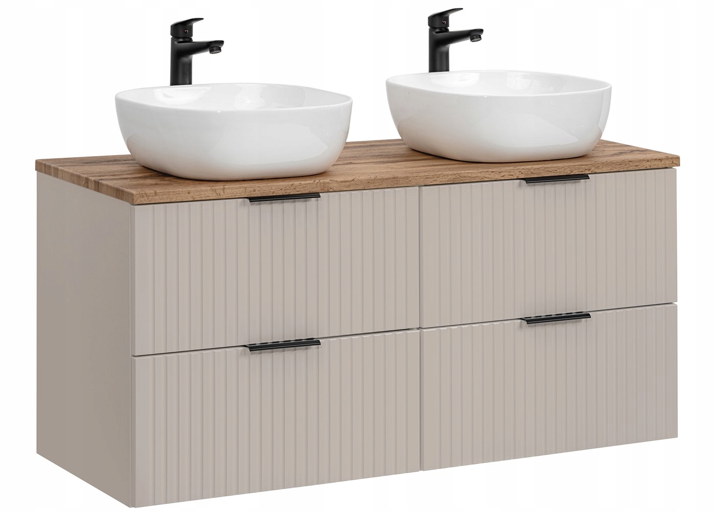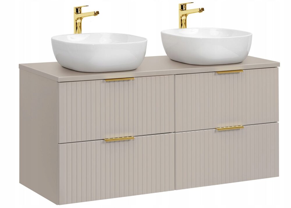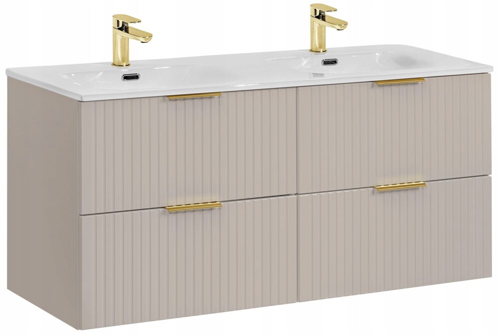 Szafka wisząca ADEL to doskonałe rozwiązanie do stylowej i przestronnej łazienki. Z dwoma umywalkami oraz przestronnym blatem w kolorze dąb wotan, oferuje zarówno elegancję, jak i funkcjonalność. Jej ryflowane fronty w kaszmirowym odcieniu dodają wyjątkowego charakteru, a dostępność czterech szuflad ułatwia przechowywanie wszystkich niezbędnych akcesoriów łazienkowych.